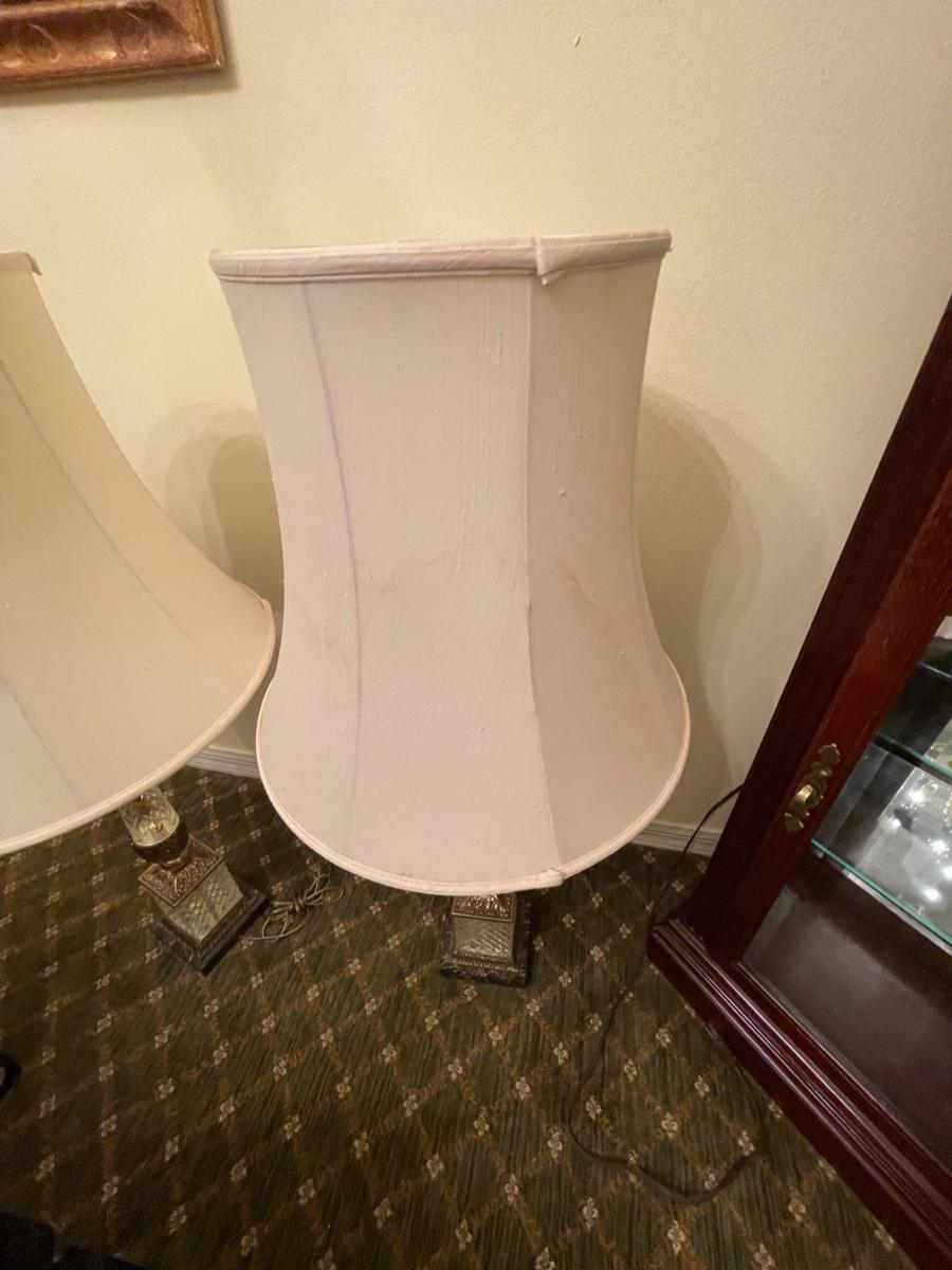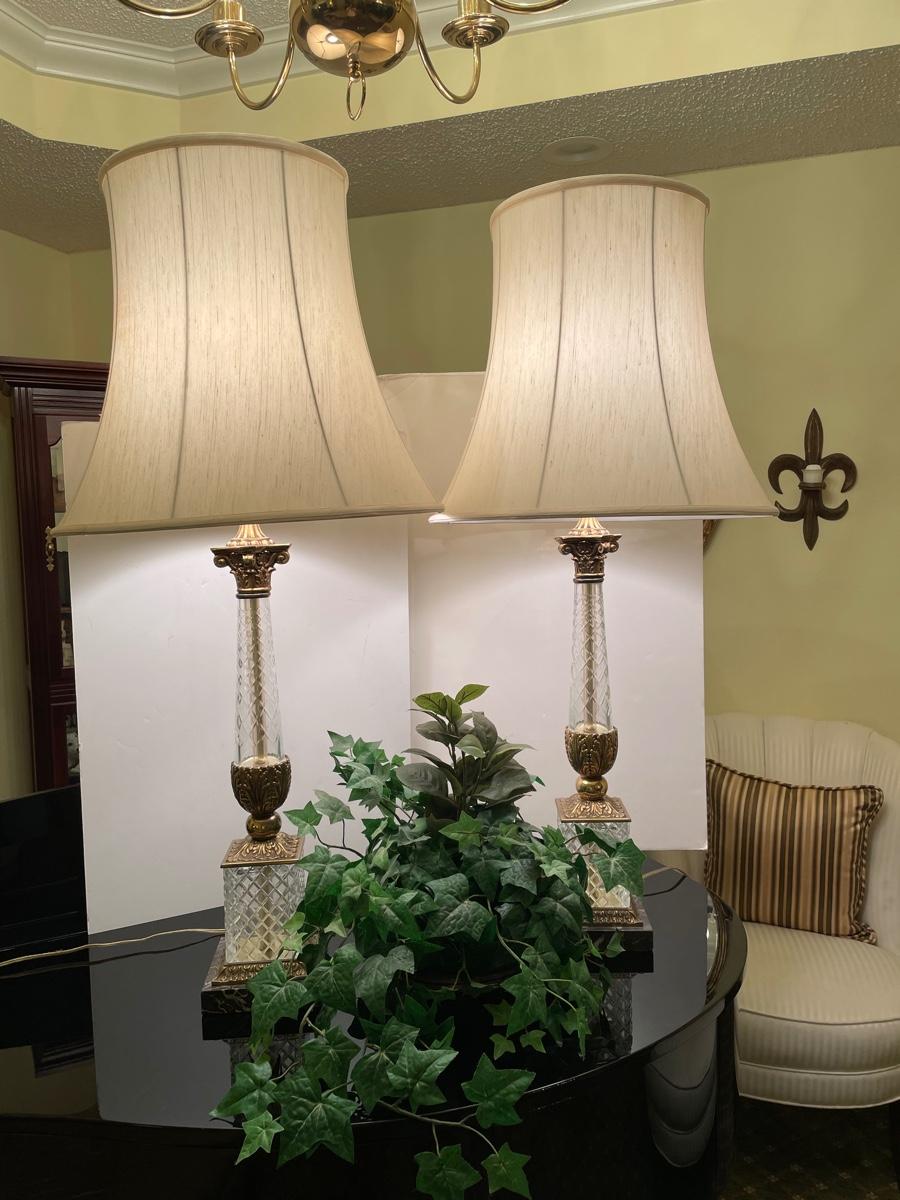 High-quality lamps with beautiful shades. One shade has a slight moisture stain on the back side but otherwise the shades are in great condition. Also included is a small silk arrangement