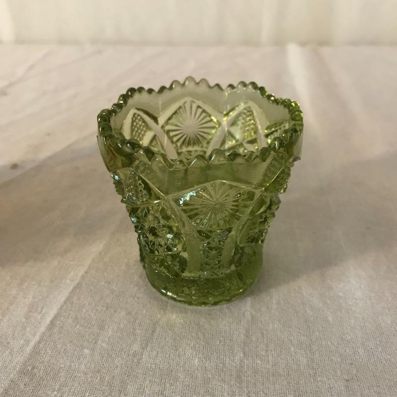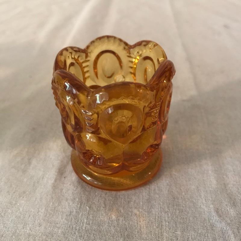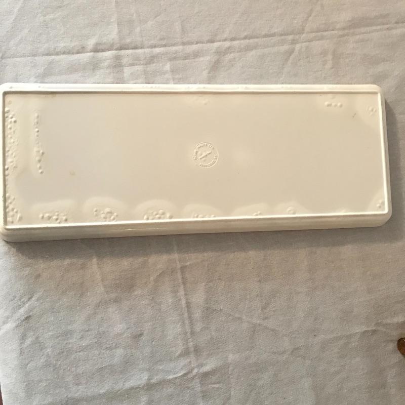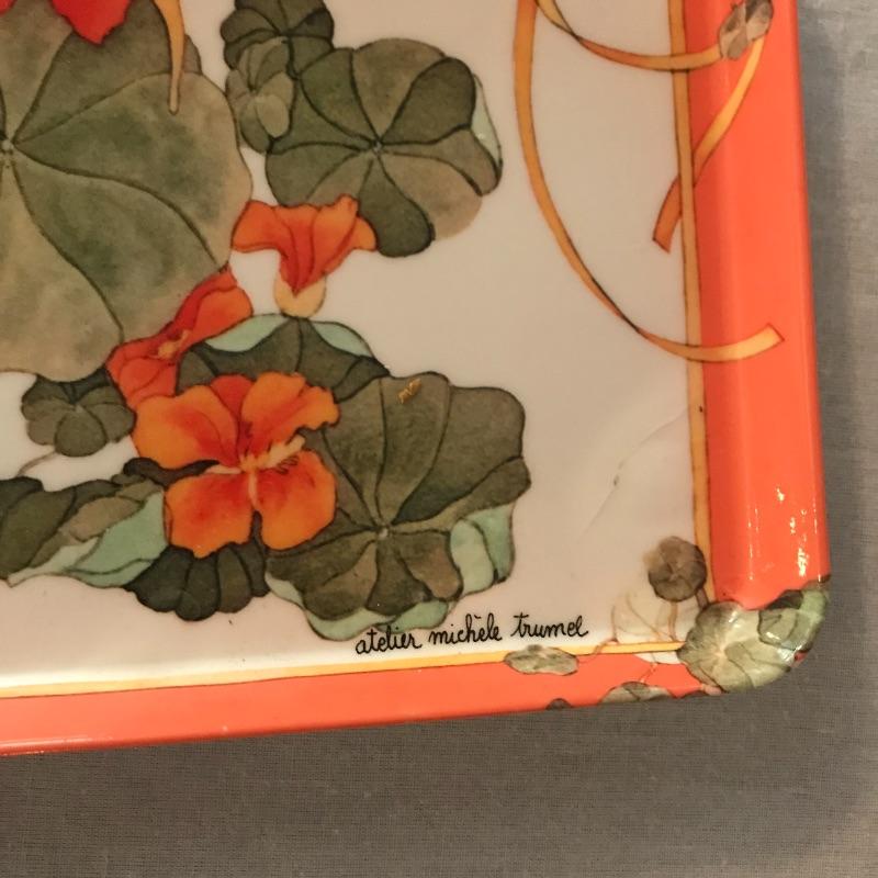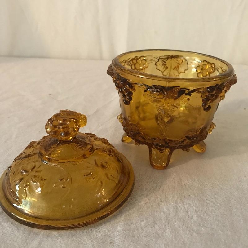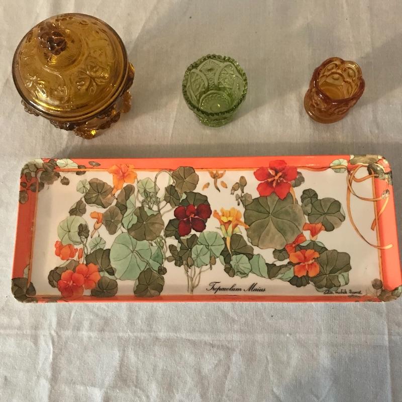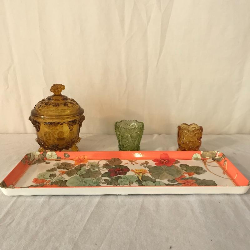Lovely tropical foliage tray with three colored formed glass pieces. Tray appears to have some heat damage and has some small cracks on the face, see photos. Two small colored decorative glasses and one lidded candy bowl. Tray measures approximately 15” x 6”. Local Pickup Only.
