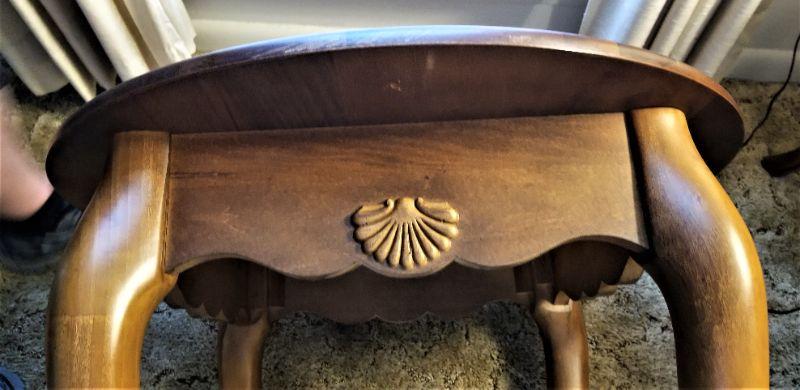 Nice solid wood round lamp table with shell decoration. No maker's mark. Oak finish, Queen Anne style. Shell decoration on two sides. 26" x 26", 22" tall.