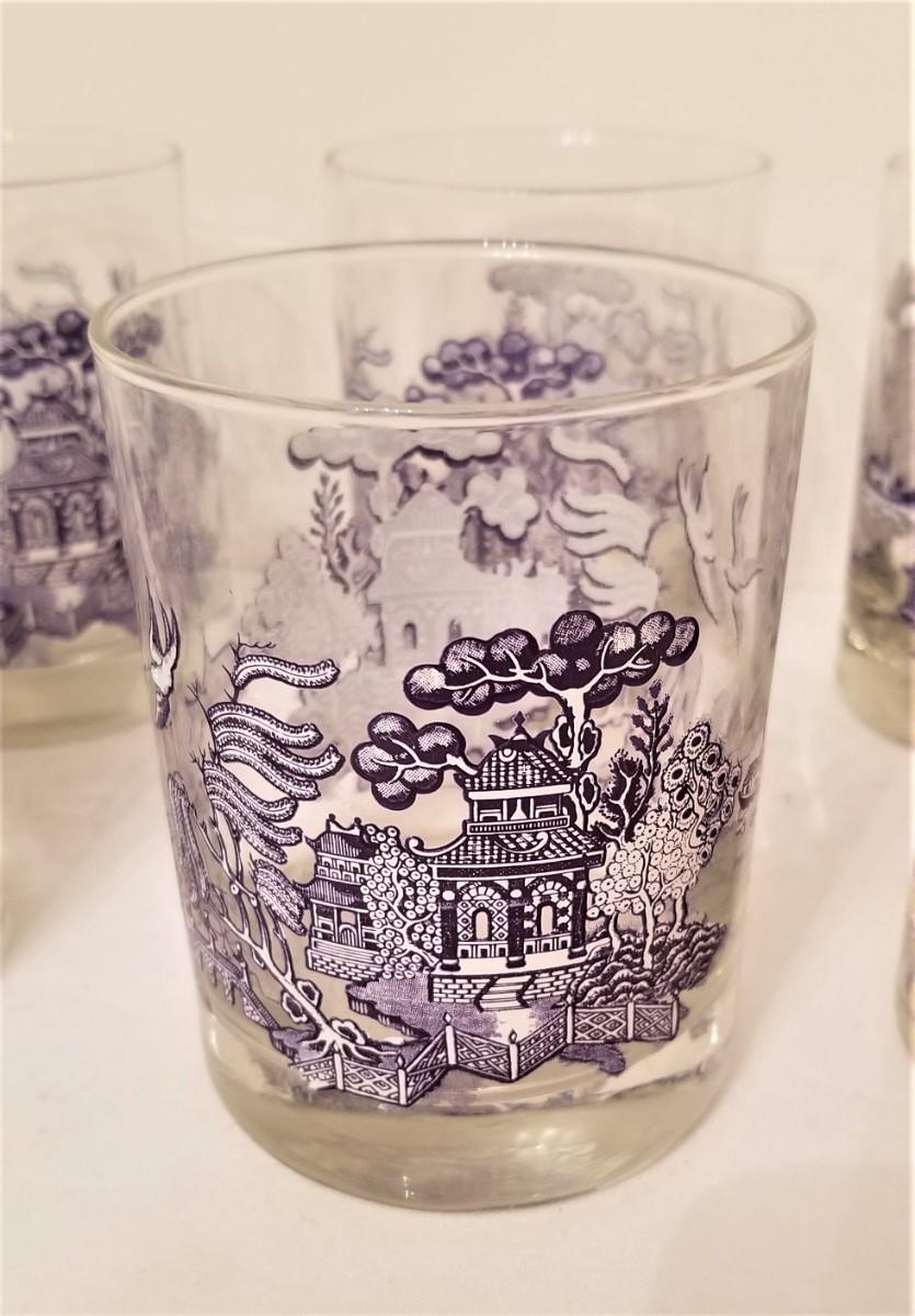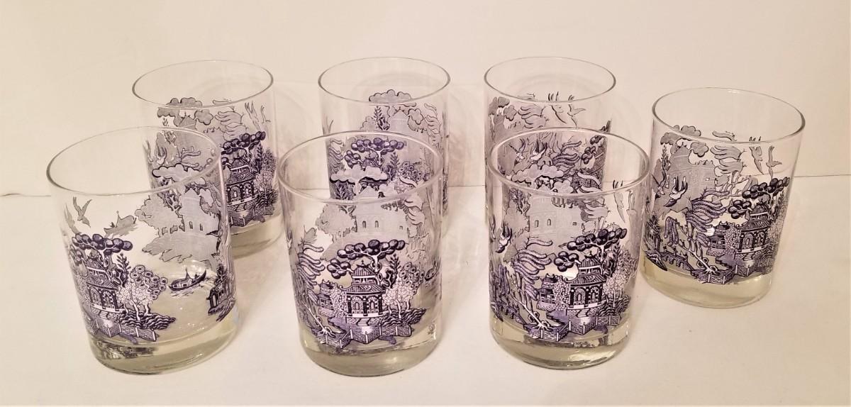 This set of glasses was designed as a "go with" to Blue Willow china. Set of 7, each stands 4" tall. Good condition. The blue is SO blue it almost has a purple cast to it.