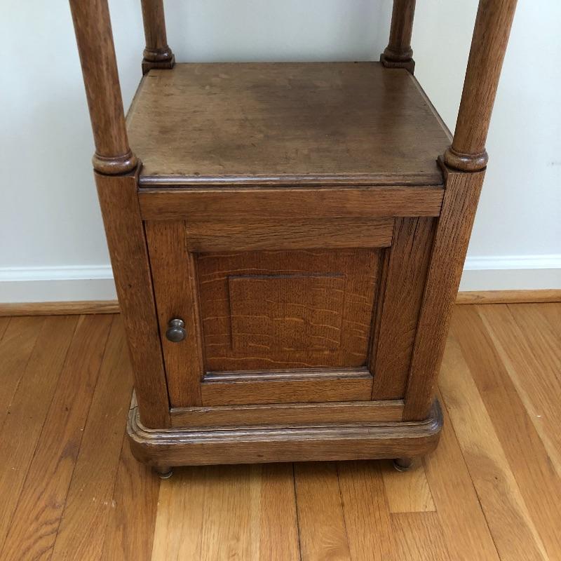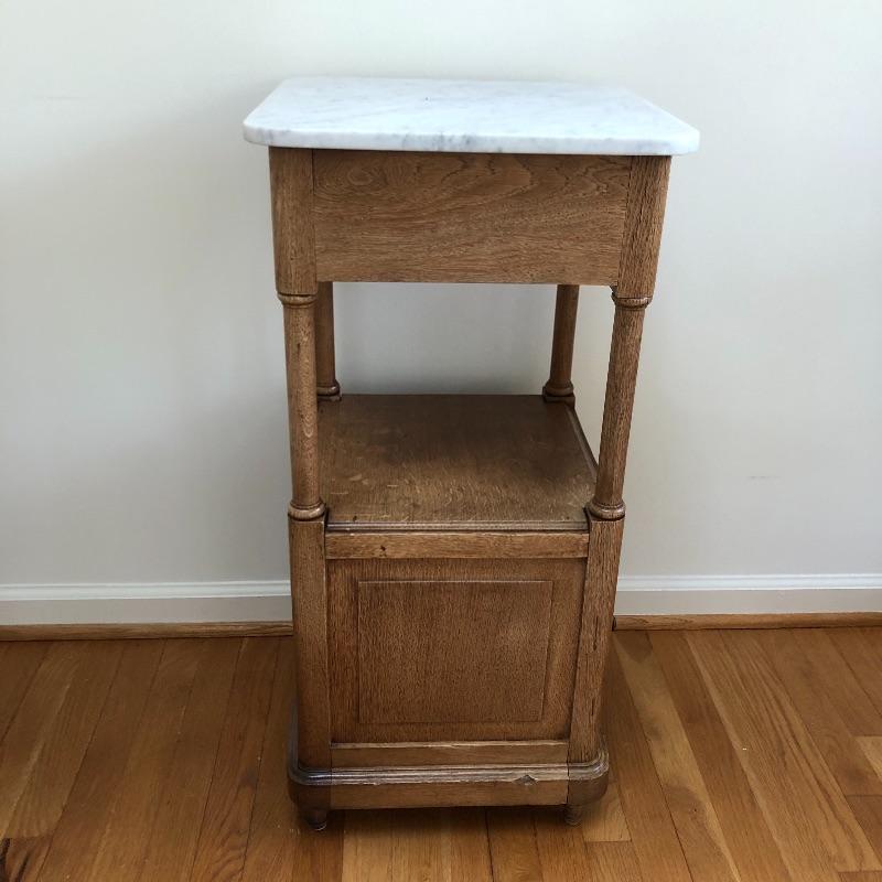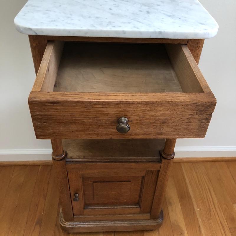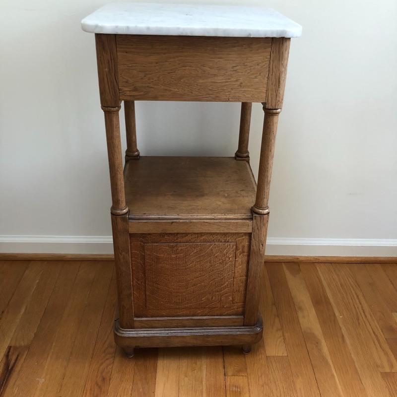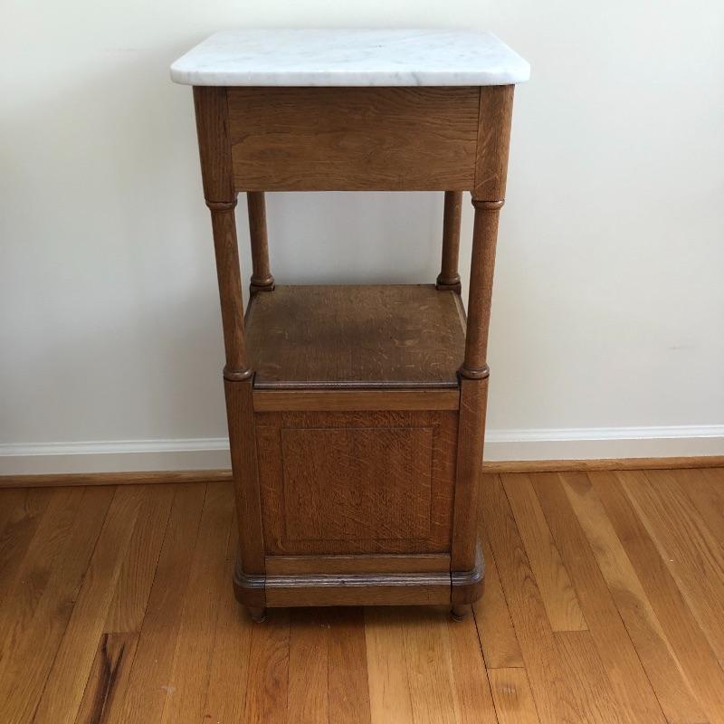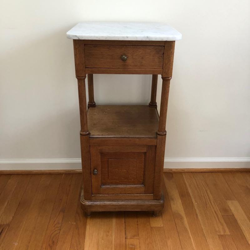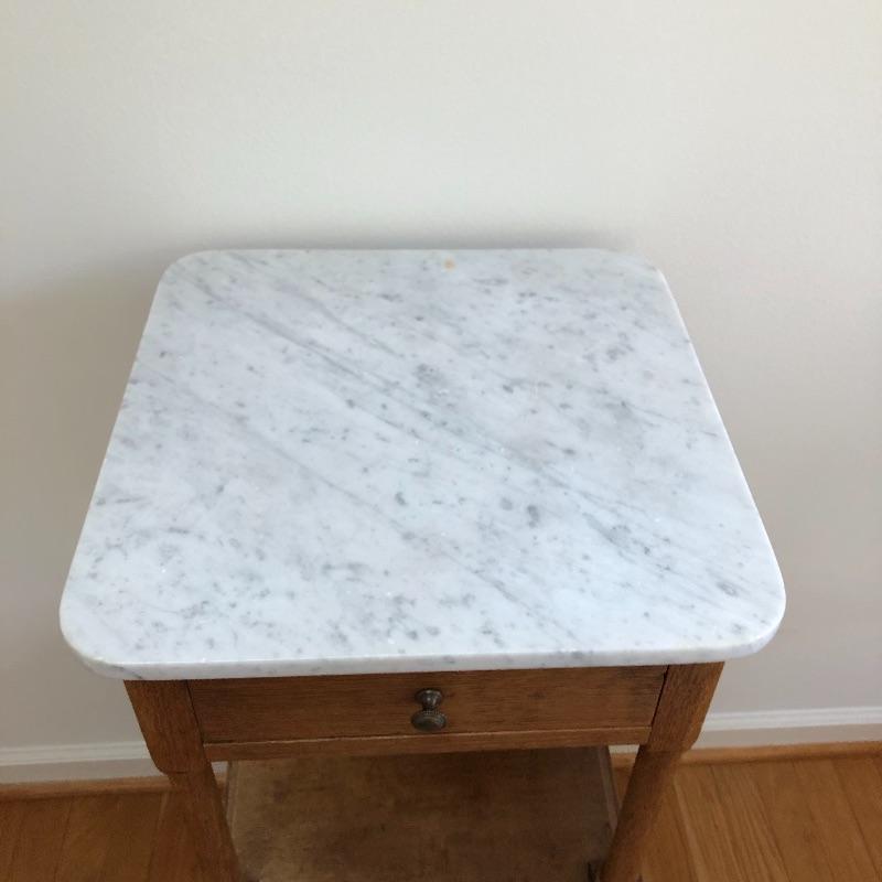 This stunning marble topped side table will look great in your home. This table has a marble top with a dovetailed drawer and a shelf and cabinet underneath. This table is in great shape with some nicks and some splitting on the sides, see pictures. Table measures 15.25” x 15.25” x 32.25”.