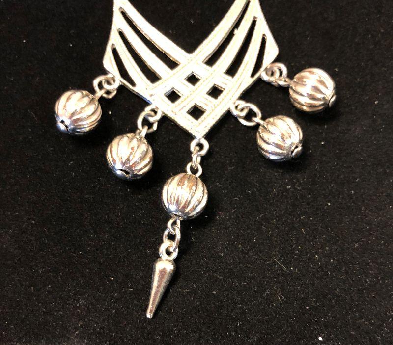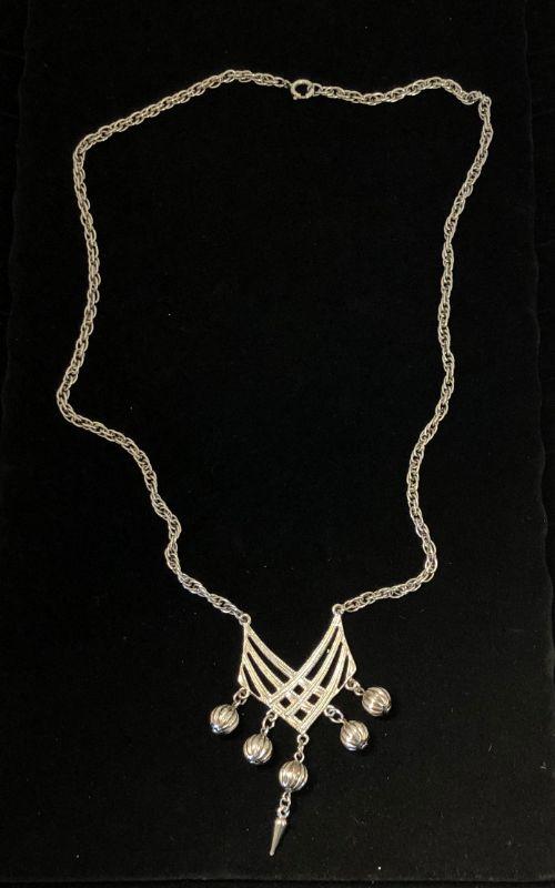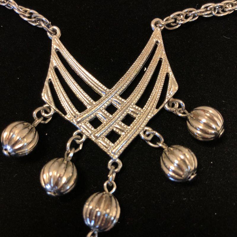 The ends of the silver tone chain hold a large pendant that has silver toned balls and a hanging point (don't you just love my specific descriptions?). The length of this special piece is about 28". Great piece to dress up a casual outfit.