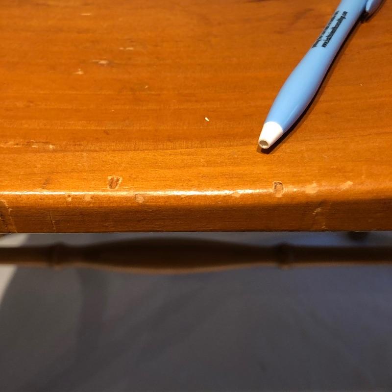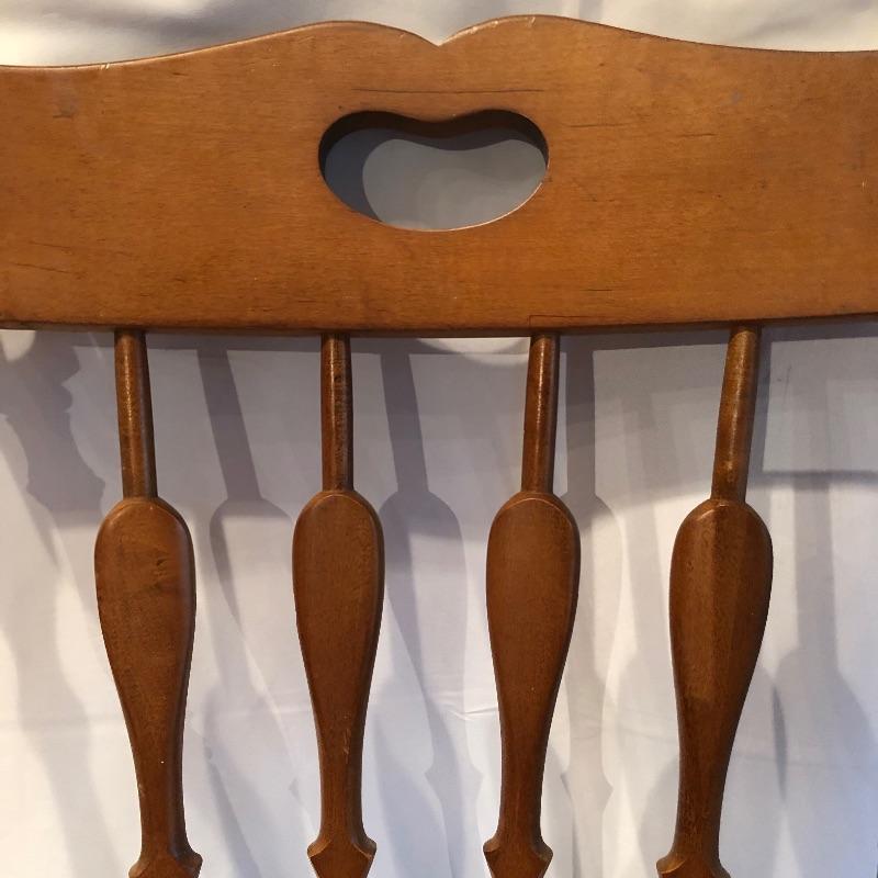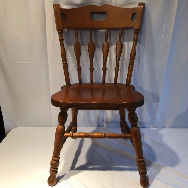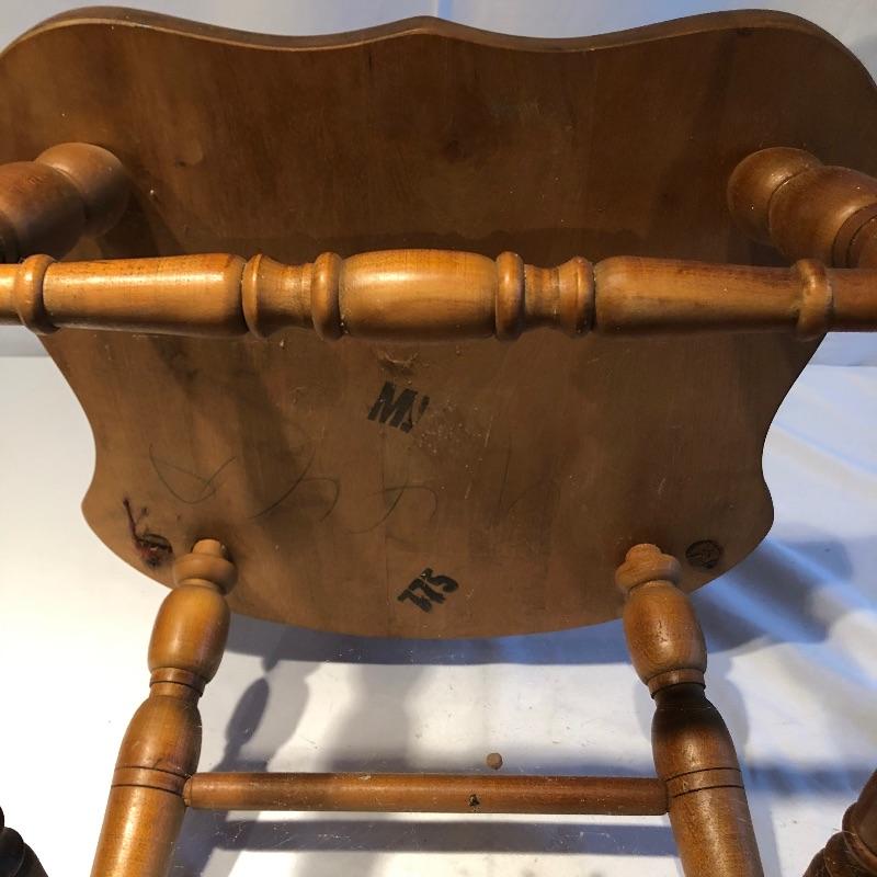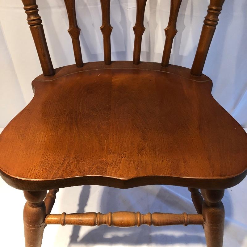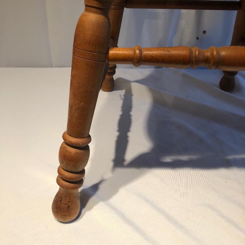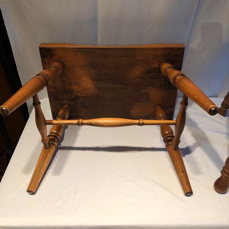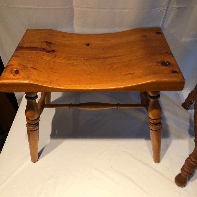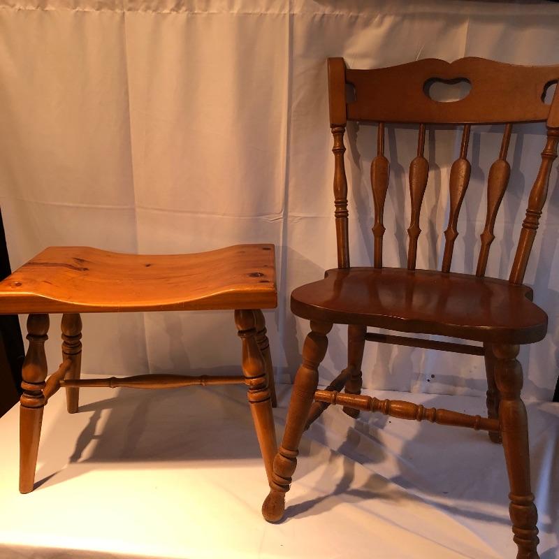 These two solid honey colored wood pieces include a spindle backed chair and a small bench. The bench has an indebted seat for added comfort; a few minor scuff marks are shown in images. The chair also has an indented seat and beautifully turned legs and spindles giving it a wonderful country farmhouse feel!
