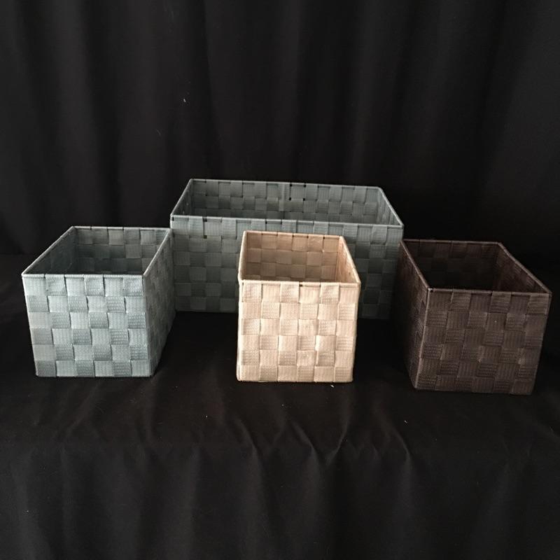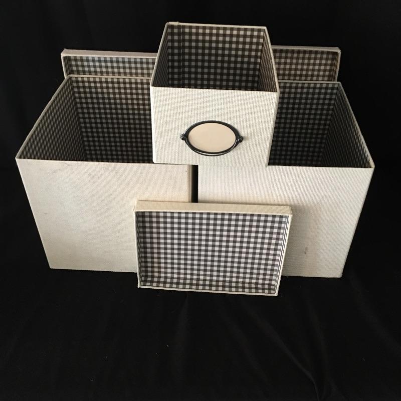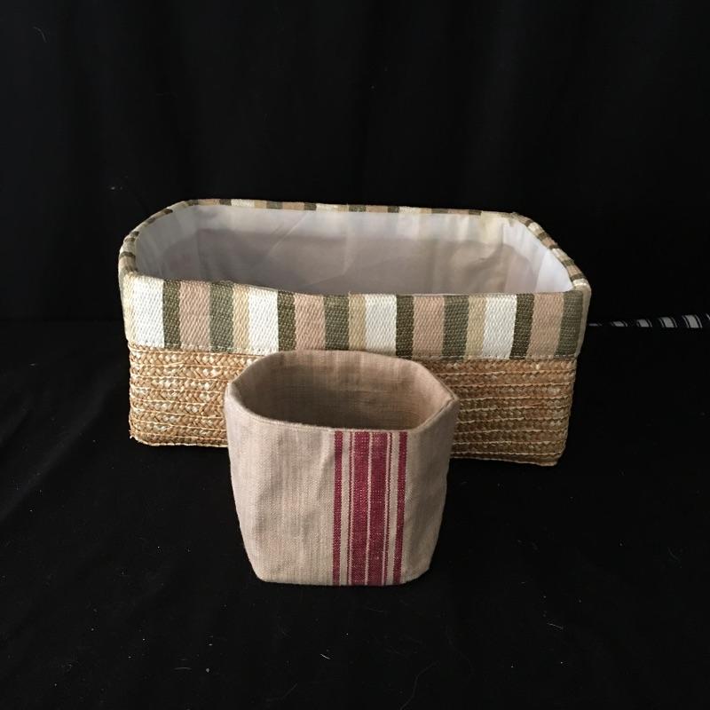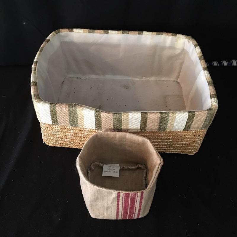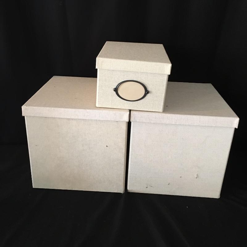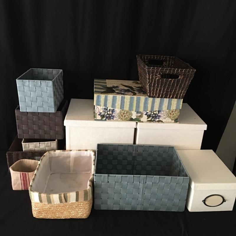 This selection of over ten storage includes three woven boxes, four woven canvas boxes, three cream colored boxes with matching inside and a floral design box