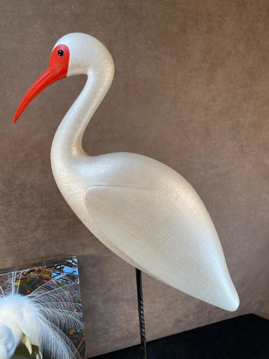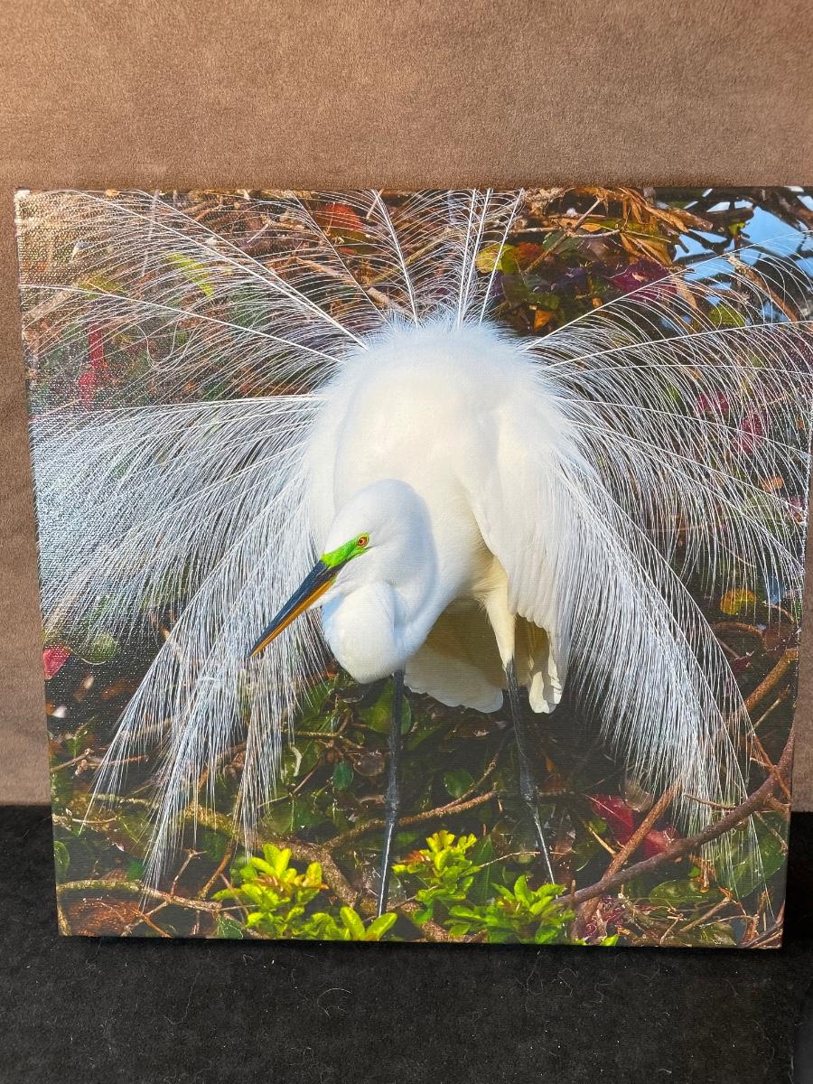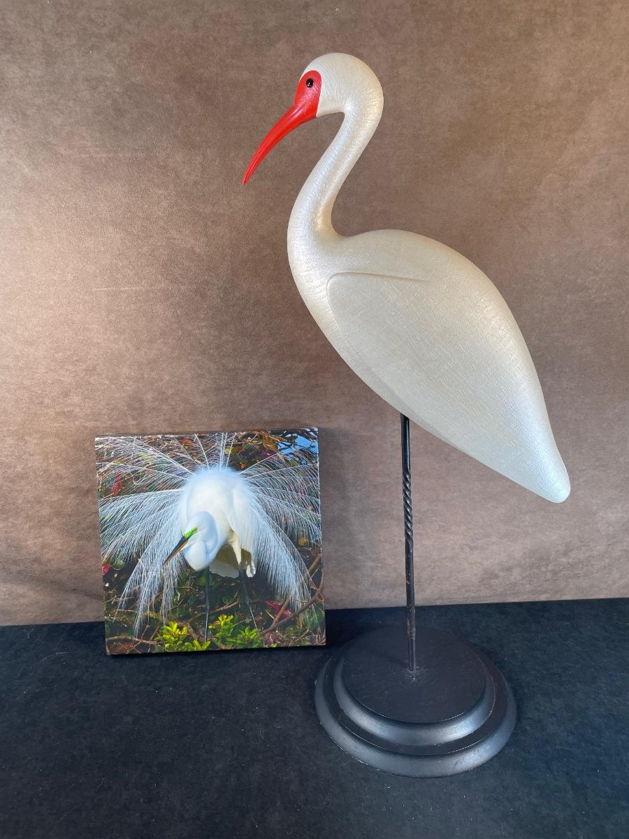 Wooden bird figure on a stand (29" tall). and canvas print depicting a crane (12" x 12")