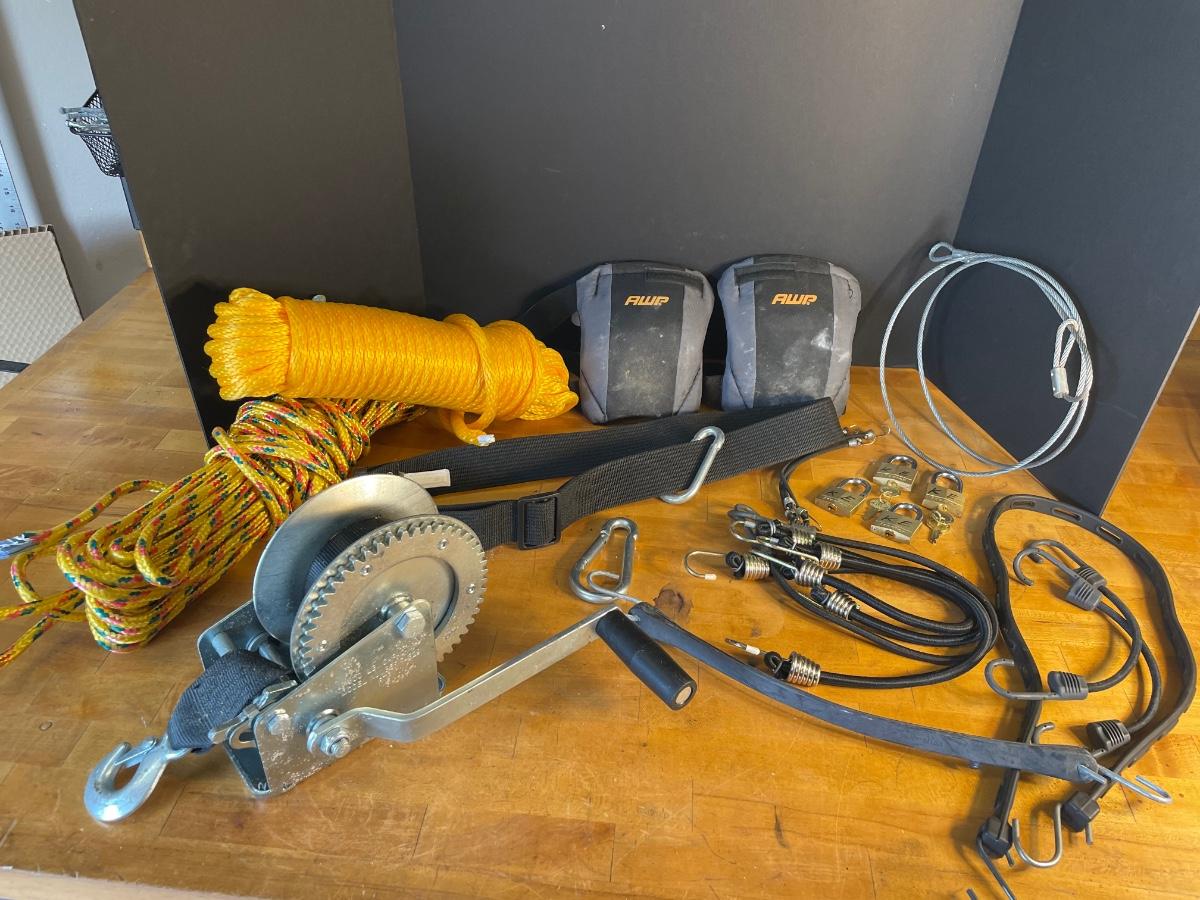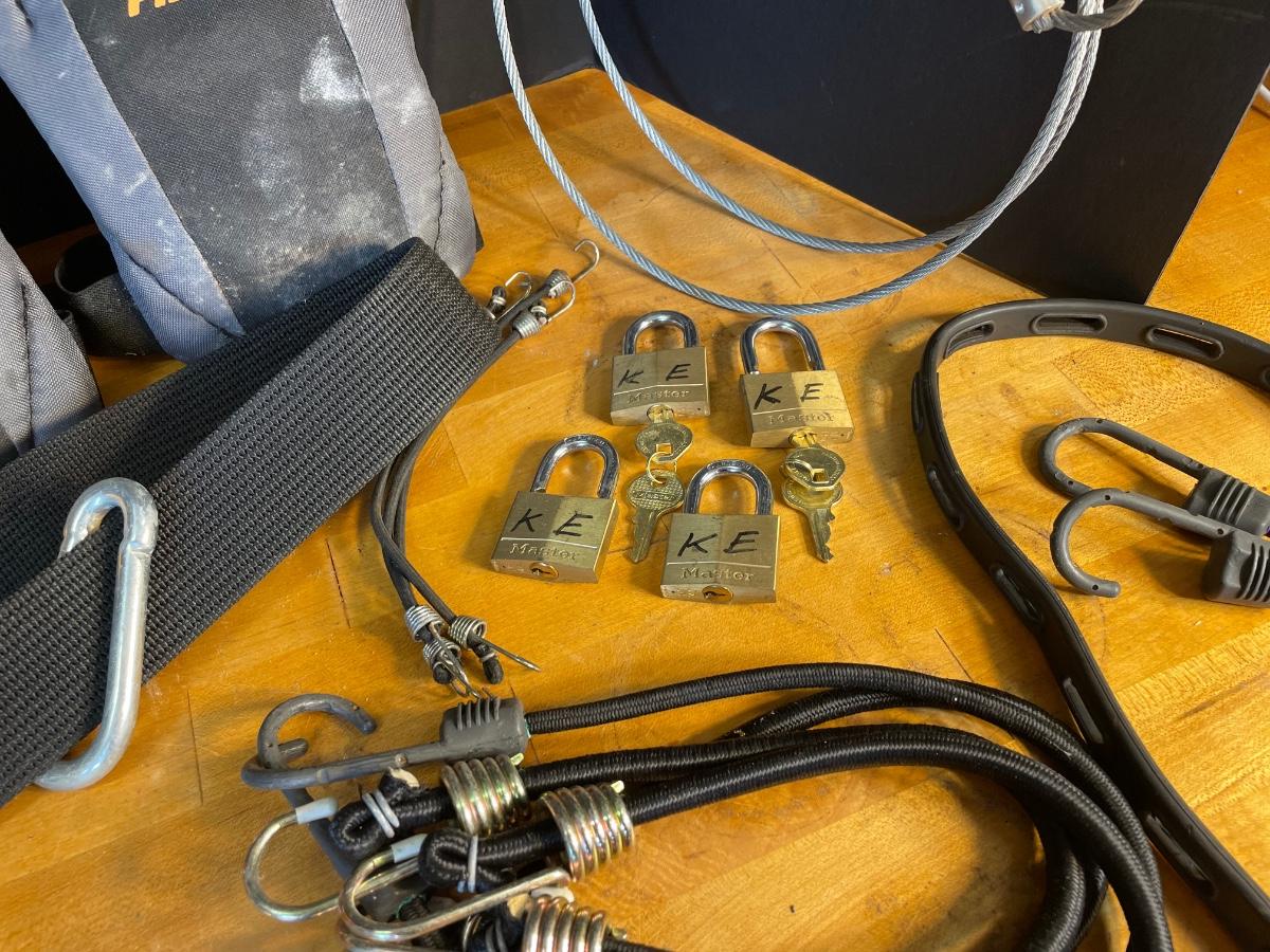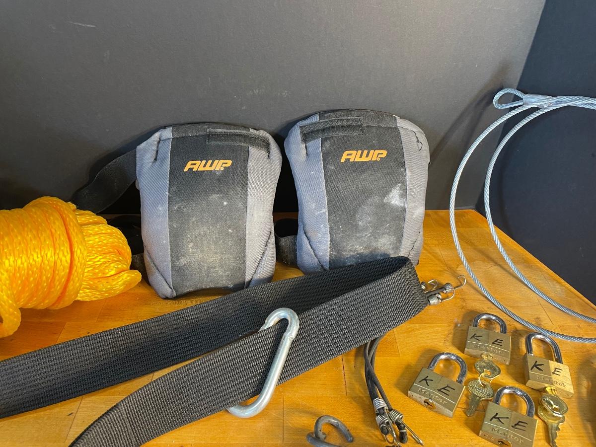 Assortment of ropes, bungee cords and straps, steel cord with 4 locks, plus a pair of knee pads