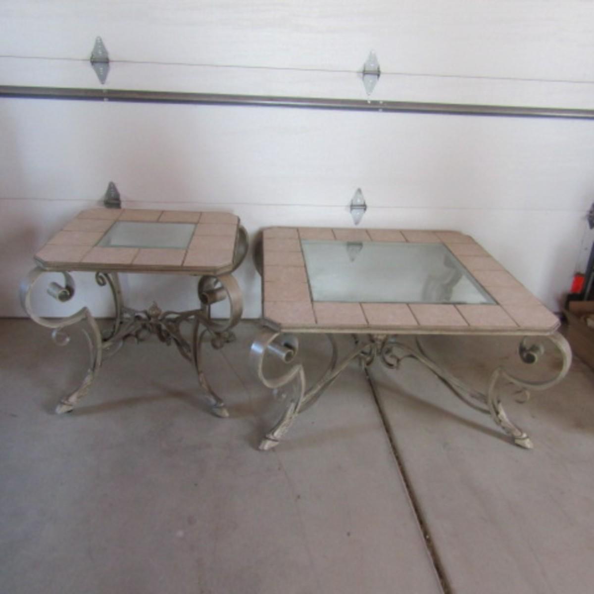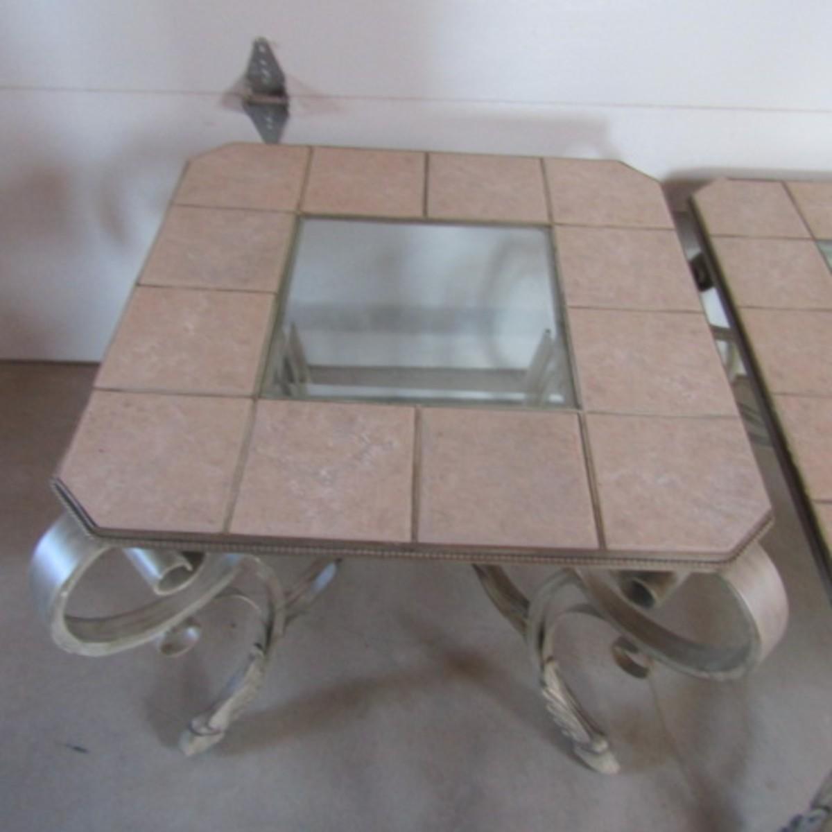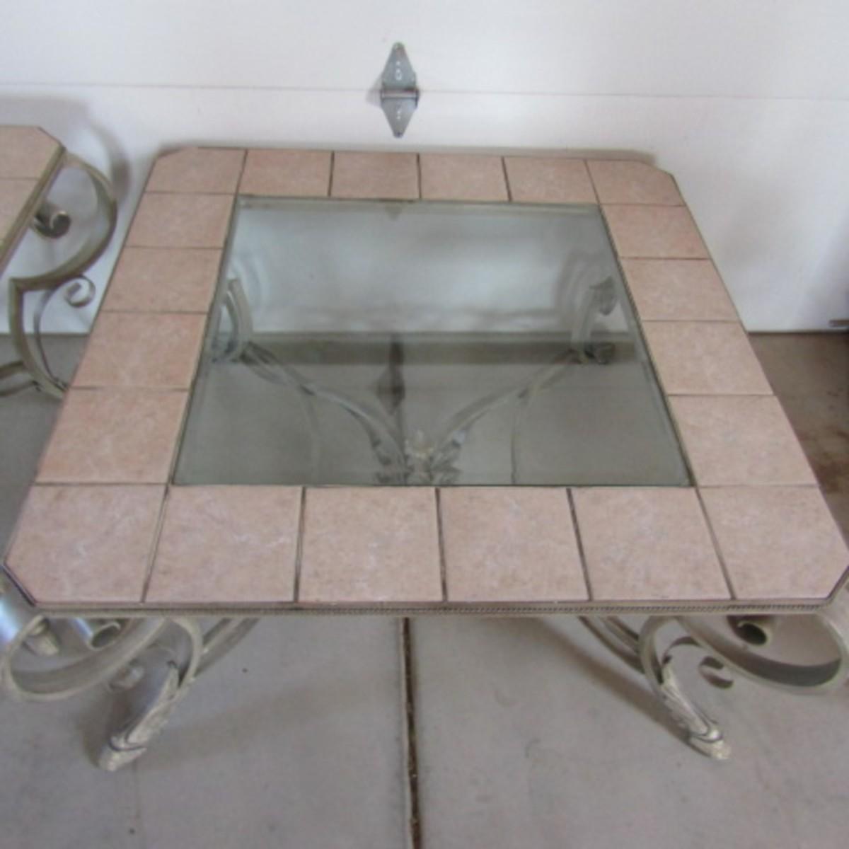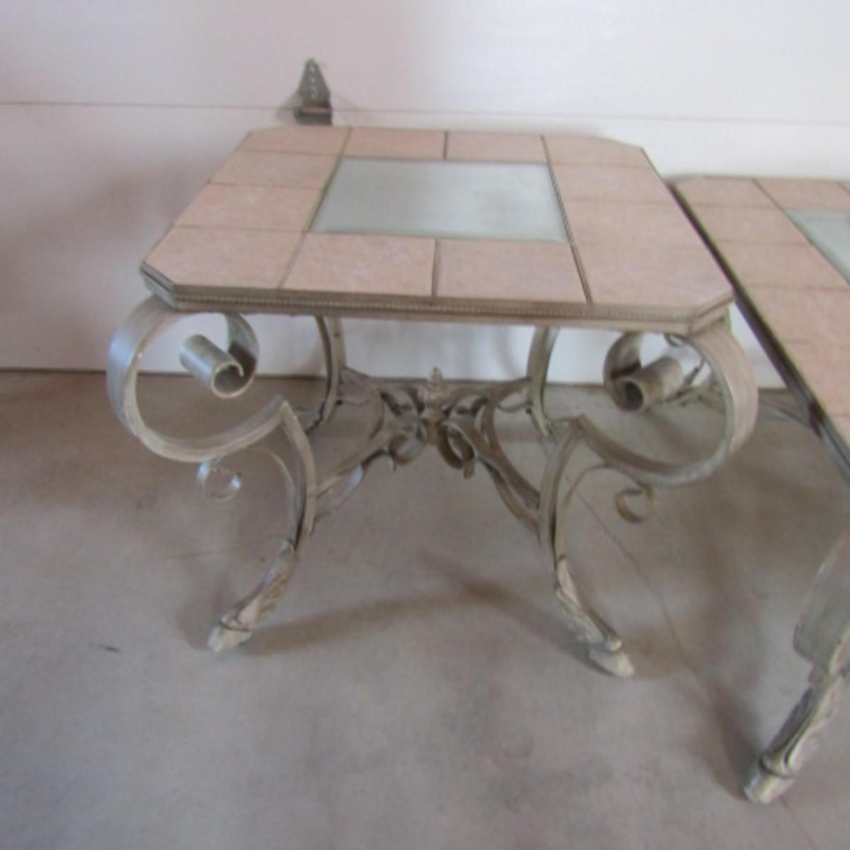 LOT 30 TWO IRON FRAMED END TABLES WITH TILE AND GLASS TOPS (W)