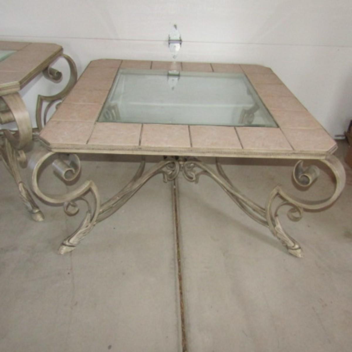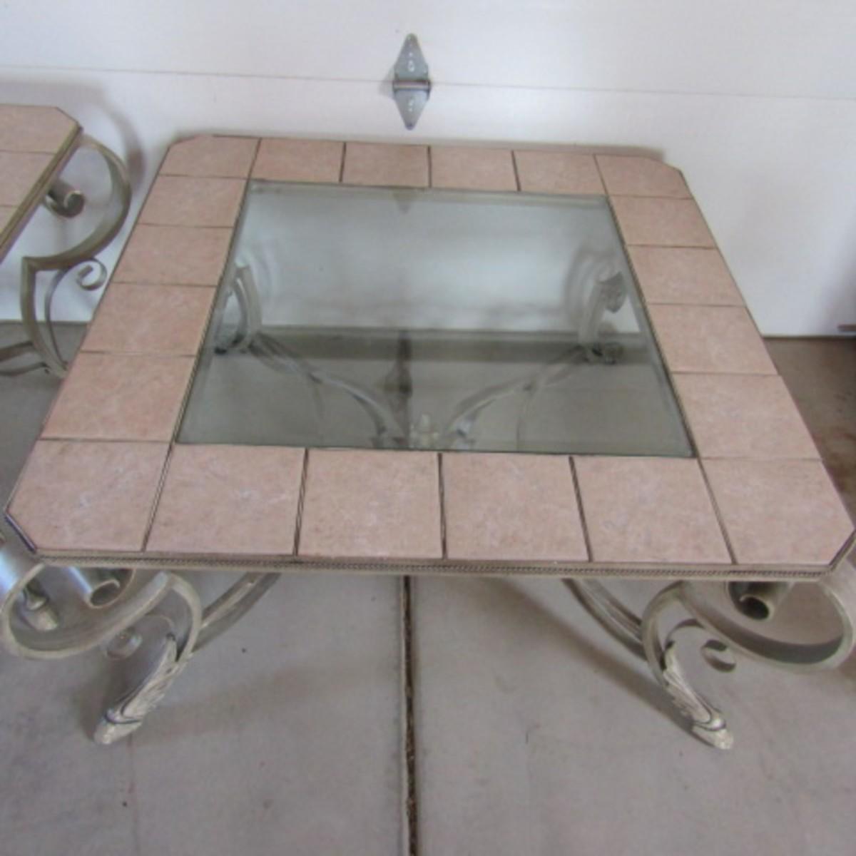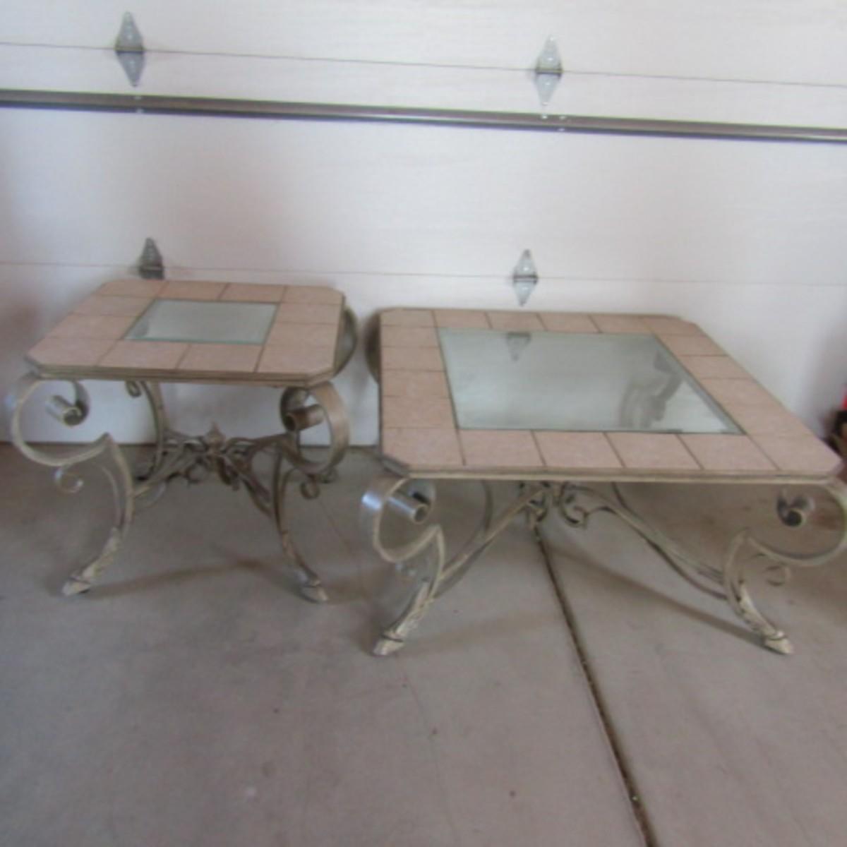 LOT 30 TWO IRON FRAMED END TABLES WITH TILE AND GLASS TOPS (W)