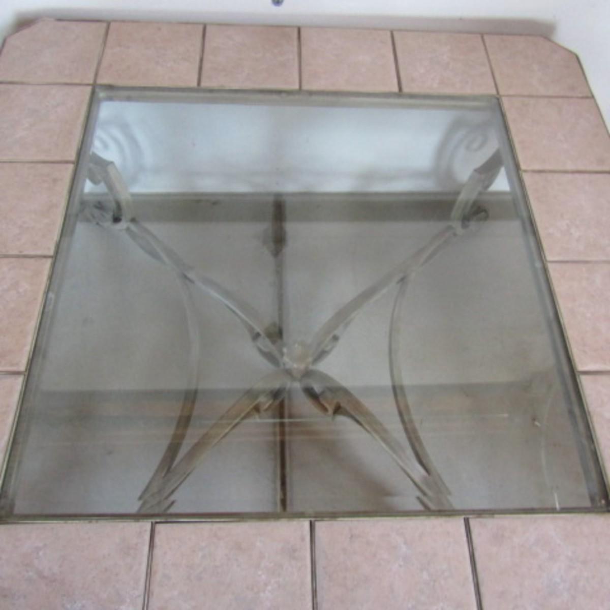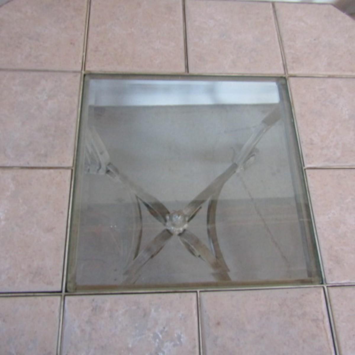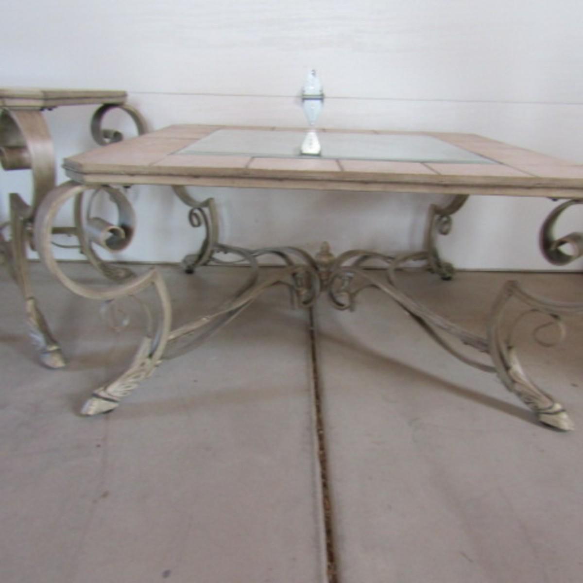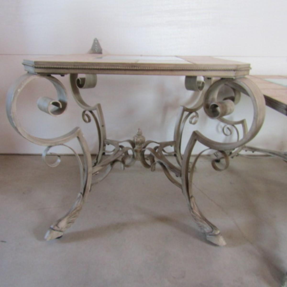 LOT 30 TWO IRON FRAMED END TABLES WITH TILE AND GLASS TOPS (W)