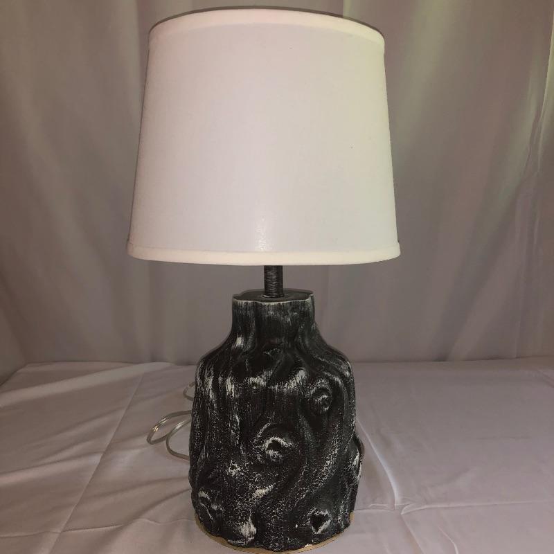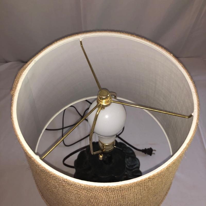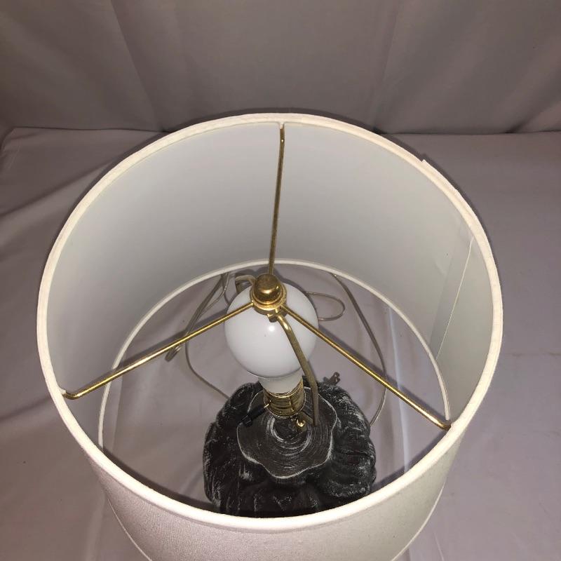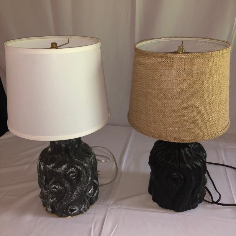 Lot includes 2 lamps that are matching but they have slightly different finishes and different lampshades.. They appear to be made of resin. Lamps have been tested and do work. White shaded lamp measures 22”H. Local pickup only.