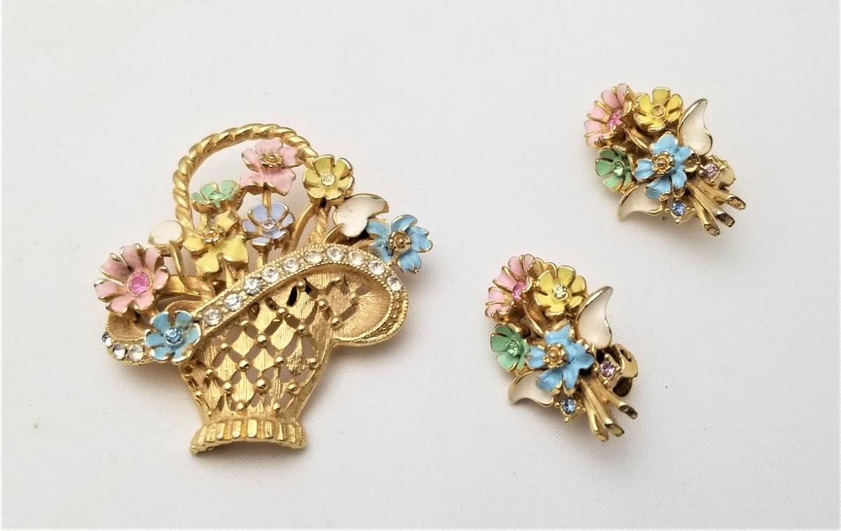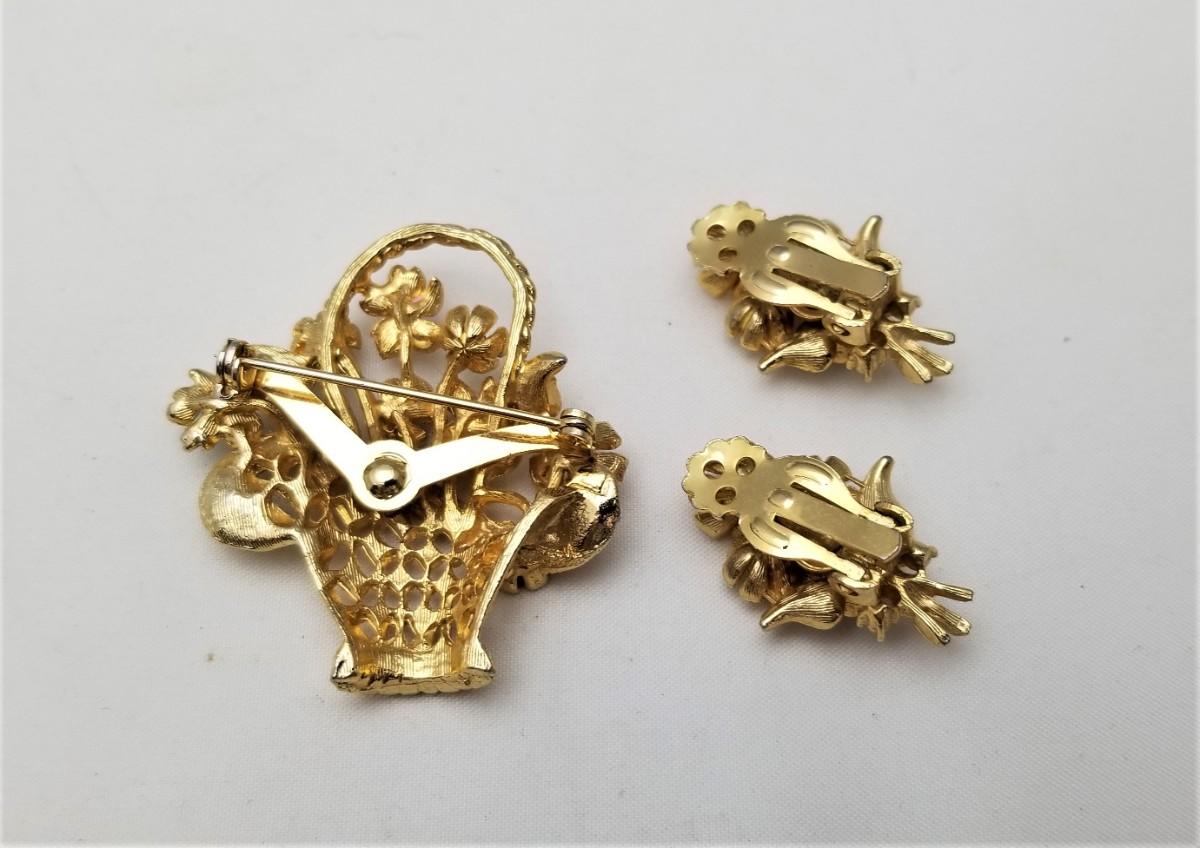 Pretty vintage (unsigned) flower basket brooch and matching clip earrings set. Both in lovely, gently used condition. All stones present. Brooch is 1.25" tall.