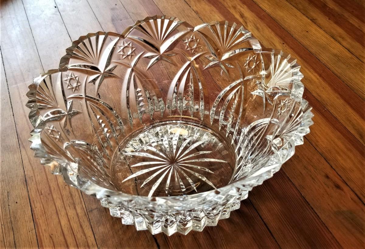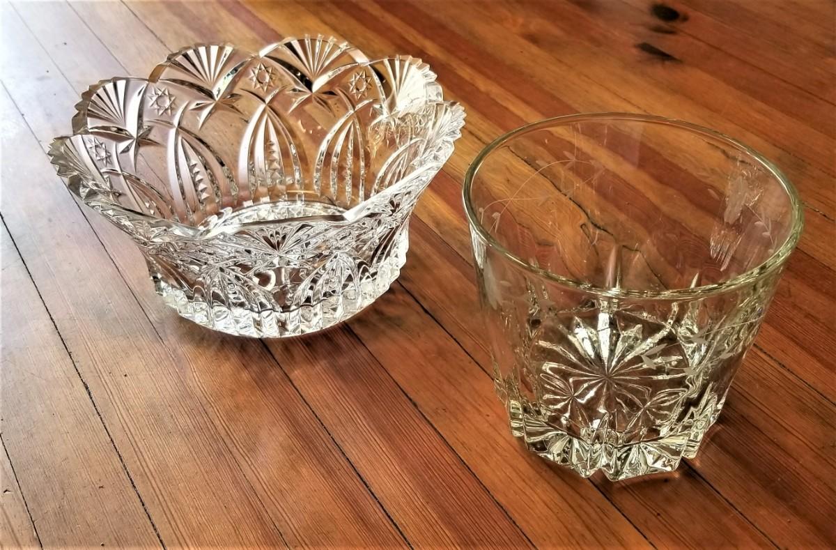 Two nice pieces of glass here - vintage etched glass ice bucket, 5.25" tall and 6" across, and a pretty crystal bowl that almost looks like a crown - 9" across, 4.25" tall. Both in good condition.