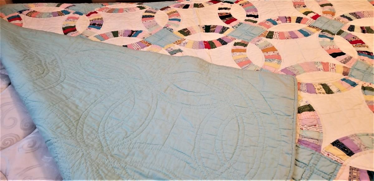 Lovely vintage hand-sewn cotton quilt in the Wedding Ring pattern. Clean. Made to fit a double/full bed, as shown. Back is a plain robin's egg blue. about 82" x 66". Good condition.