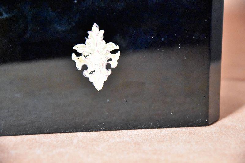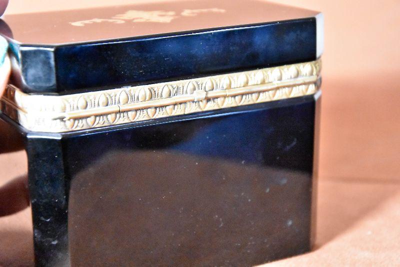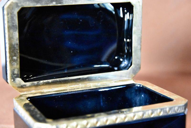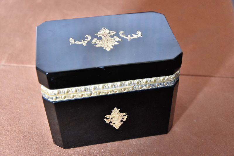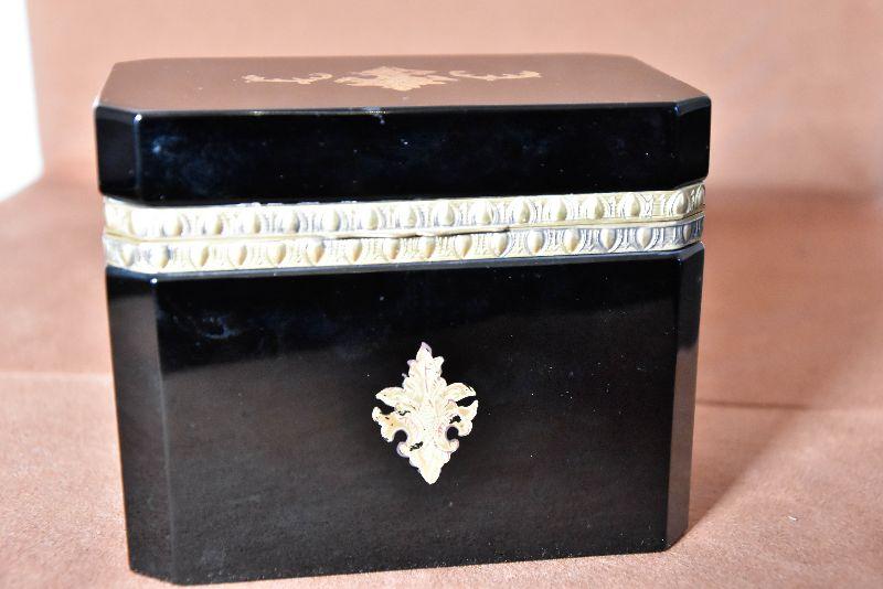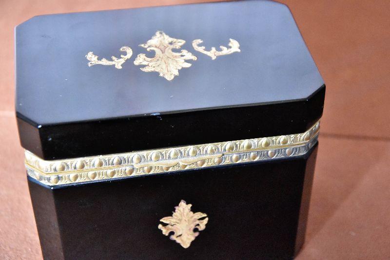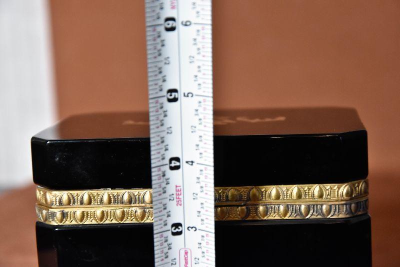 Vintage Italian Murano Black Art Glass rectangle jewelry box with ornate bronze mounts and hinge. Ornate bronze inlay on top and front.