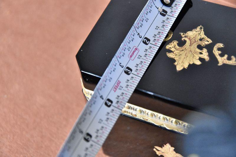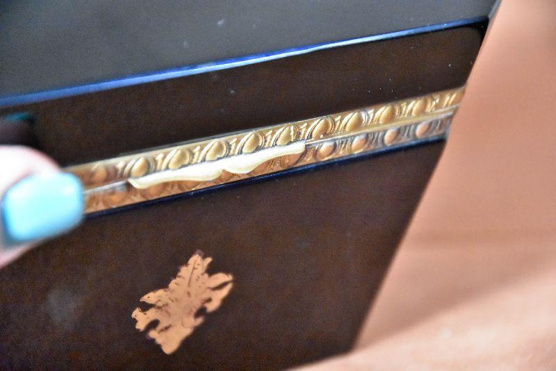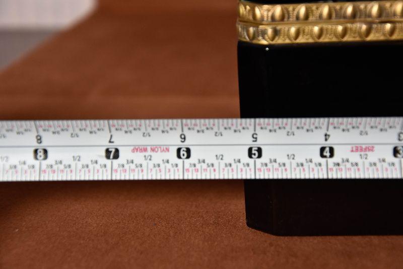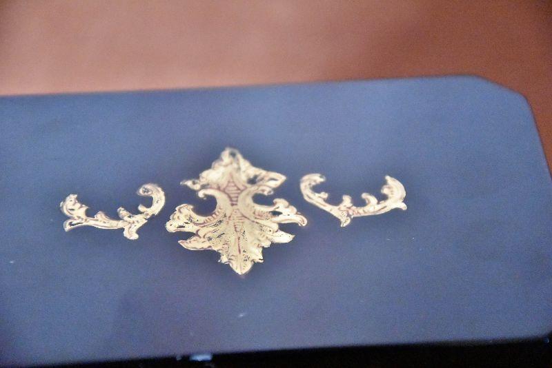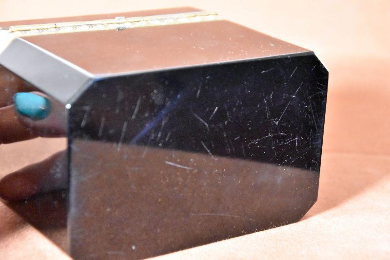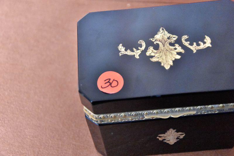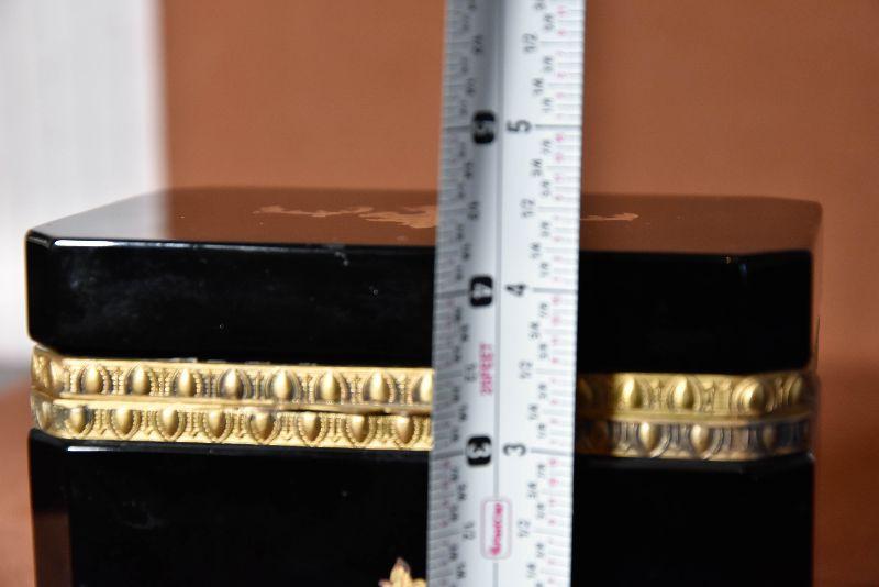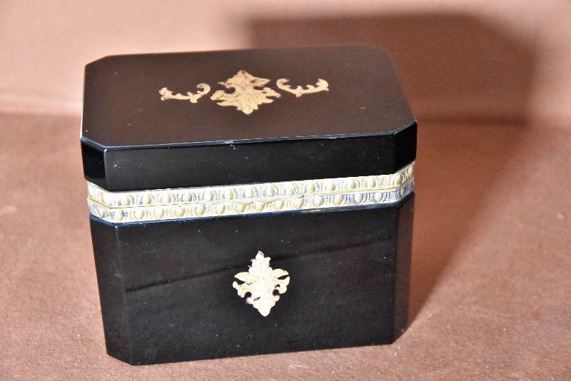 Vintage Italian Murano Black Art Glass rectangle jewelry box with ornate bronze mounts and hinge. Ornate bronze inlay on top and front.