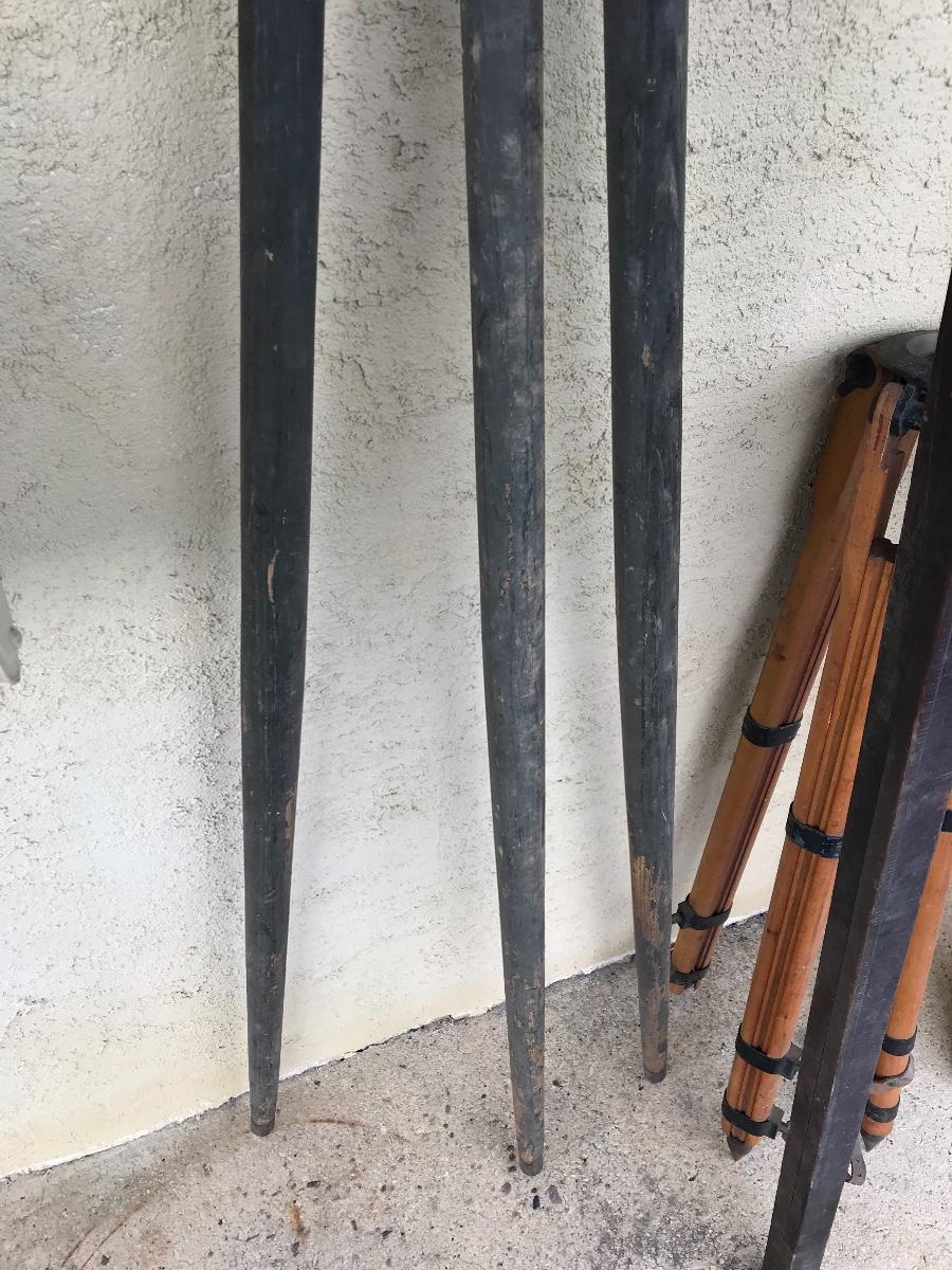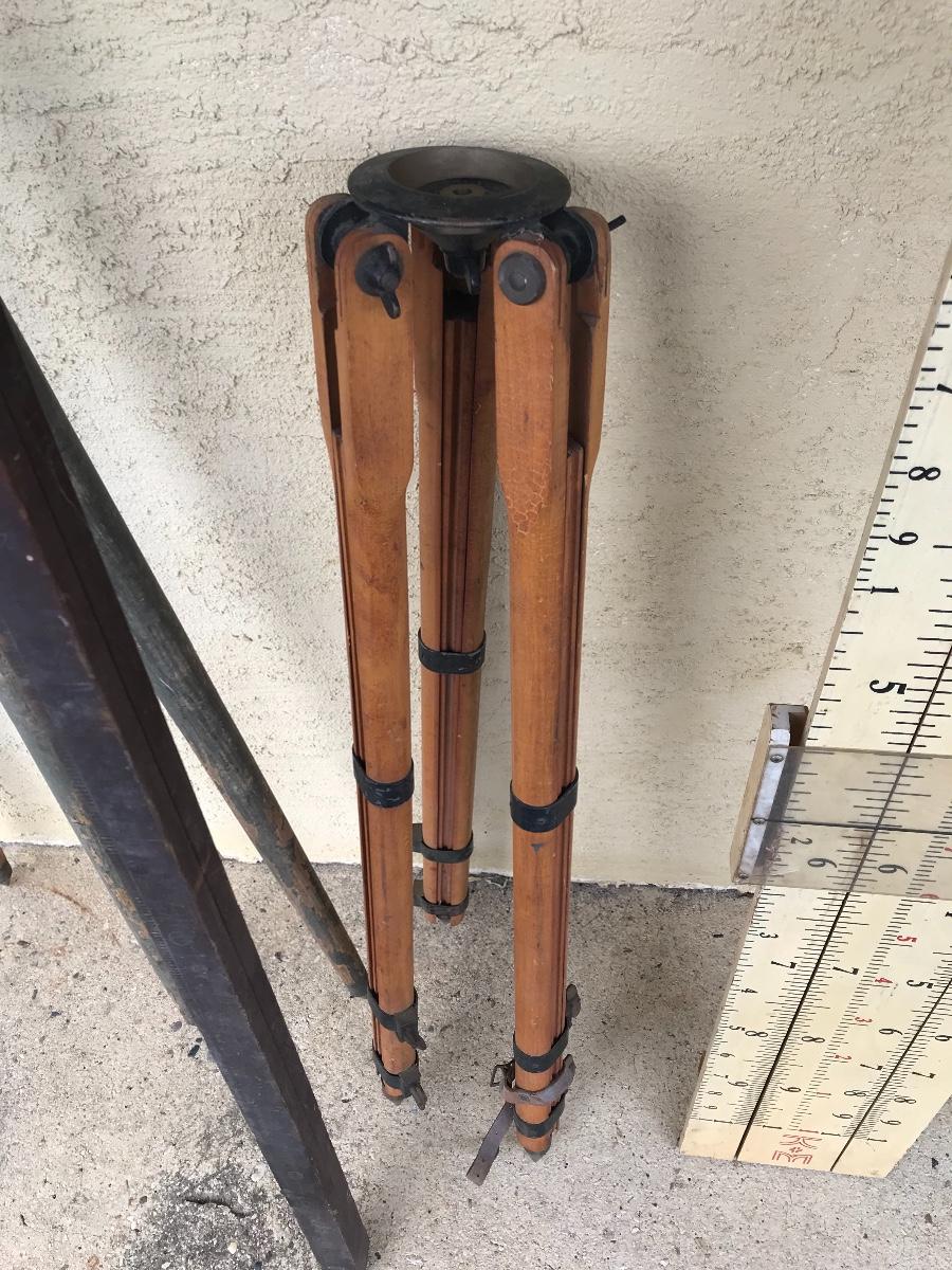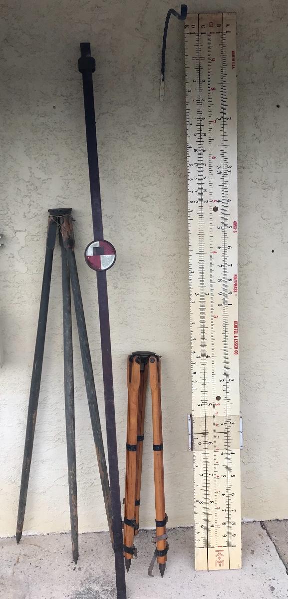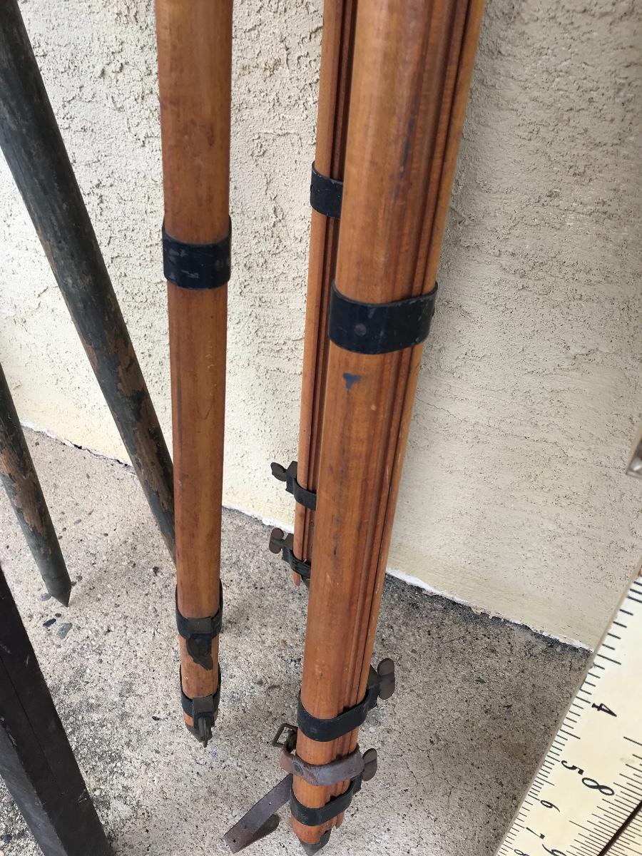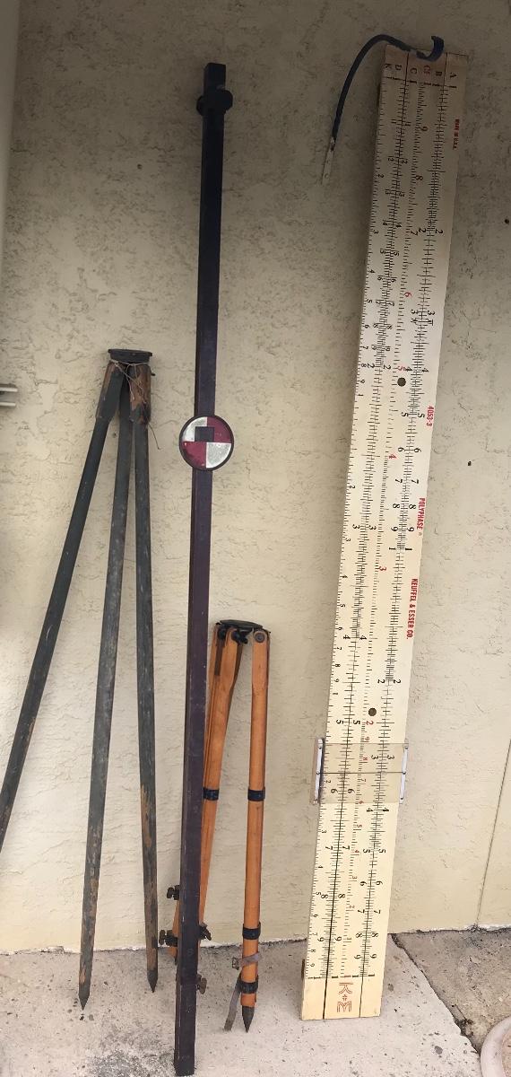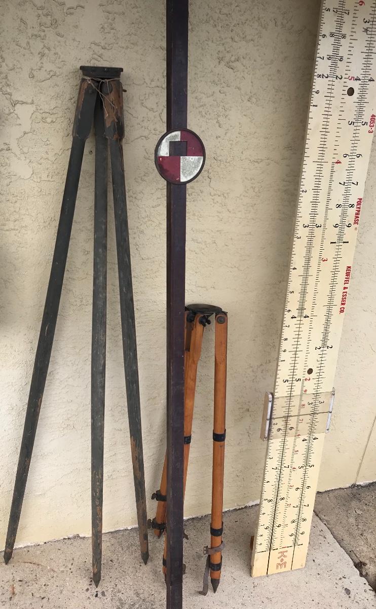 Lot of vintage survey equipment including two tripods for transits (tripods only) and two measuring rods/poles. The pictures show condition, measurements if taken, and what is included in the lot. Due to the large amount that we photograph and the time frame, we are not always able to take measurements. All items unless noted, are pre-owned and have been used. If you purchased furniture, you must bring help. We do not allow one person to carry large furniture out on their own. Bring help, tools and a truck for the safety of our client’s homes, and your personal safety. Company policy. Thank you.