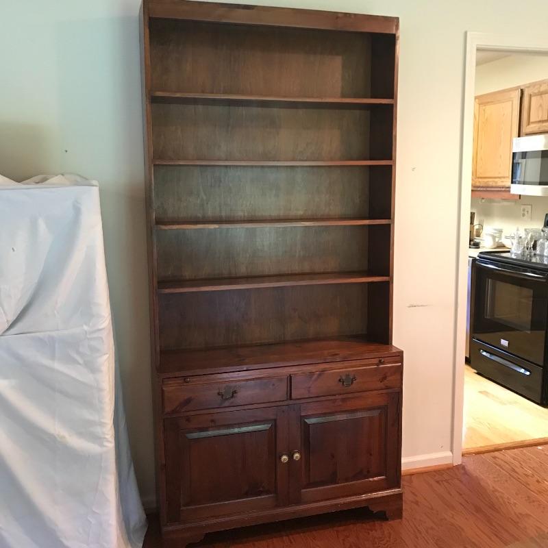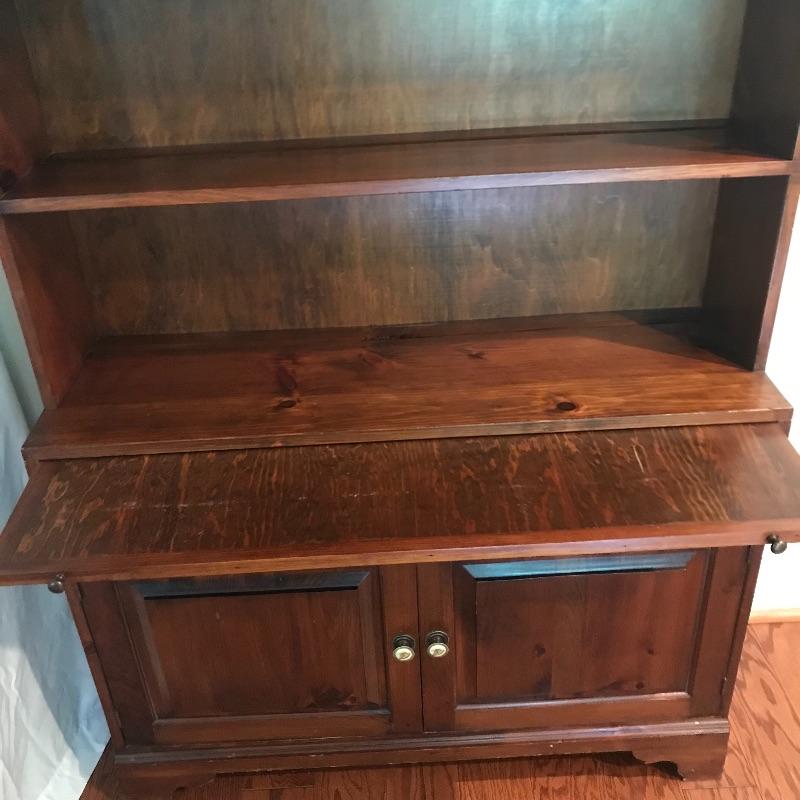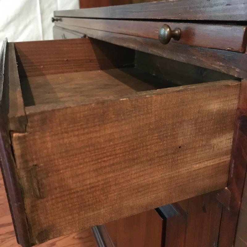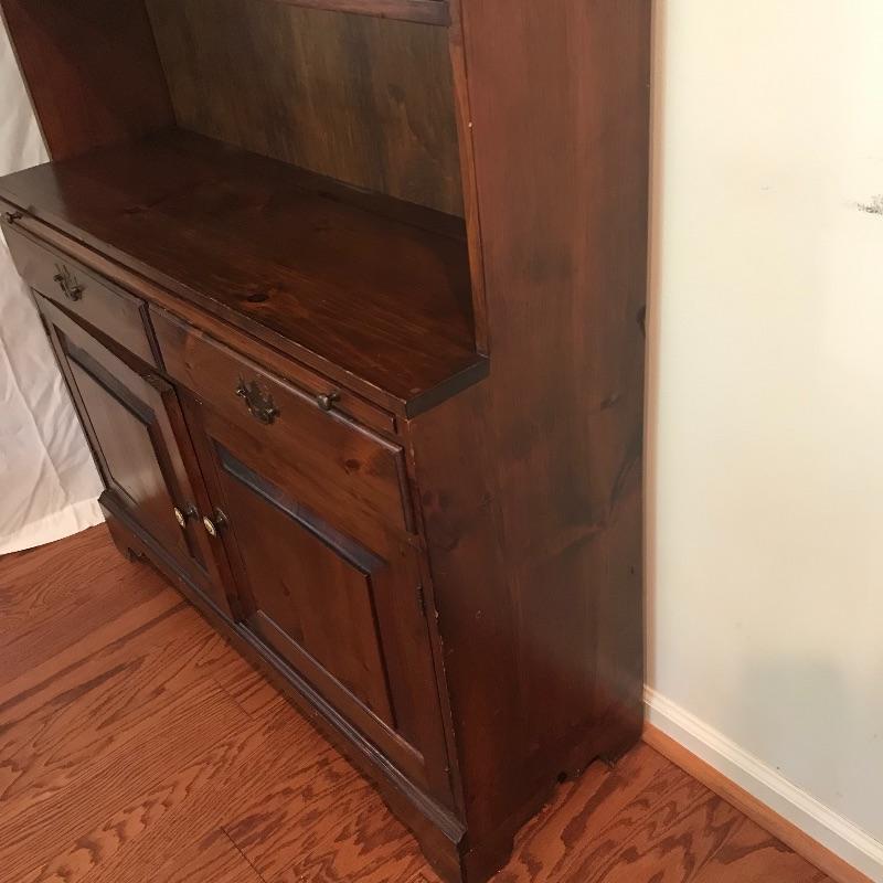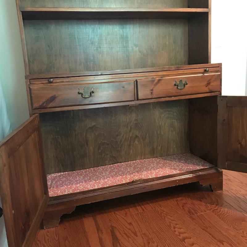 Lovely deep brown wooden hutch has a very sturdy vintage feel. This piece has very little wear for its age and it’s mostly concentrated near the bottom,see photos. Hutch is one piece and measures 40” x 13” x 82” with a small tray above its two dovetail drawers. The right drawer sticks a little when sliding out. Each shelf has a display groove near the back. Please bring help to load. Local Pickup Only.