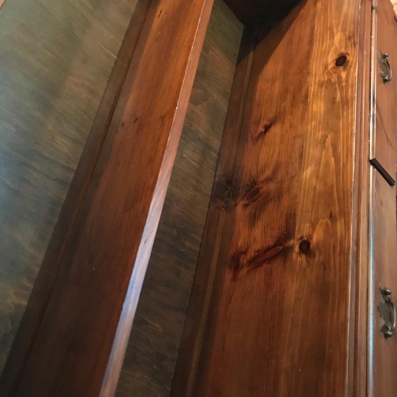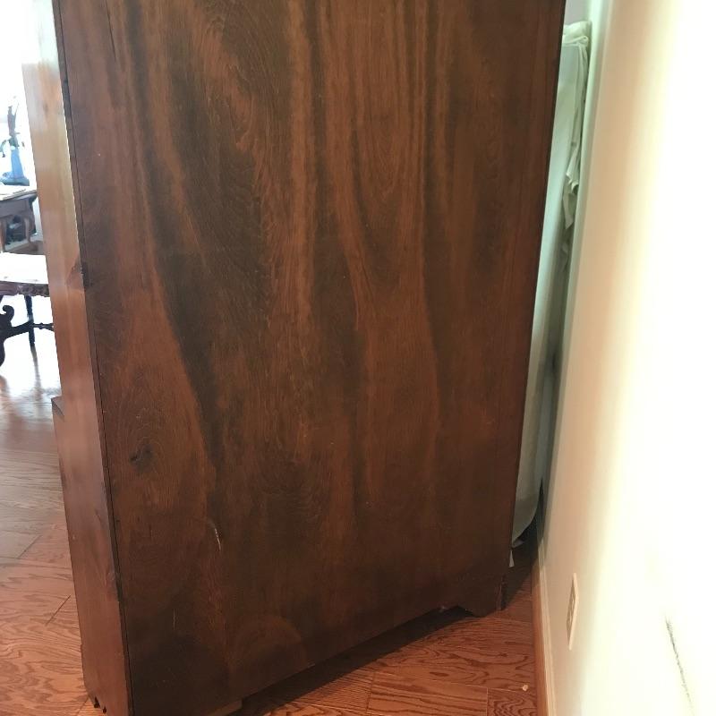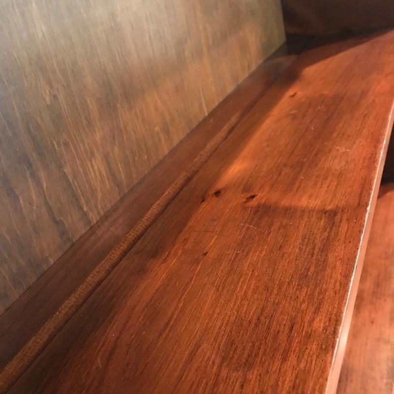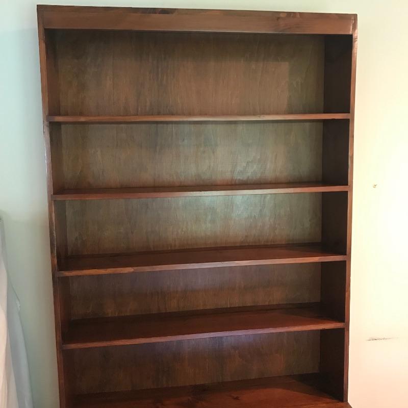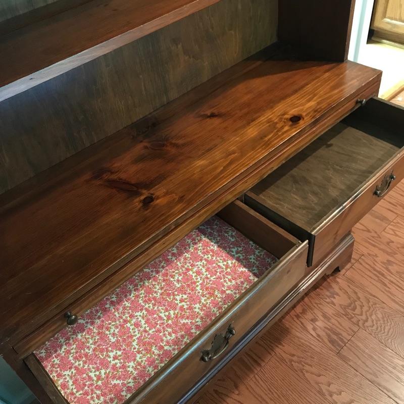 Lovely deep brown wooden hutch has a very sturdy vintage feel. This piece has very little wear for its age and it’s mostly concentrated near the bottom,see photos. Hutch is one piece and measures 40” x 13” x 82” with a small tray above its two dovetail drawers. The right drawer sticks a little when sliding out. Each shelf has a display groove near the back. Please bring help to load. Local Pickup Only.