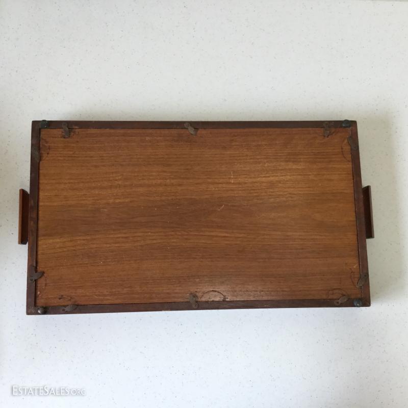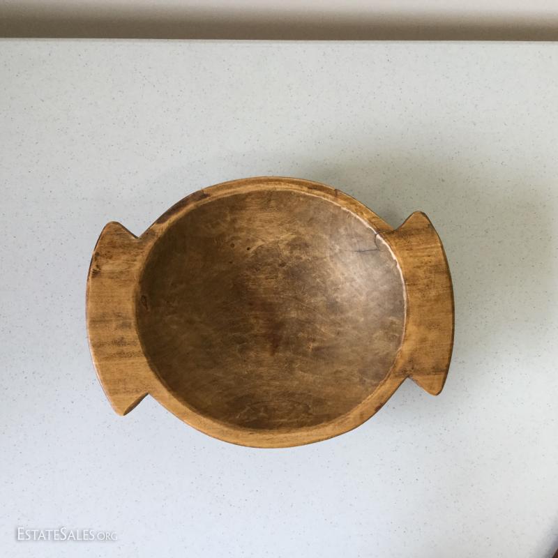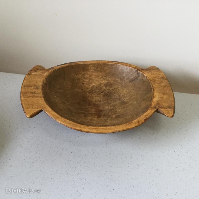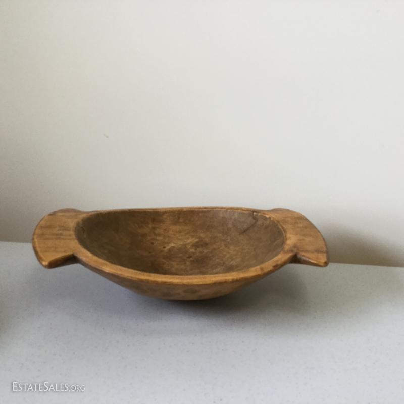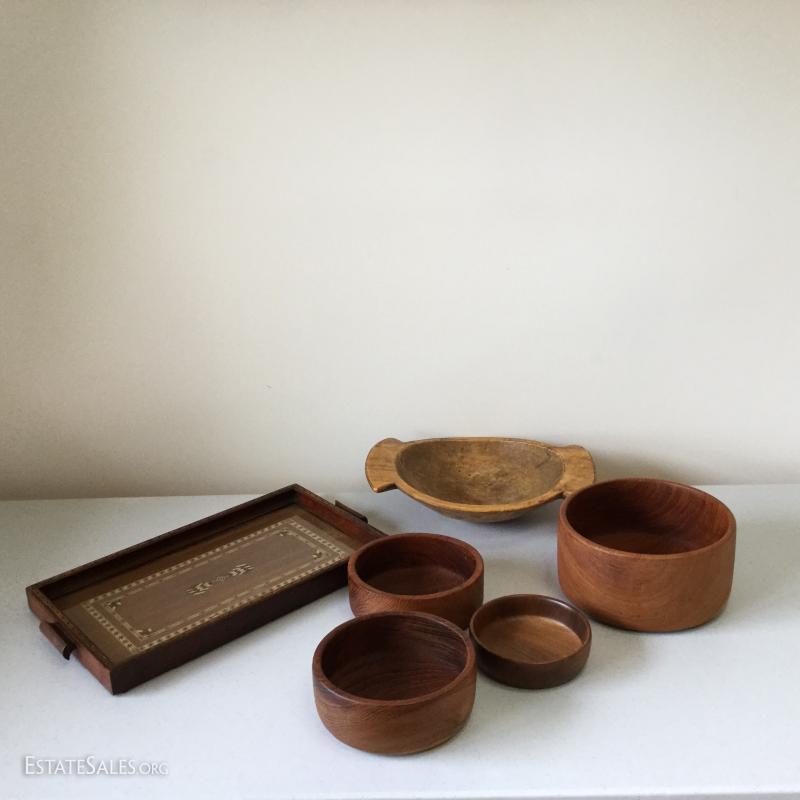 Four wooden serving bowls. Largest 10"d. Wood inlay tray. 21"l x 11"w carved wood decorative bowl.