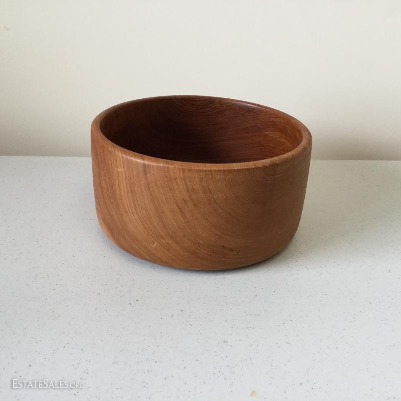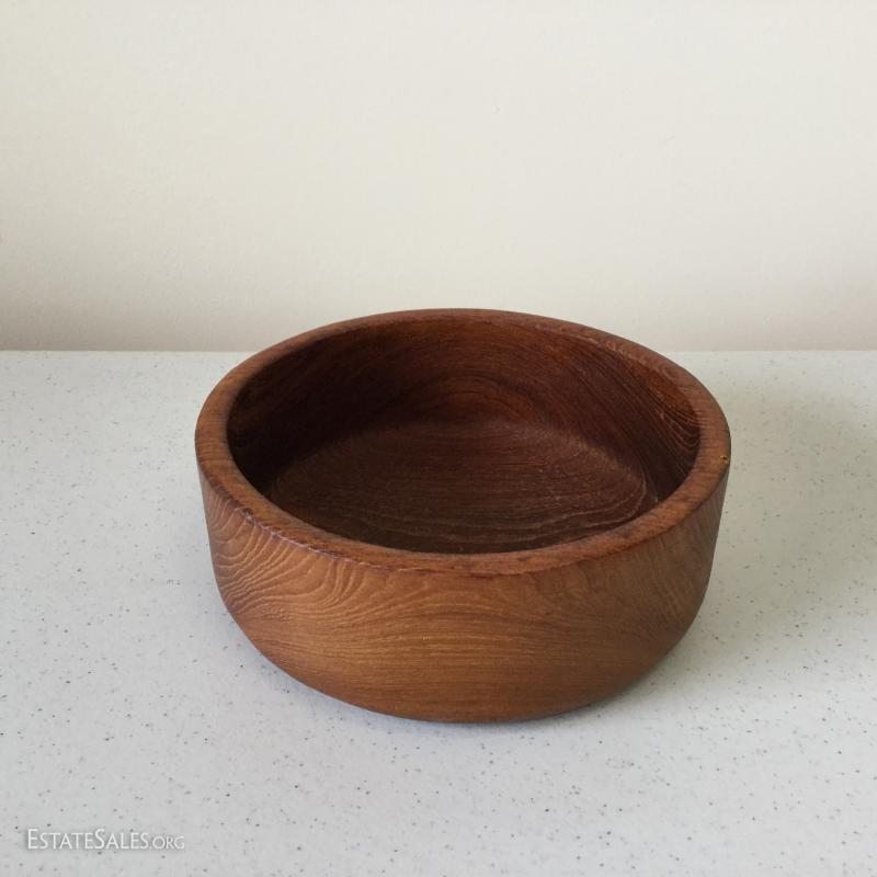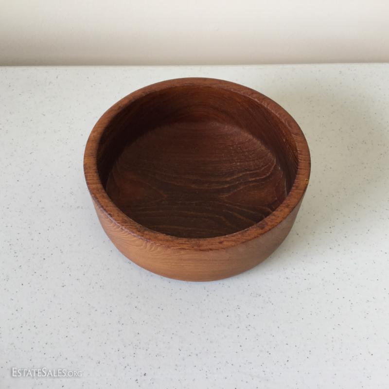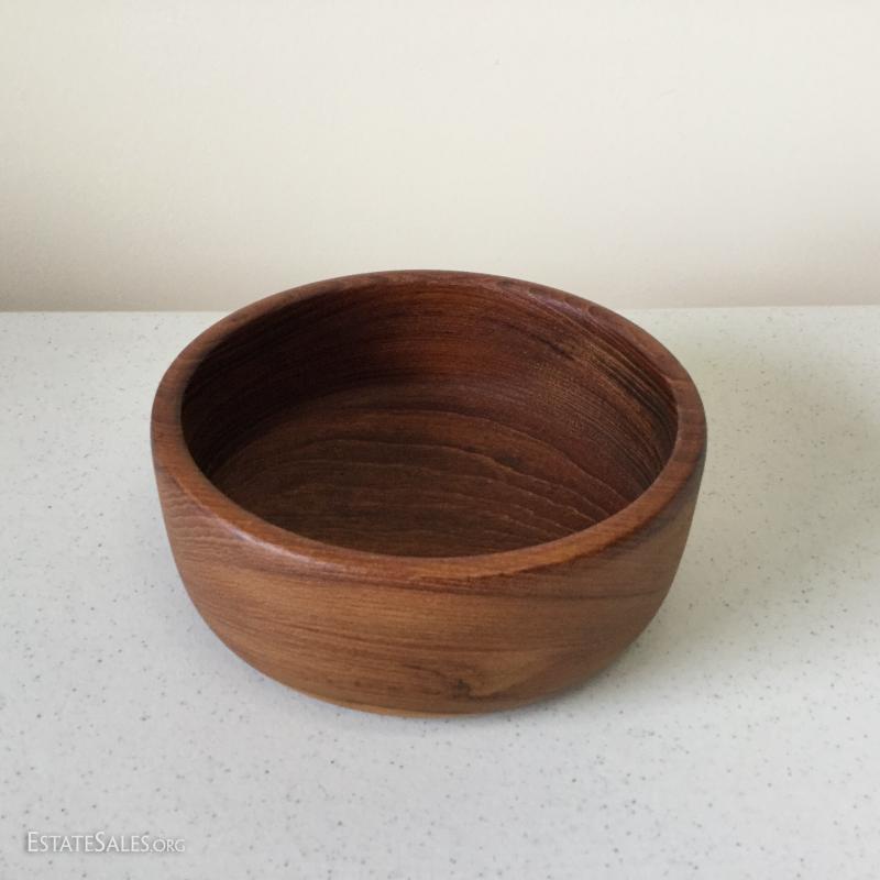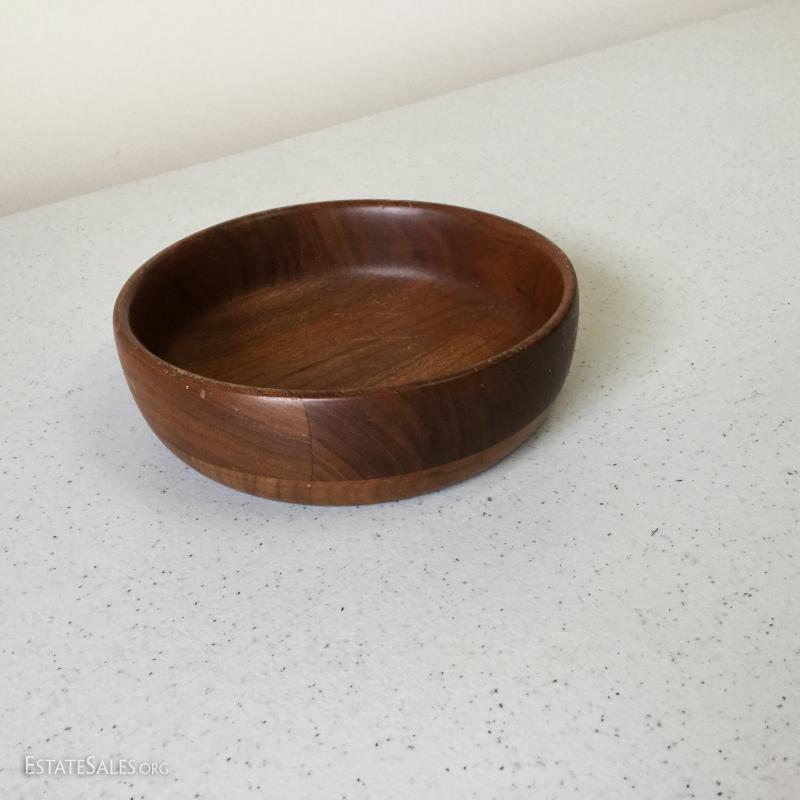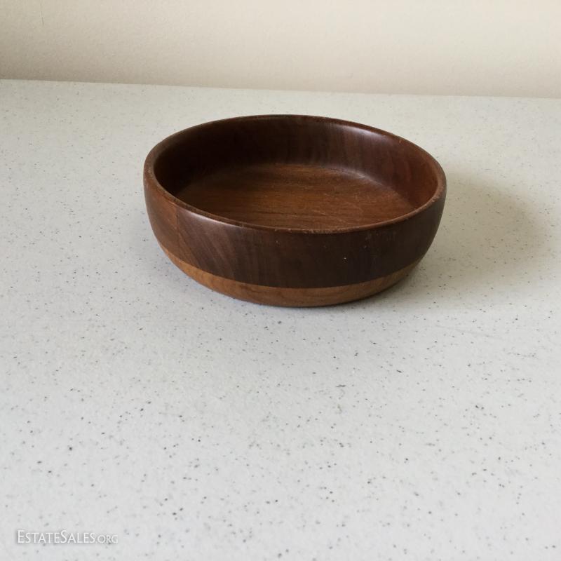 Four wooden serving bowls. Largest 10"d. Wood inlay tray. 21"l x 11"w carved wood decorative bowl.