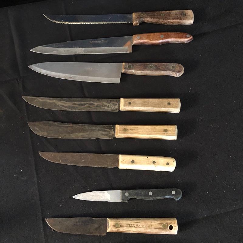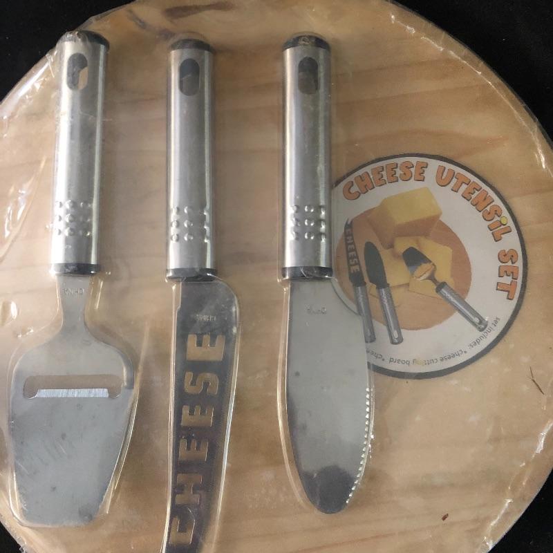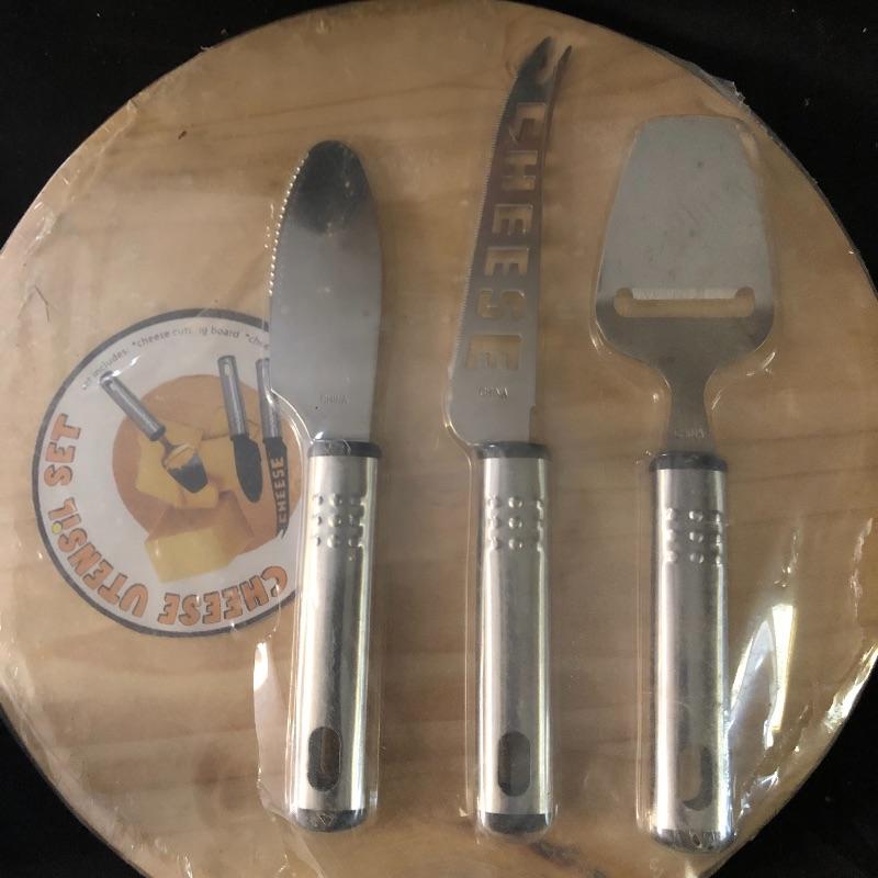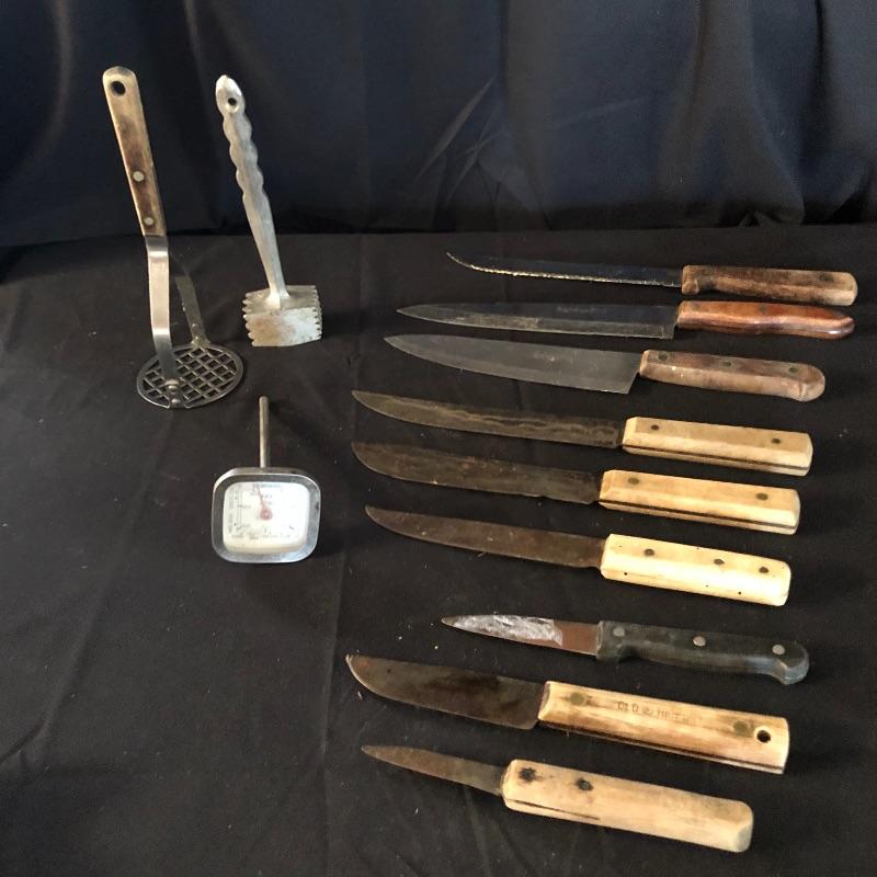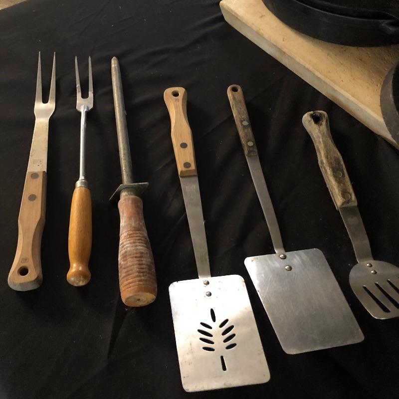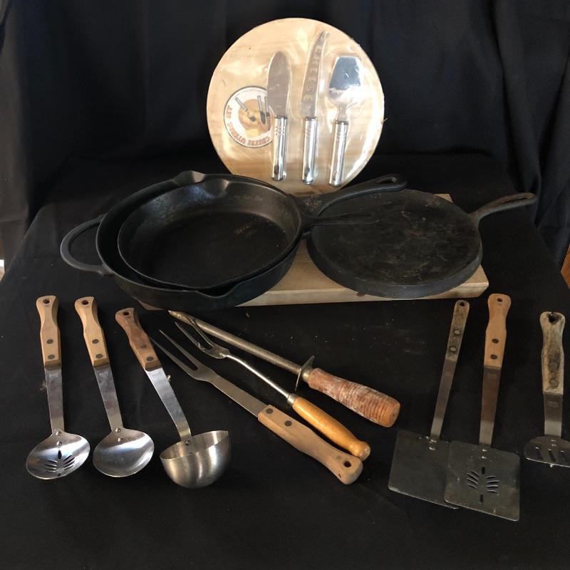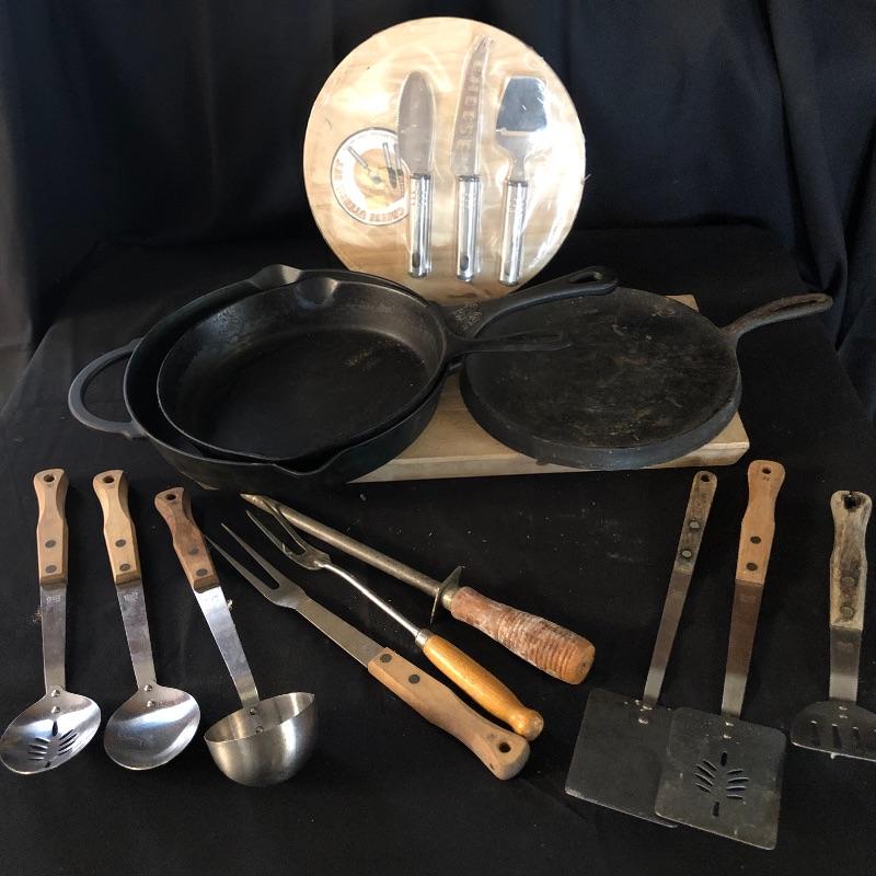 This lot contains a new cheese set with three cheese utensils and board. It also includes three cast iron skillets- the largest is made by Pioneer Woman. This lot also includes numerous utensils, many wood handled. Some of the knives look handmade. Local pick up only.