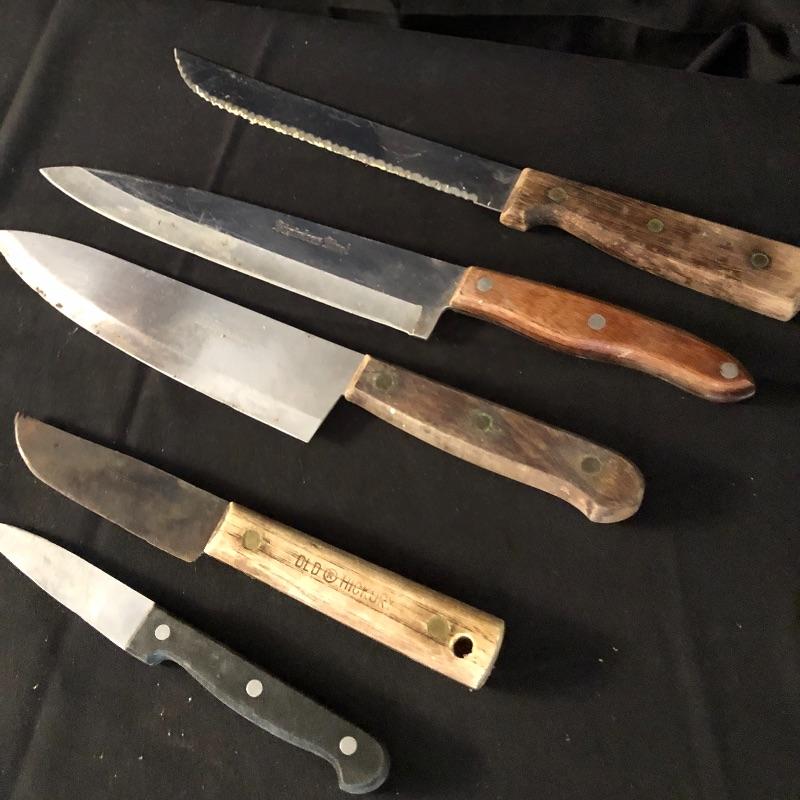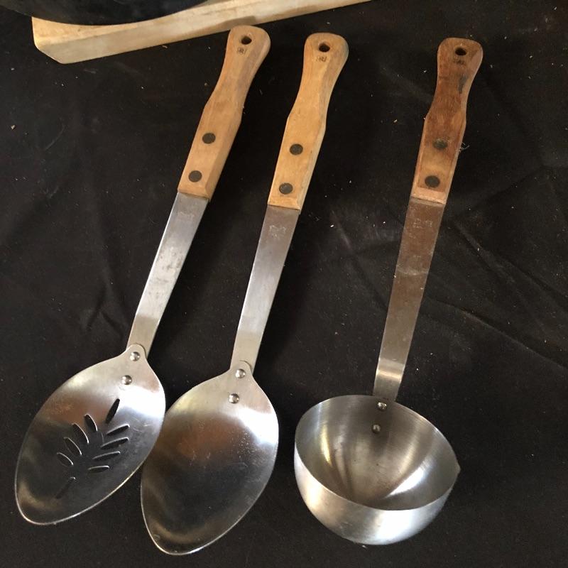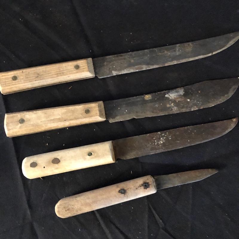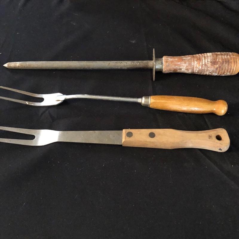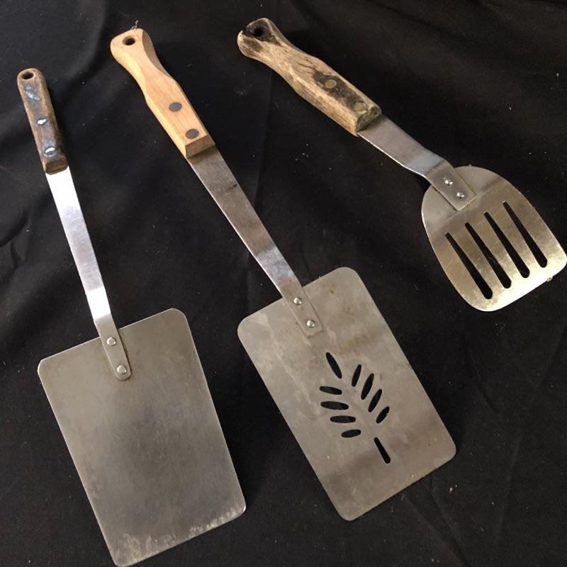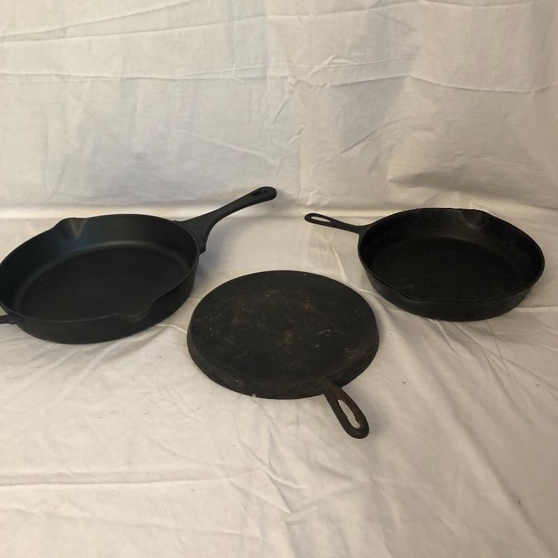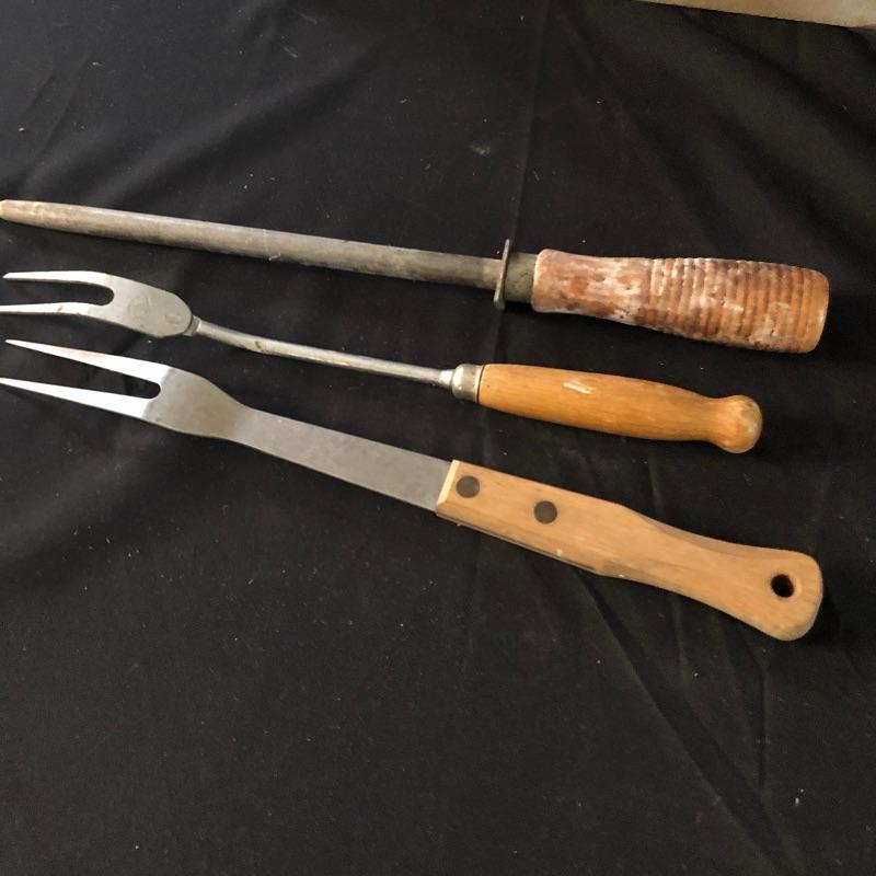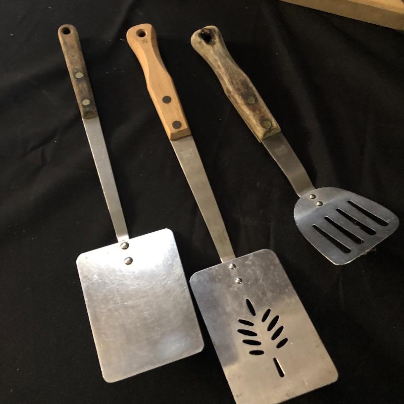 This lot contains a new cheese set with three cheese utensils and board. It also includes three cast iron skillets- the largest is made by Pioneer Woman. This lot also includes numerous utensils, many wood handled. Some of the knives look handmade. Local pick up only.