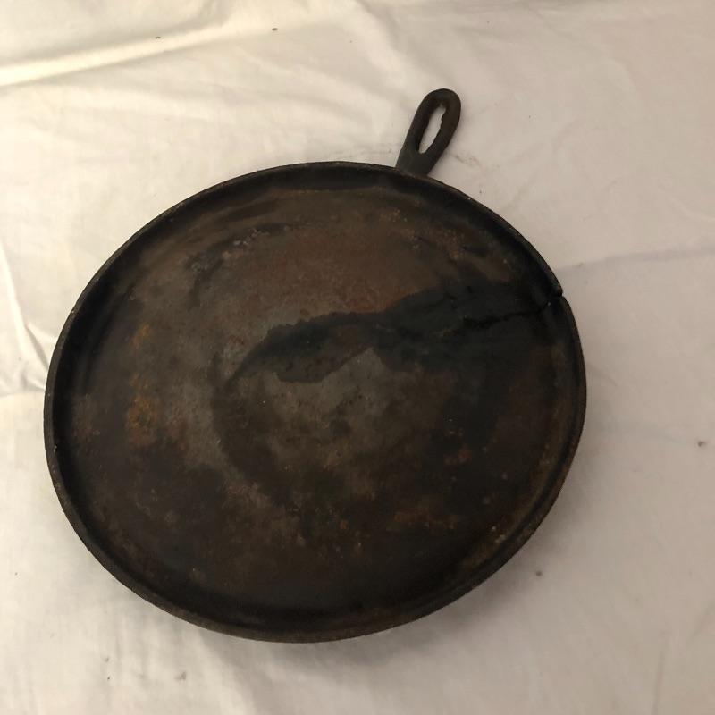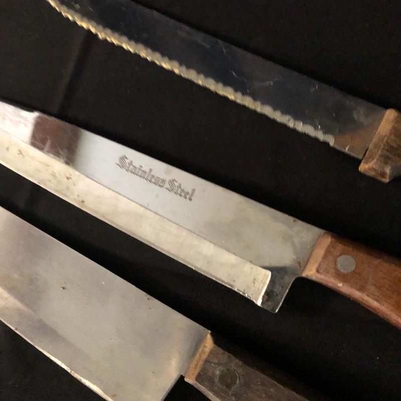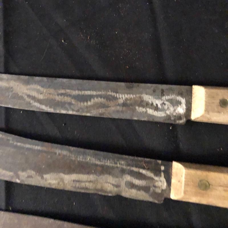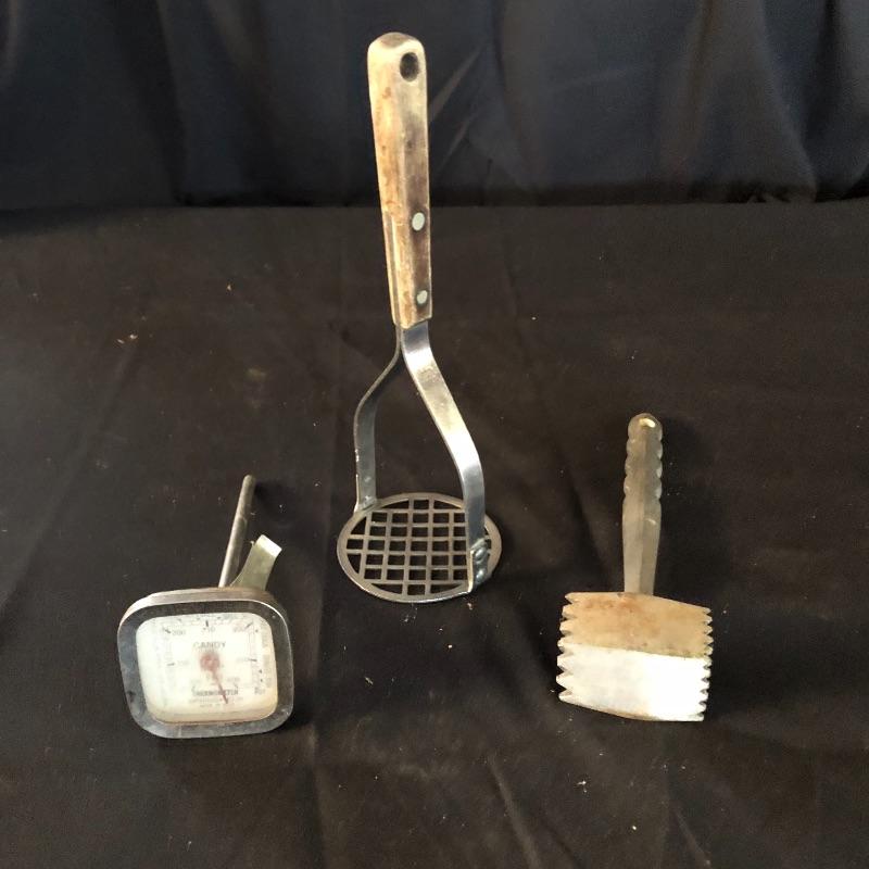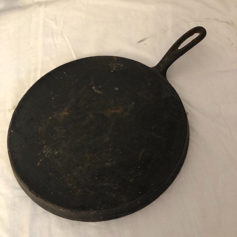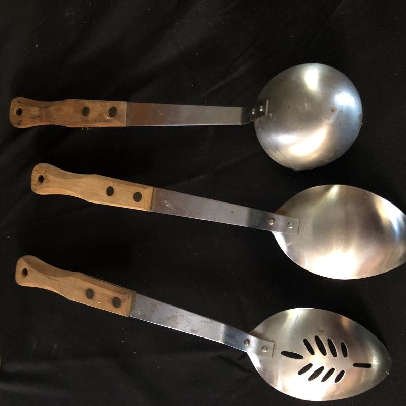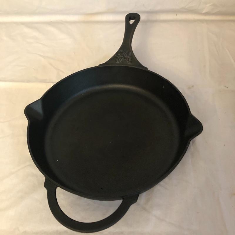 This lot contains a new cheese set with three cheese utensils and board. It also includes three cast iron skillets- the largest is made by Pioneer Woman. This lot also includes numerous utensils, many wood handled. Some of the knives look handmade. Local pick up only.