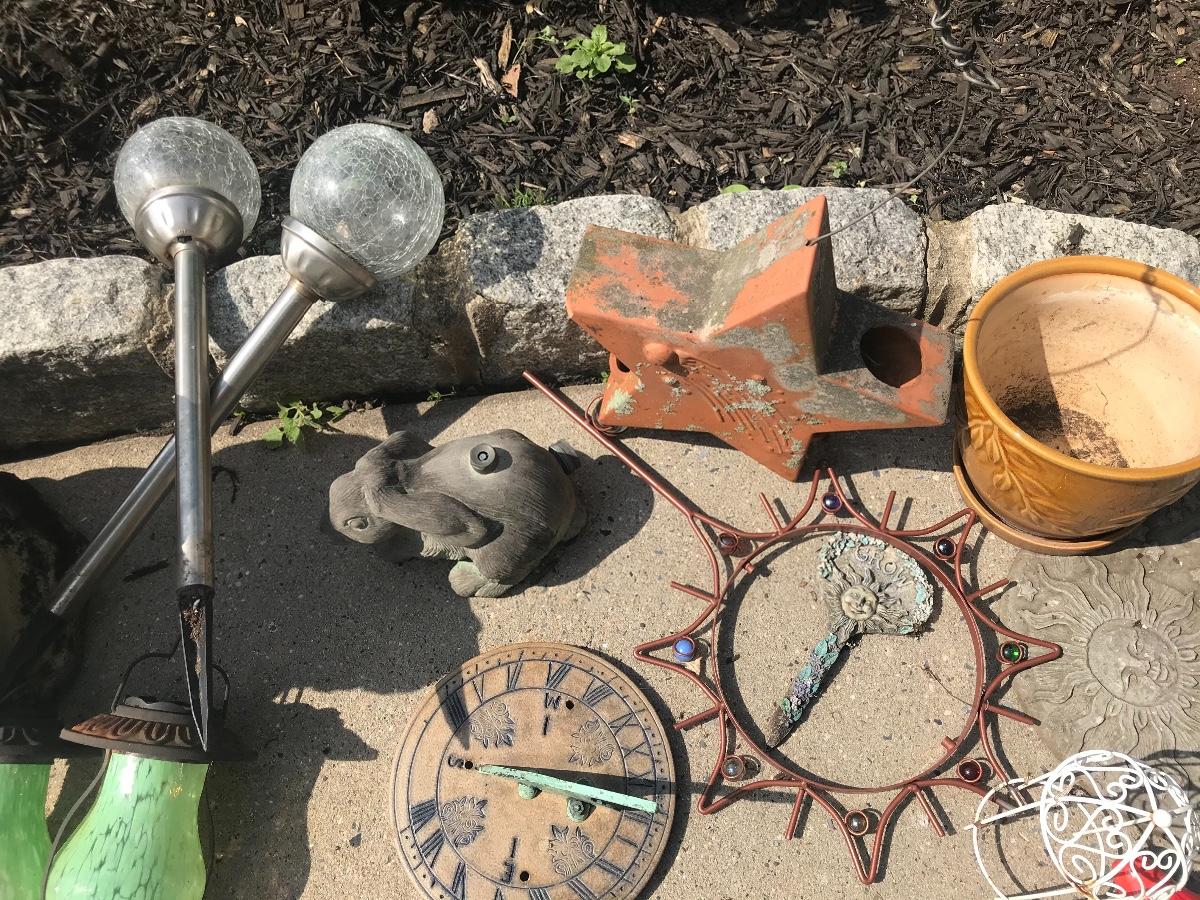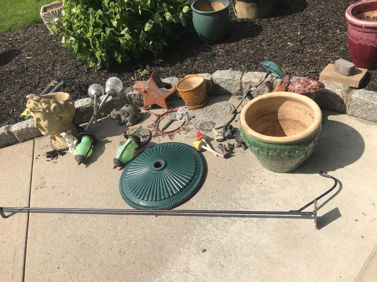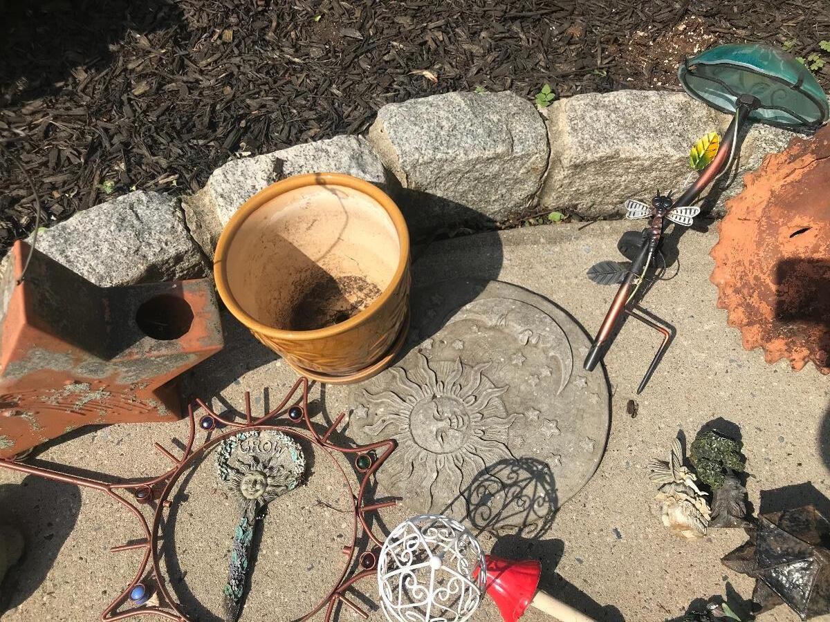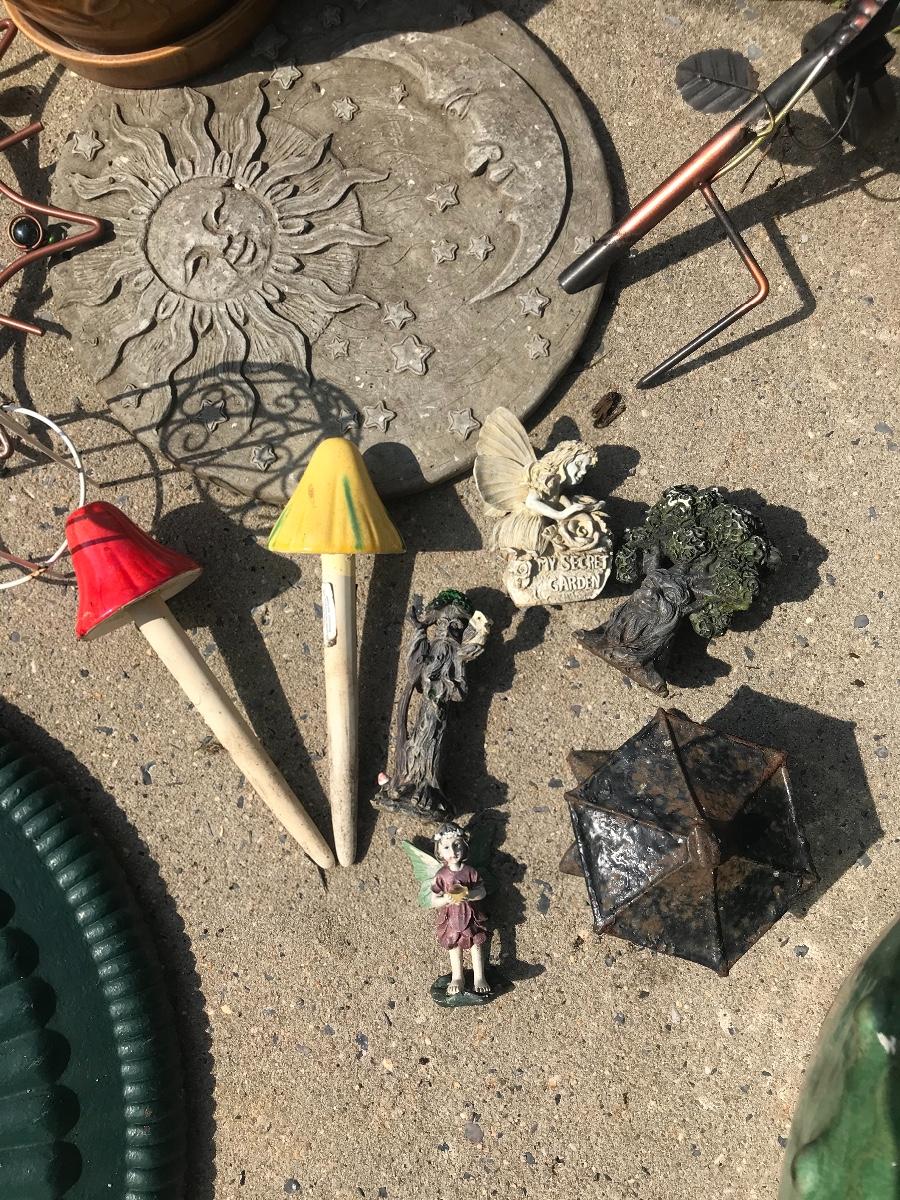 Pottery flower pots, star bird house, solar lanterns, umbrella stand, sundial, composite goddess head, stepping stone, rabbit water sprinkler, and more. The mushroom solar light has been removed. Please see all pictures for content of the lot, condition of the lot, and measurements if taken. Pictures are the best representation of the items listed and items are untested unless indicated in description. Thank you for looking and have fun bidding!