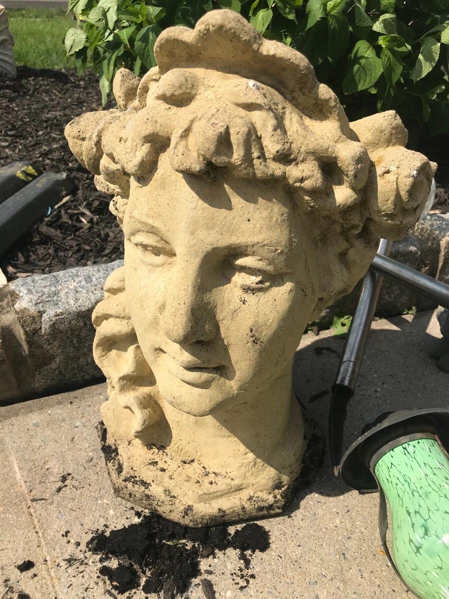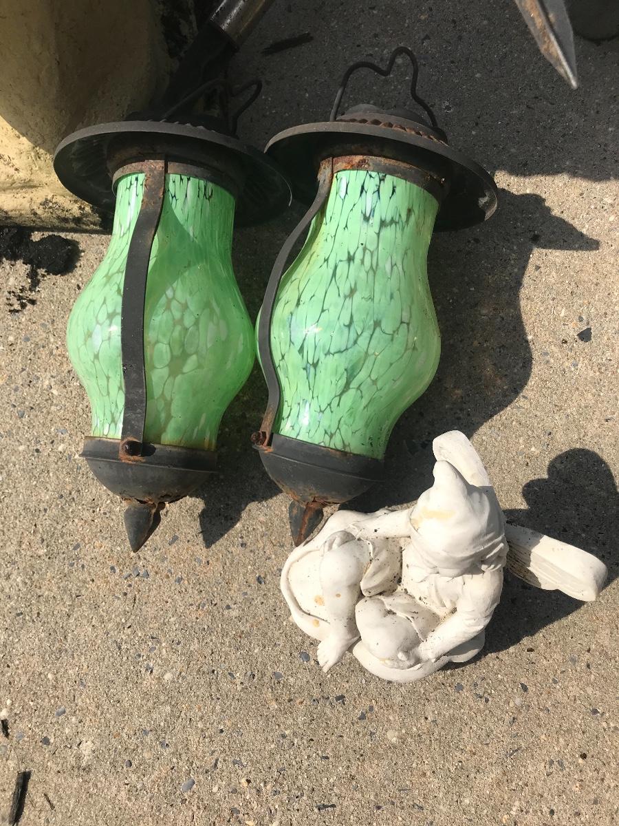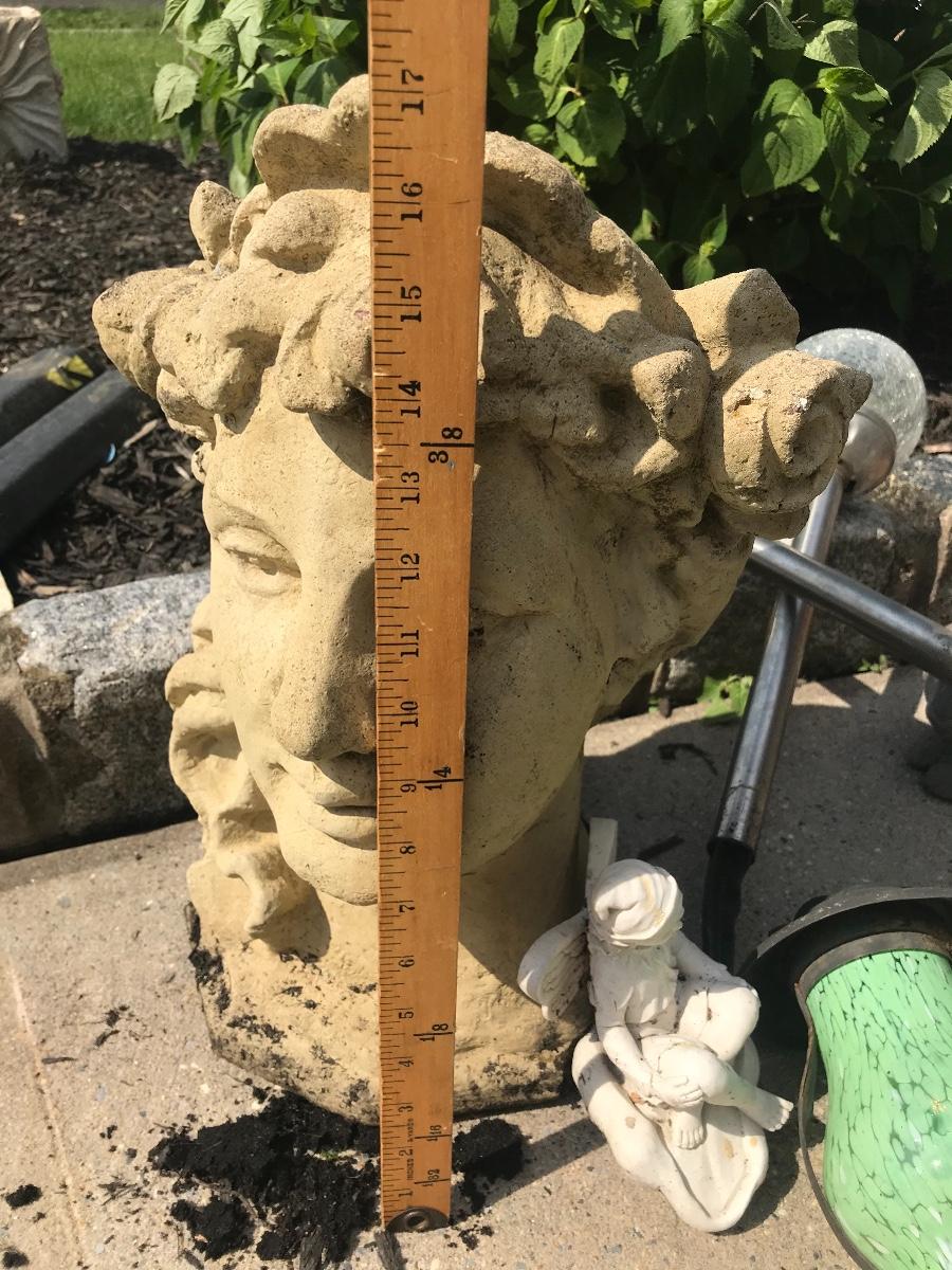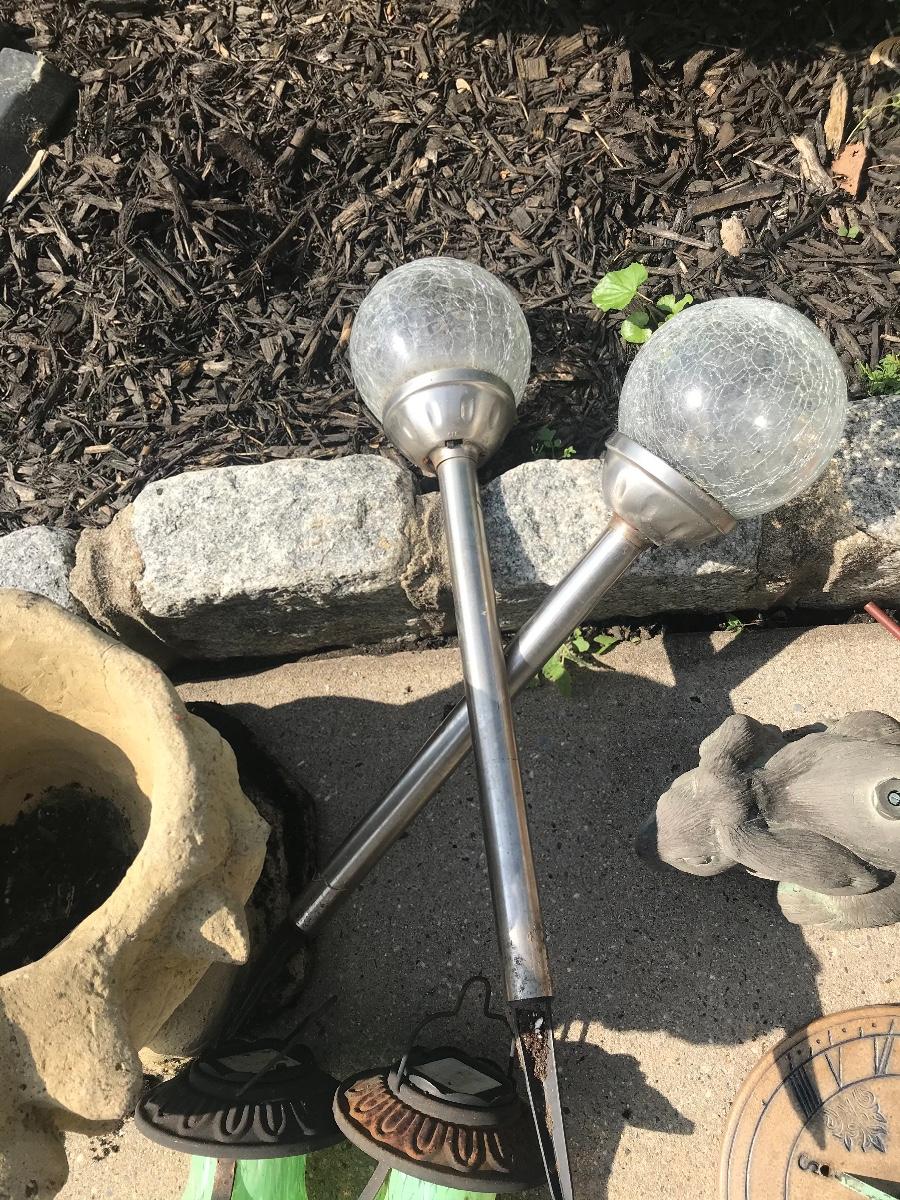 Pottery flower pots, star bird house, solar lanterns, umbrella stand, sundial, composite goddess head, stepping stone, rabbit water sprinkler, and more. The mushroom solar light has been removed. Please see all pictures for content of the lot, condition of the lot, and measurements if taken. Pictures are the best representation of the items listed and items are untested unless indicated in description. Thank you for looking and have fun bidding!
