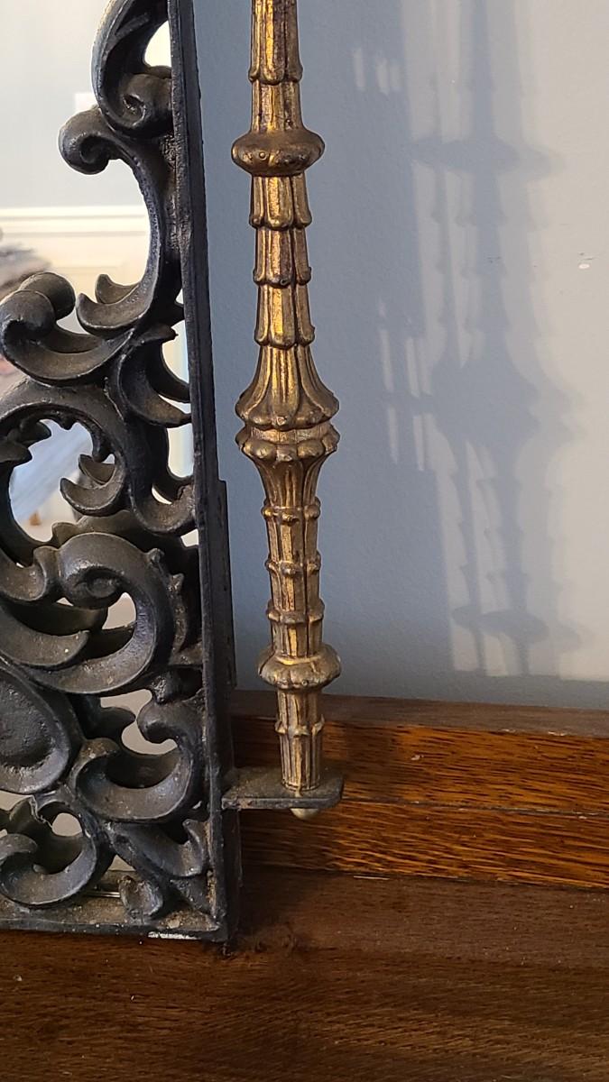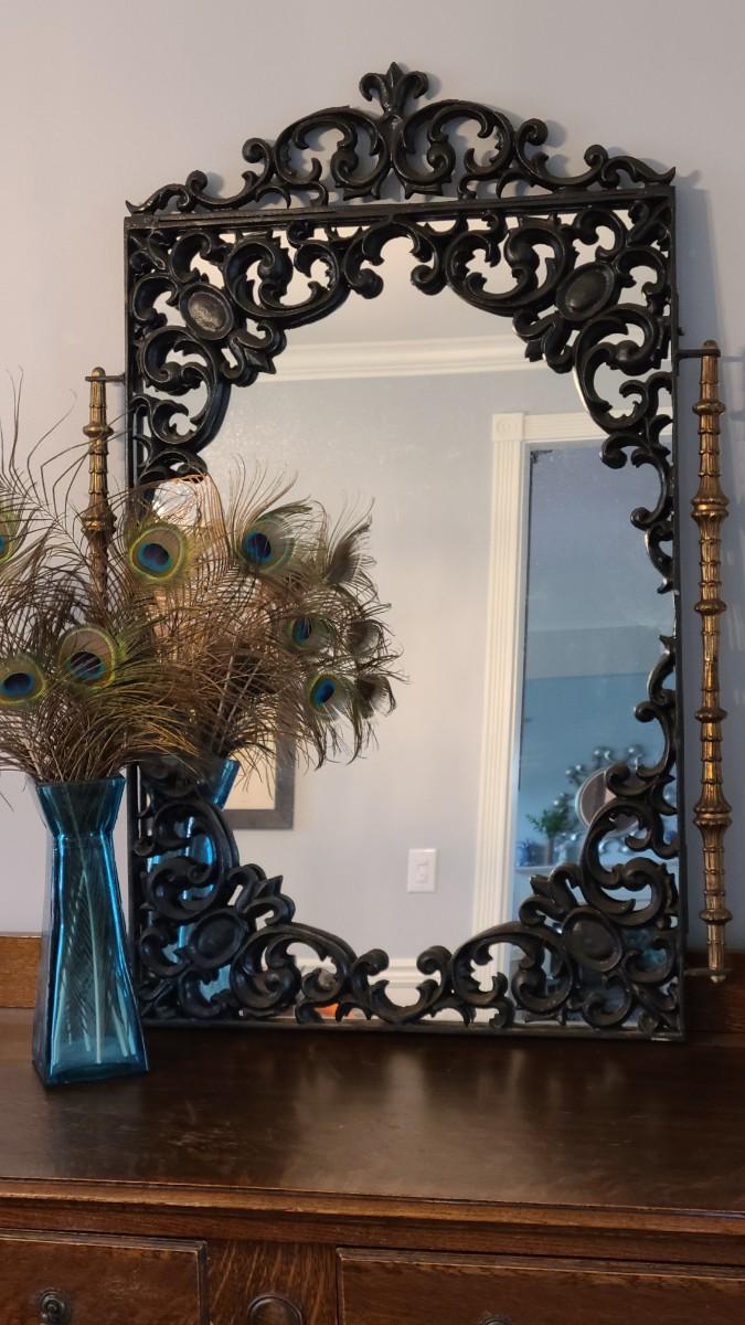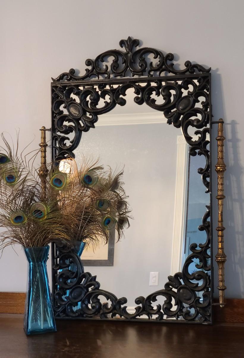 This is an incredible piece, the client added last minute. Looks like gate work. It has a mirror in it, but could be used as a huge frame as well. This is a rare piece. Used as an entryway piece because it is very eye catching. Heavy and solid. Furniture, vase, and peacock feathers not included. 25 wide, 37 inches tall. Mirror shows some wear but fully functional. Can easily be replaced with new mirror and new plywood back. Please see all pictures for content of the lot, condition of the lot, and measurements if taken. Pictures are the best representation of the items listed and items are untested unless indicated in description. Thank you for looking and have fun bidding!