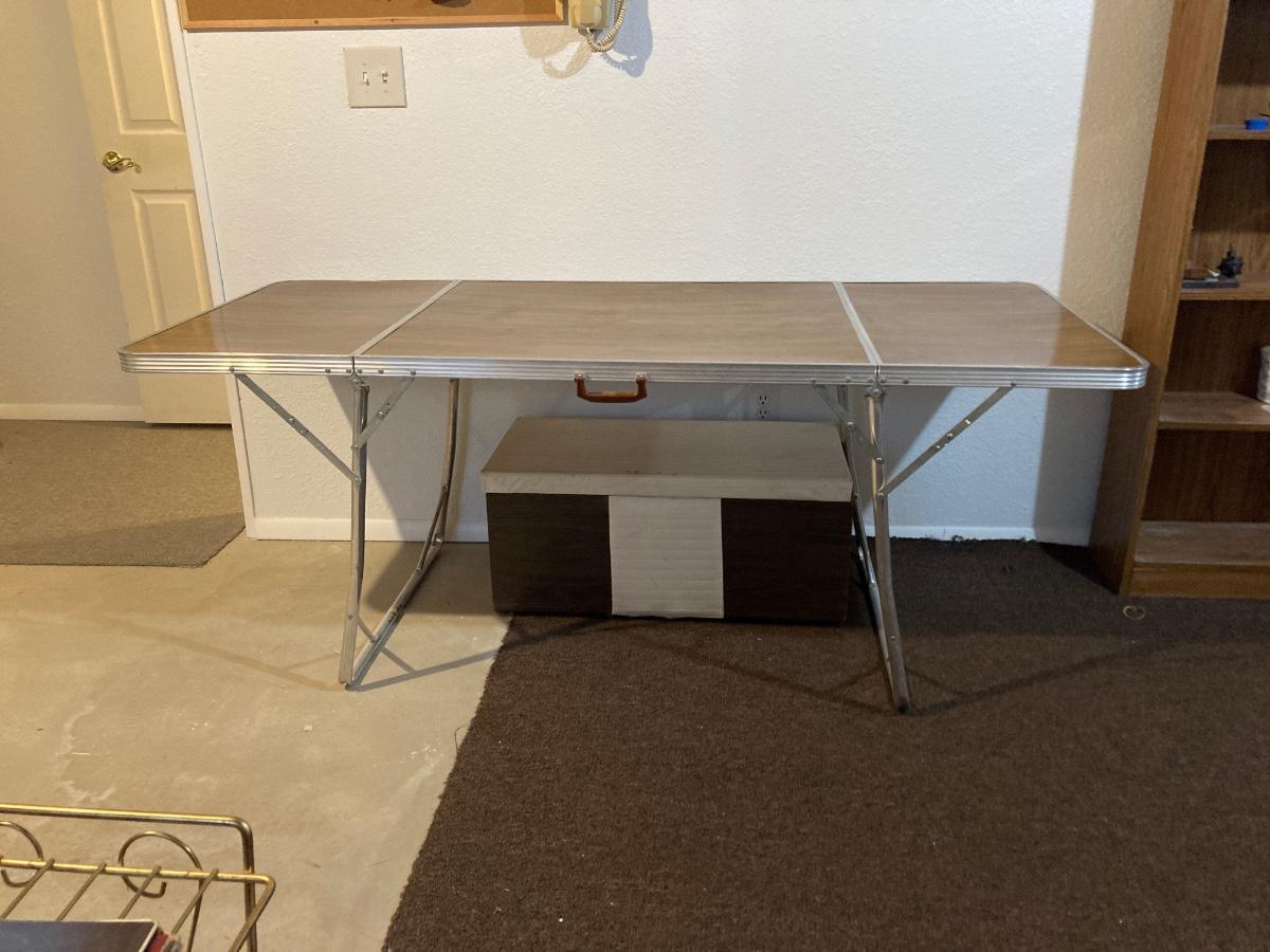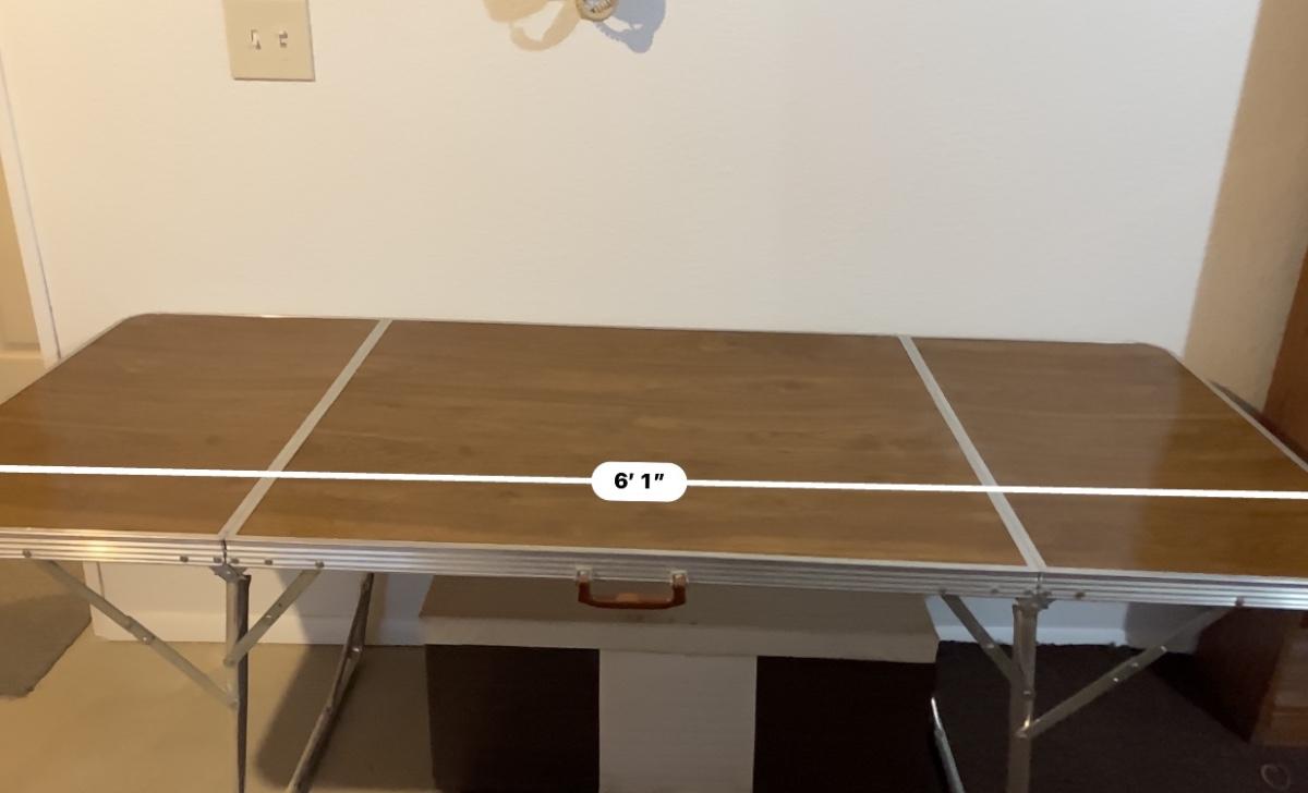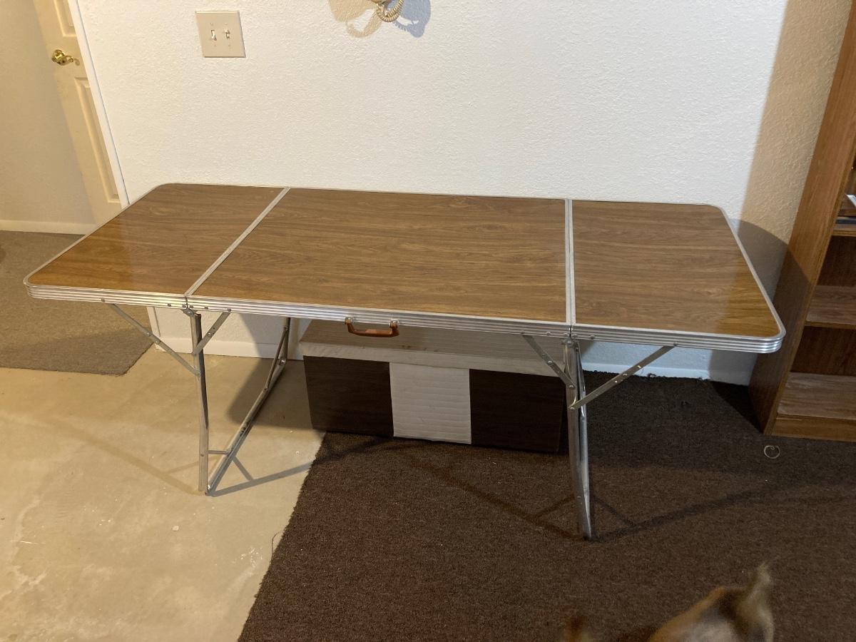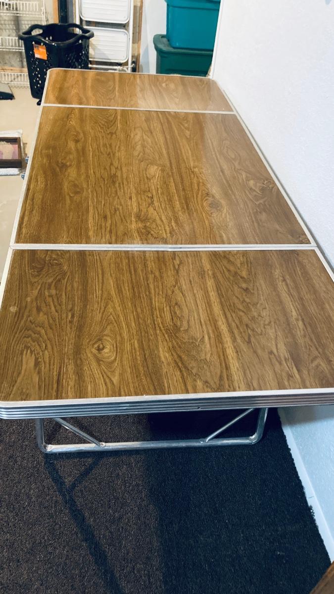 THIS TABLE IS 6’ LONG WHEN FOLDED ALL THE WAY OUT. IT CAN BE USED WITH THE OUTSIDE LEAFS UP OR DOWN