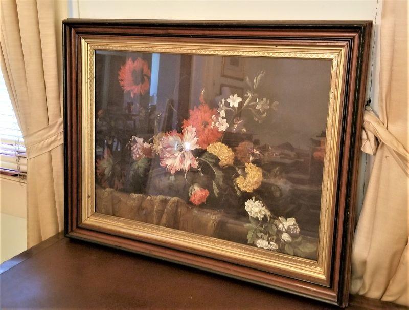 Floral still life print - beautiful, deep colors - in an antique frame. Heavy. Measures 33" across and 25" tall. Good condition.