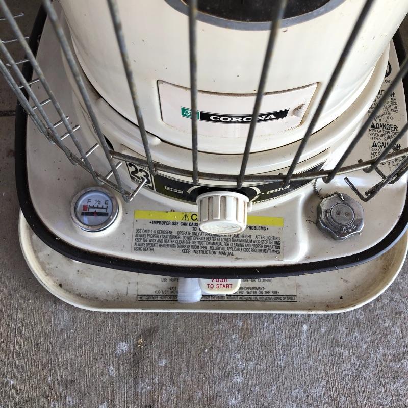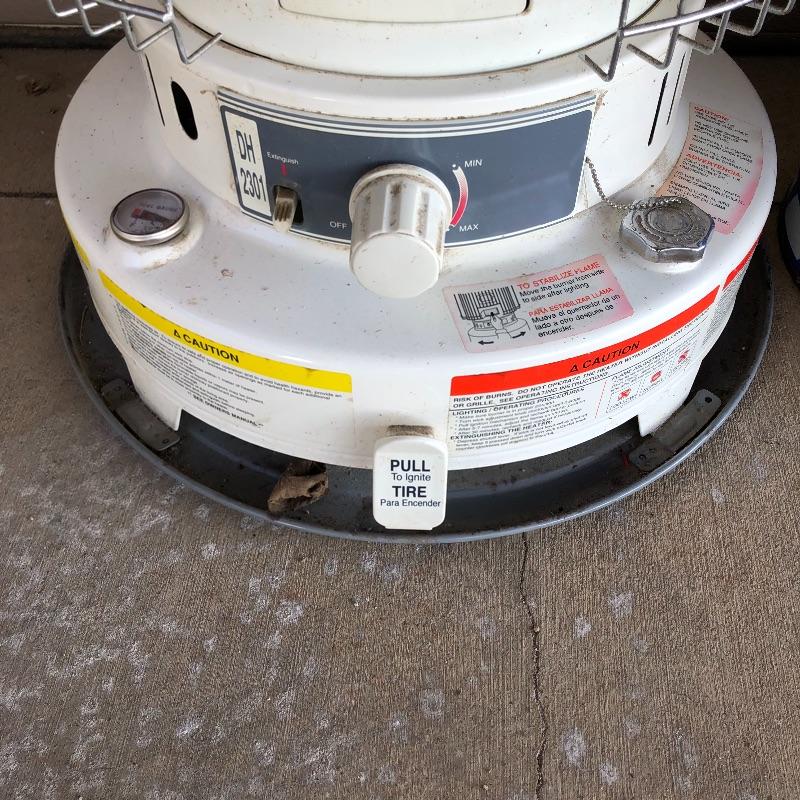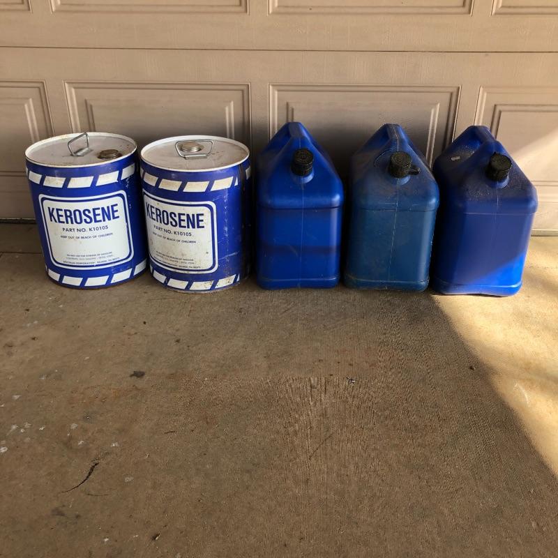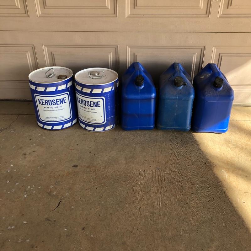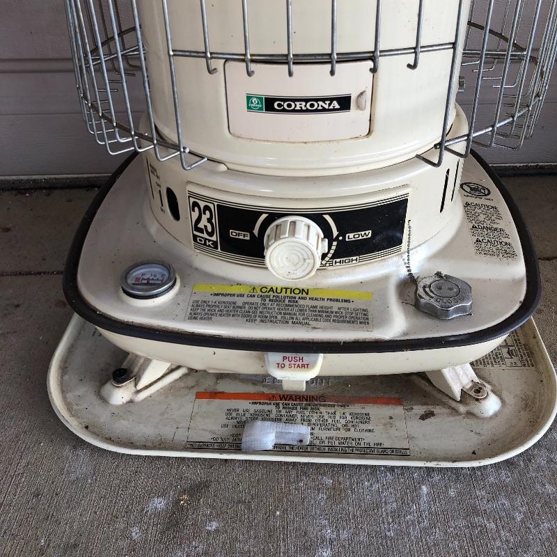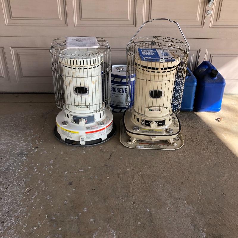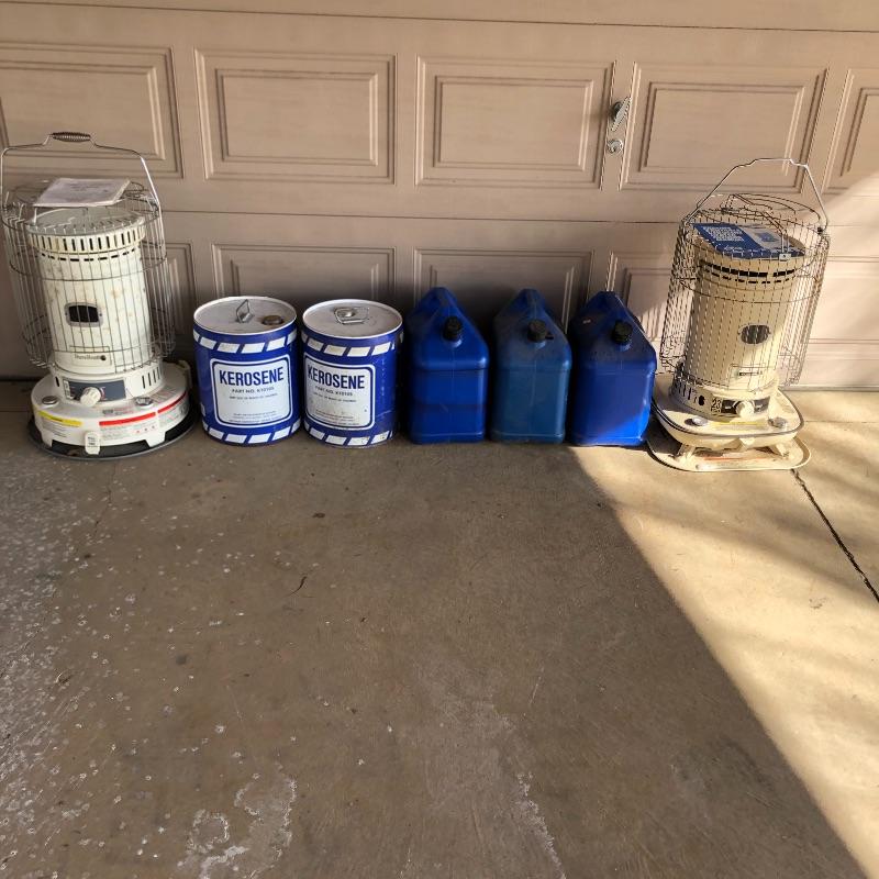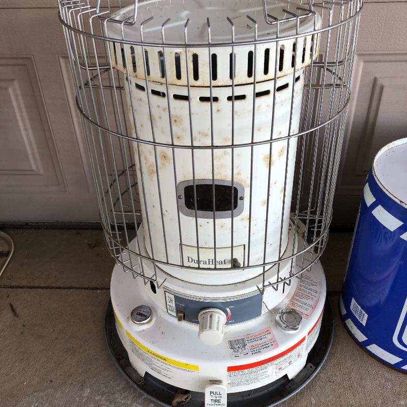 Keep you garage warm this winter with this pair of kerosene heaters. Lot includes Corona heater, Dura Heat heater and three plastic and two metal kerosene cans. Four cans have liquid in them.