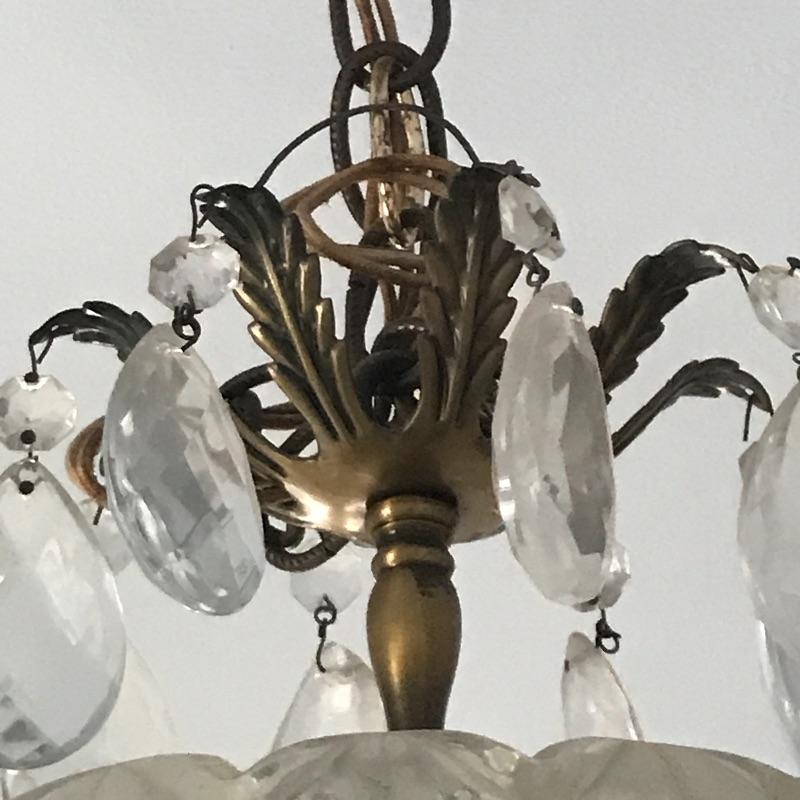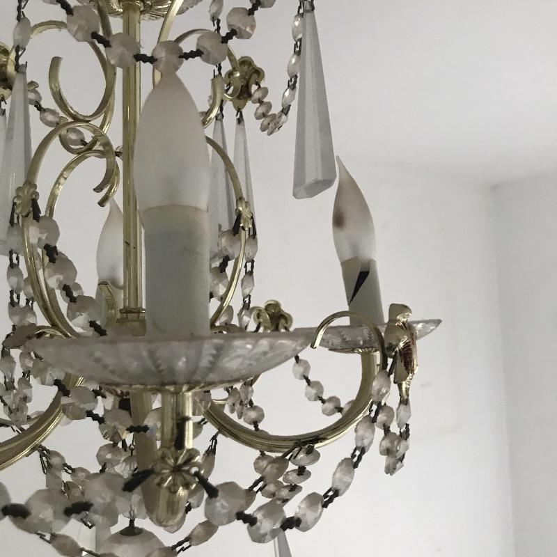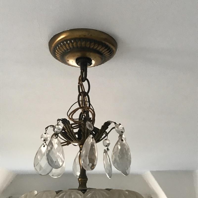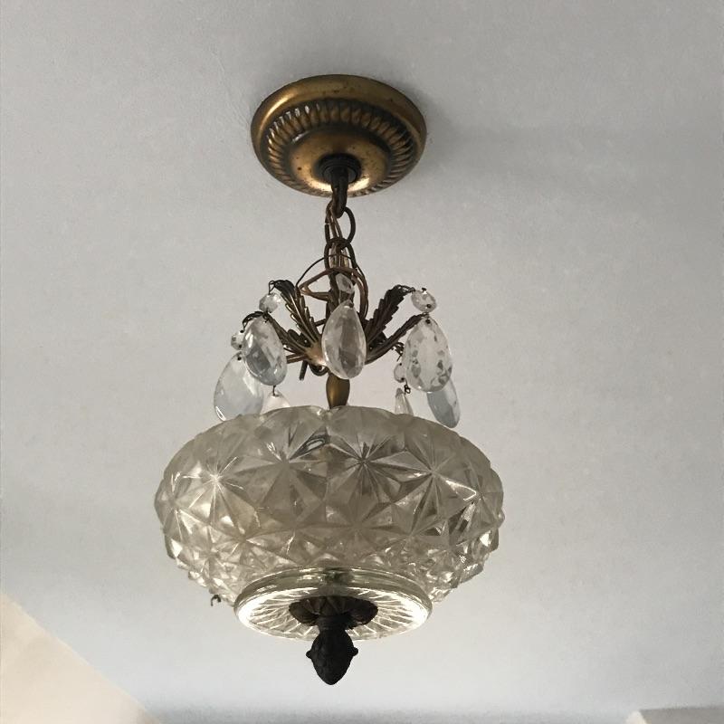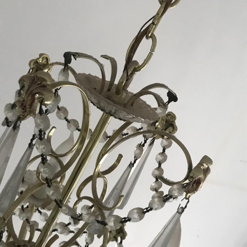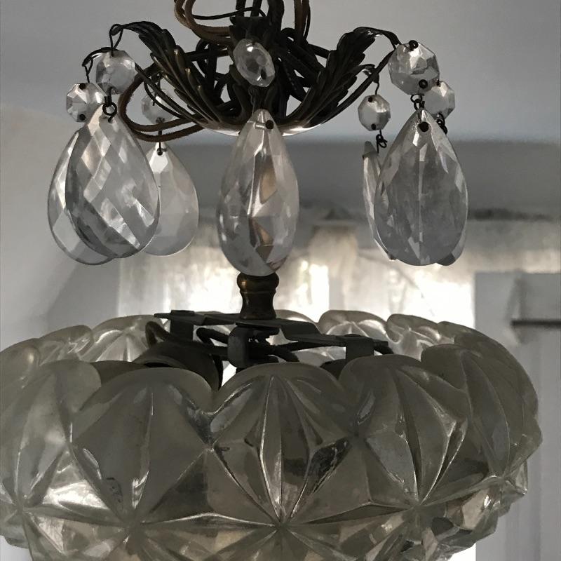 Two cute vintage Chandeliers for your bedroom or hallway. One has a classic look but in a smaller more manageable scale. Metal parts are in good condition and all crystal pieces are in place. One lightbulb plastic holder has tear. Measures 15”d x 30”from ceiling. Second chandelier is nice heavy glass piece under a more delicate tier of crystals. This unique piece is lovely and measures 9” d and 16” from ceiling. Both pieces will need to be removed by buyer. Electrical is still in place. No shipping.