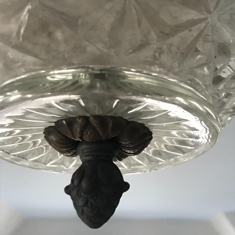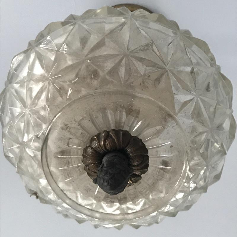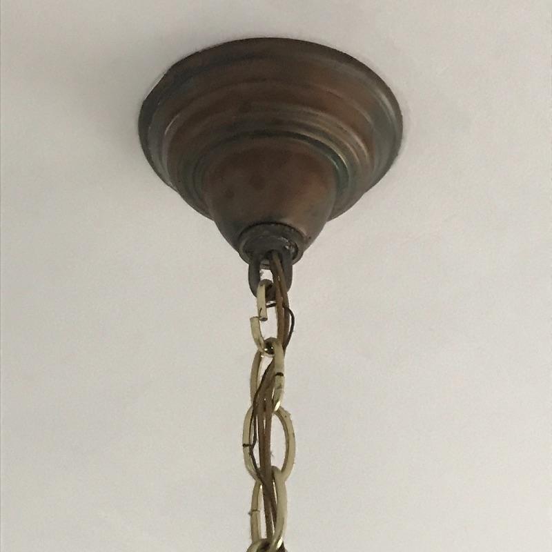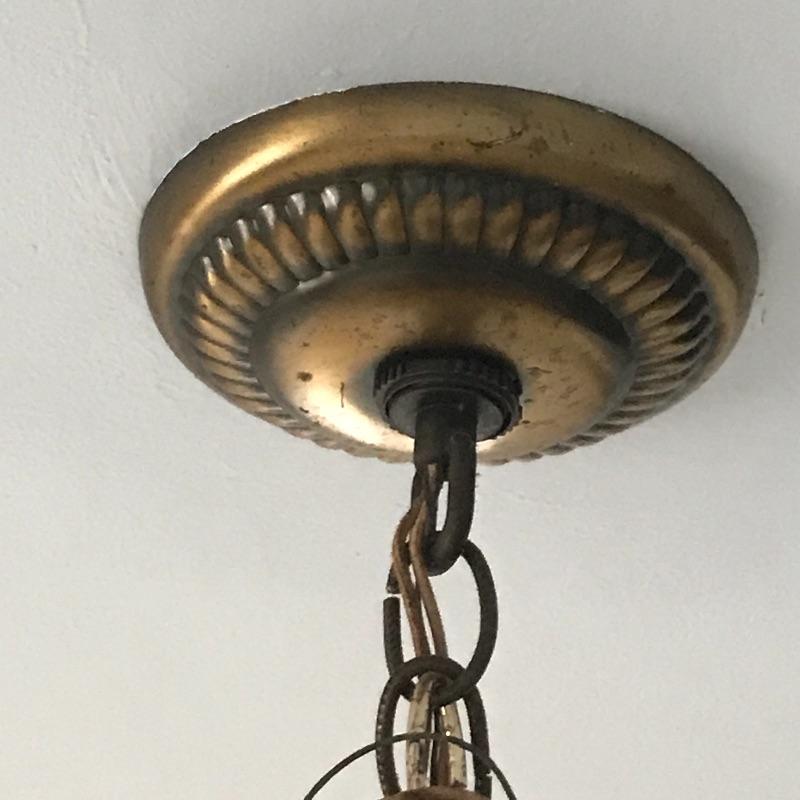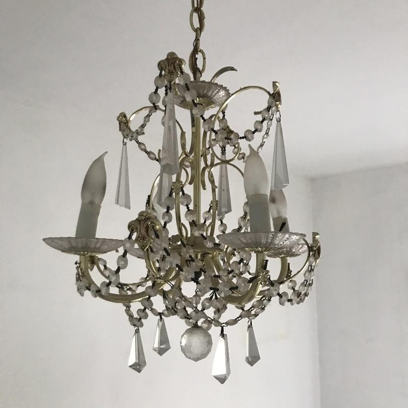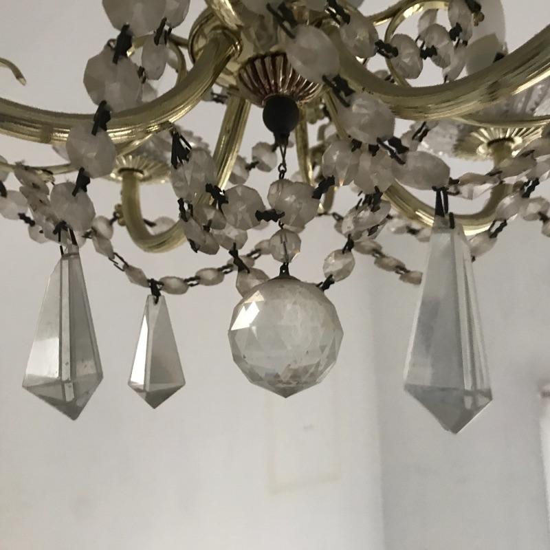 Two cute vintage Chandeliers for your bedroom or hallway. One has a classic look but in a smaller more manageable scale. Metal parts are in good condition and all crystal pieces are in place. One lightbulb plastic holder has tear. Measures 15”d x 30”from ceiling. Second chandelier is nice heavy glass piece under a more delicate tier of crystals. This unique piece is lovely and measures 9” d and 16” from ceiling. Both pieces will need to be removed by buyer. Electrical is still in place. No shipping.