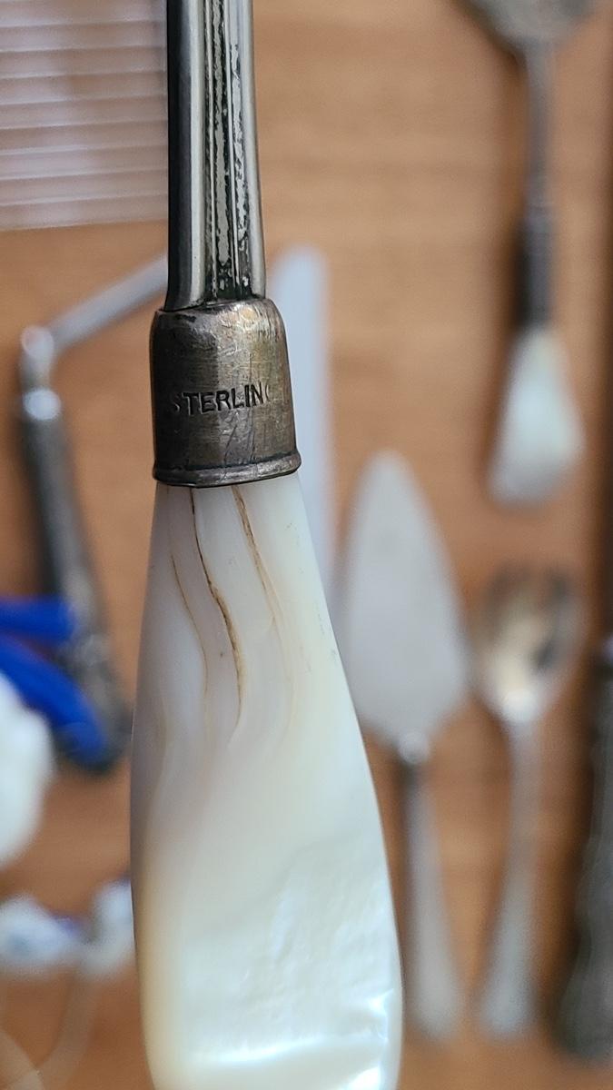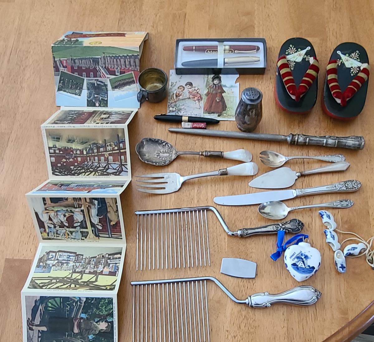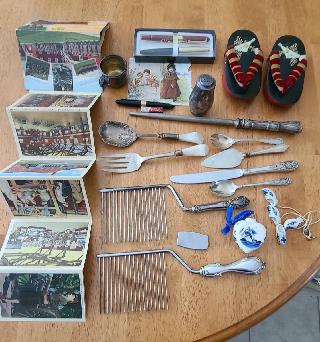 This is a lot of antique/vintage collectibles including: Sterling silver spoon, sterling silver handled serving pieces, an advertising Bra matchbook, vintage military postcards, unique silver-plate and glass shaker, 14K nib Sheaffers Fountain Pen, and more! Please see all pictures for content of the lot, condition of the lot, and measurements if taken. Pictures are the best representation of the items listed and items are untested unless indicated in description. Thank you for looking and have fun bidding!