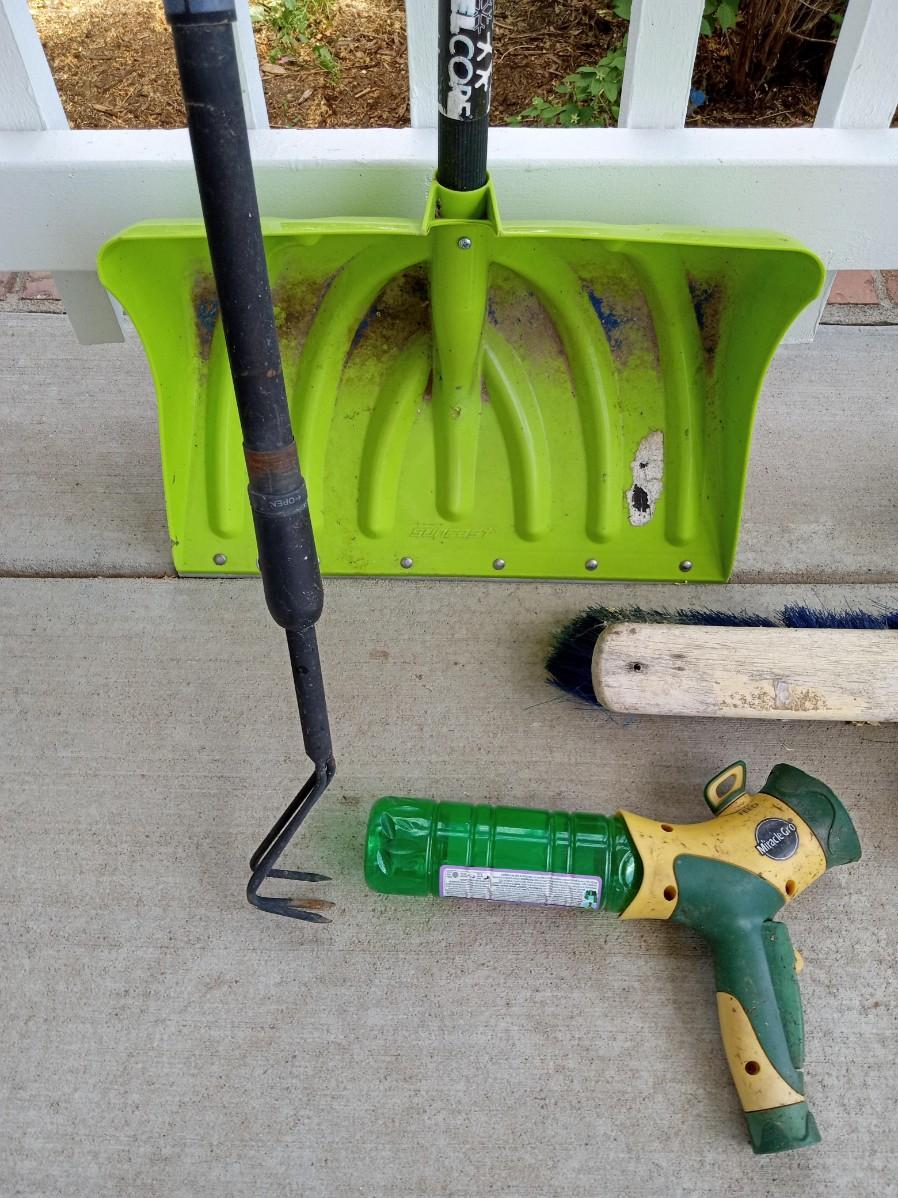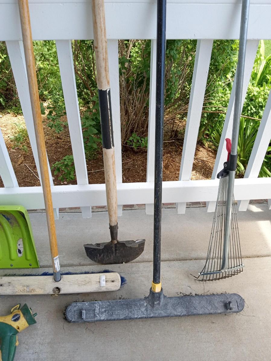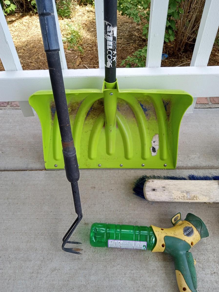 SNOW SHOVEL, 2 PUSH BROOMS, HOE, 3 TINE CULTIVATOR, ADJUSTABLE RACK AND A MIRACLE GROW SPRAYER