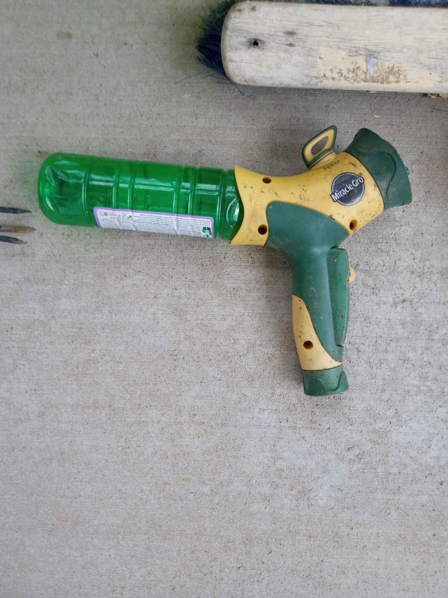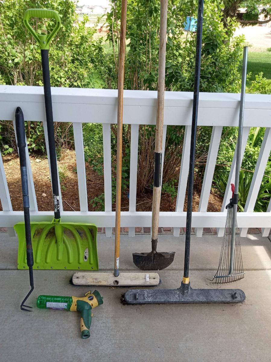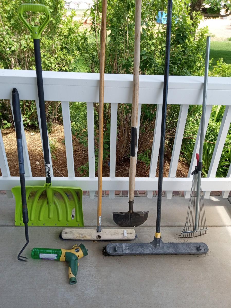 SNOW SHOVEL, 2 PUSH BROOMS, HOE, 3 TINE CULTIVATOR, ADJUSTABLE RACK AND A MIRACLE GROW SPRAYER
