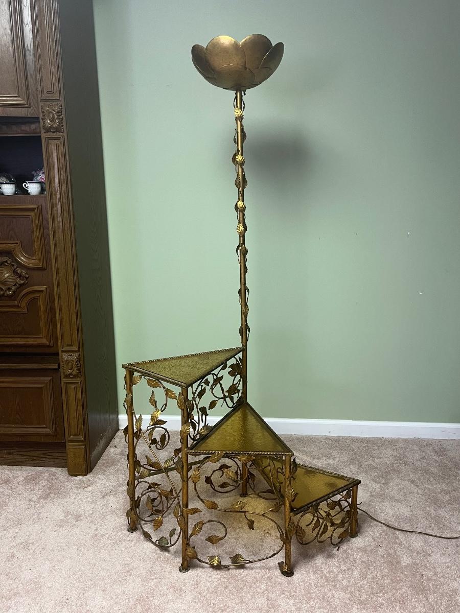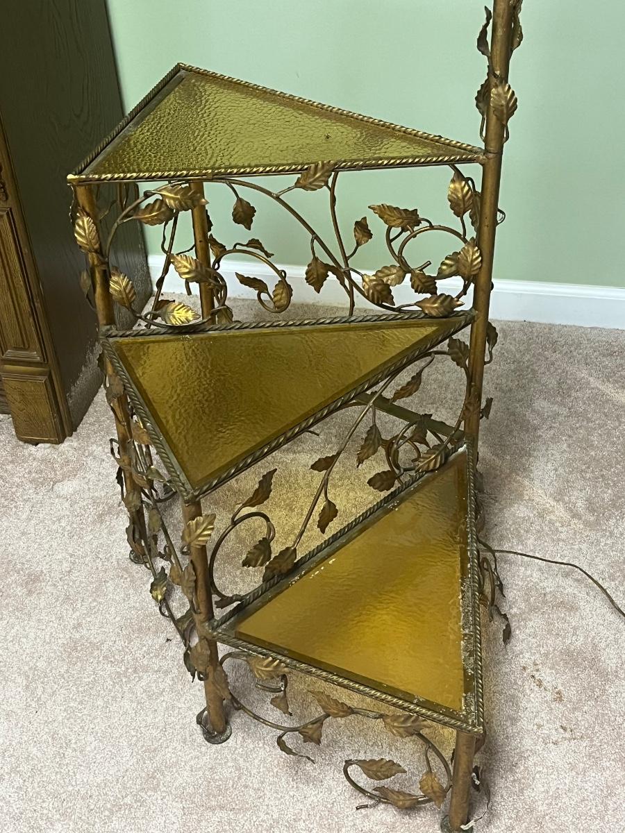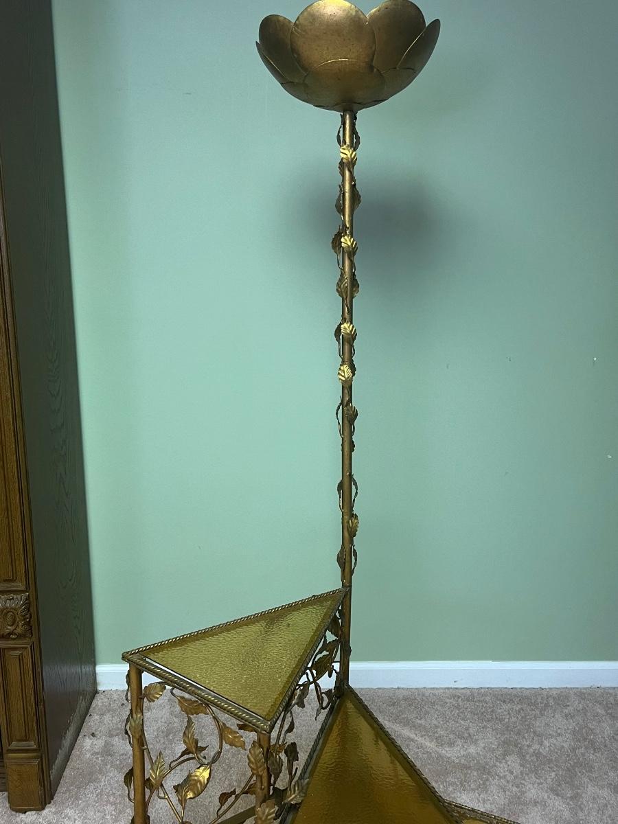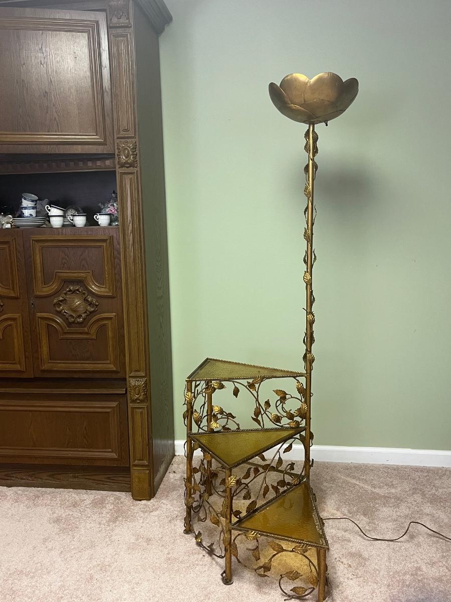 Vintage metal working floor lamp with spiral glass top table ( 19"x30"x64".) It is painted gold but could easily be painted.