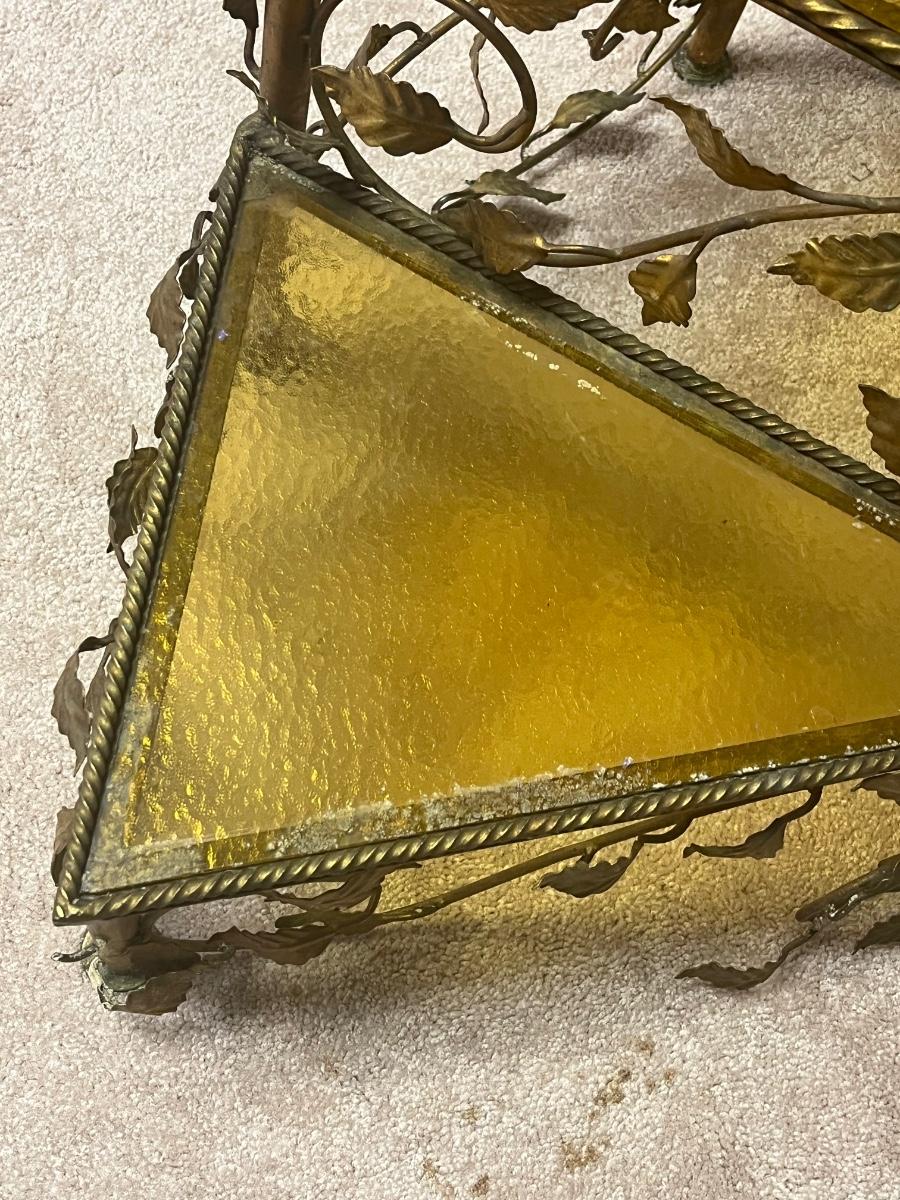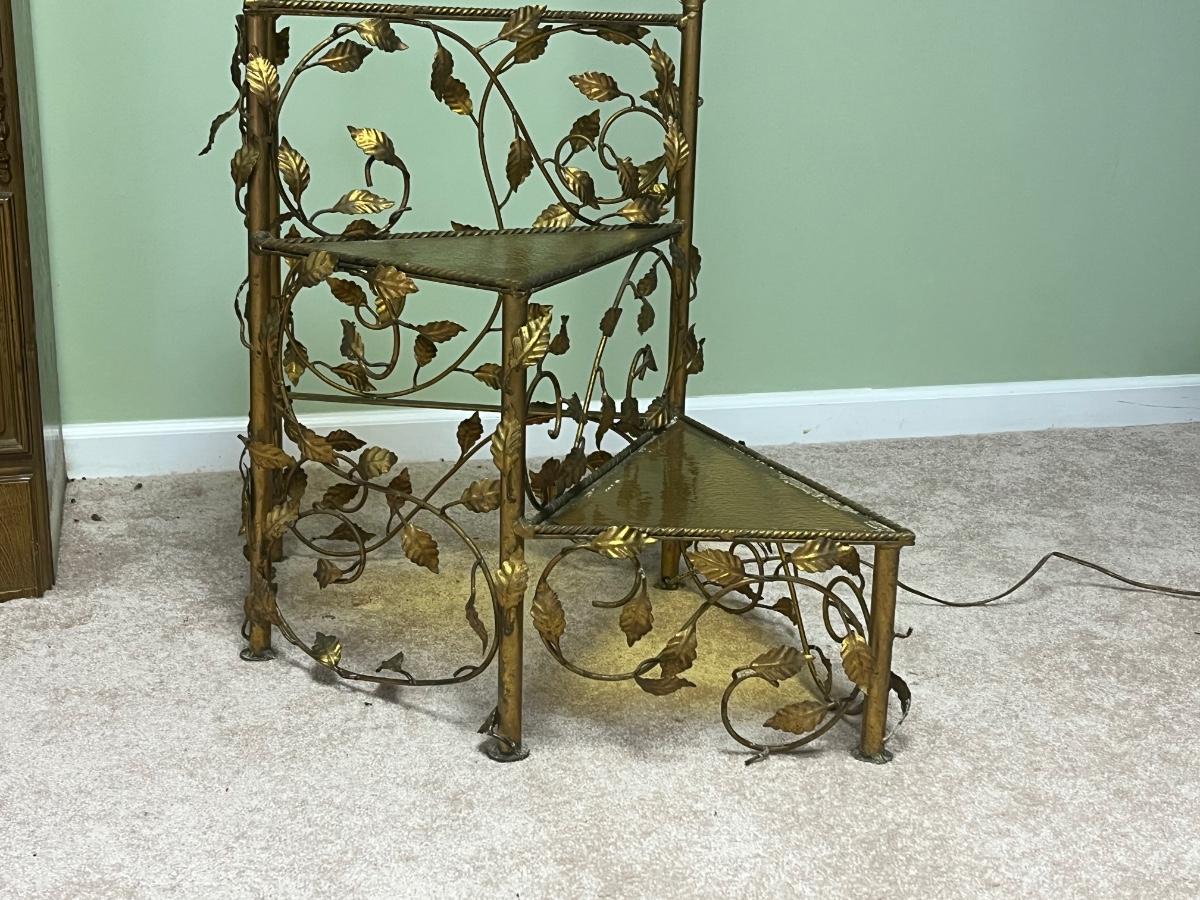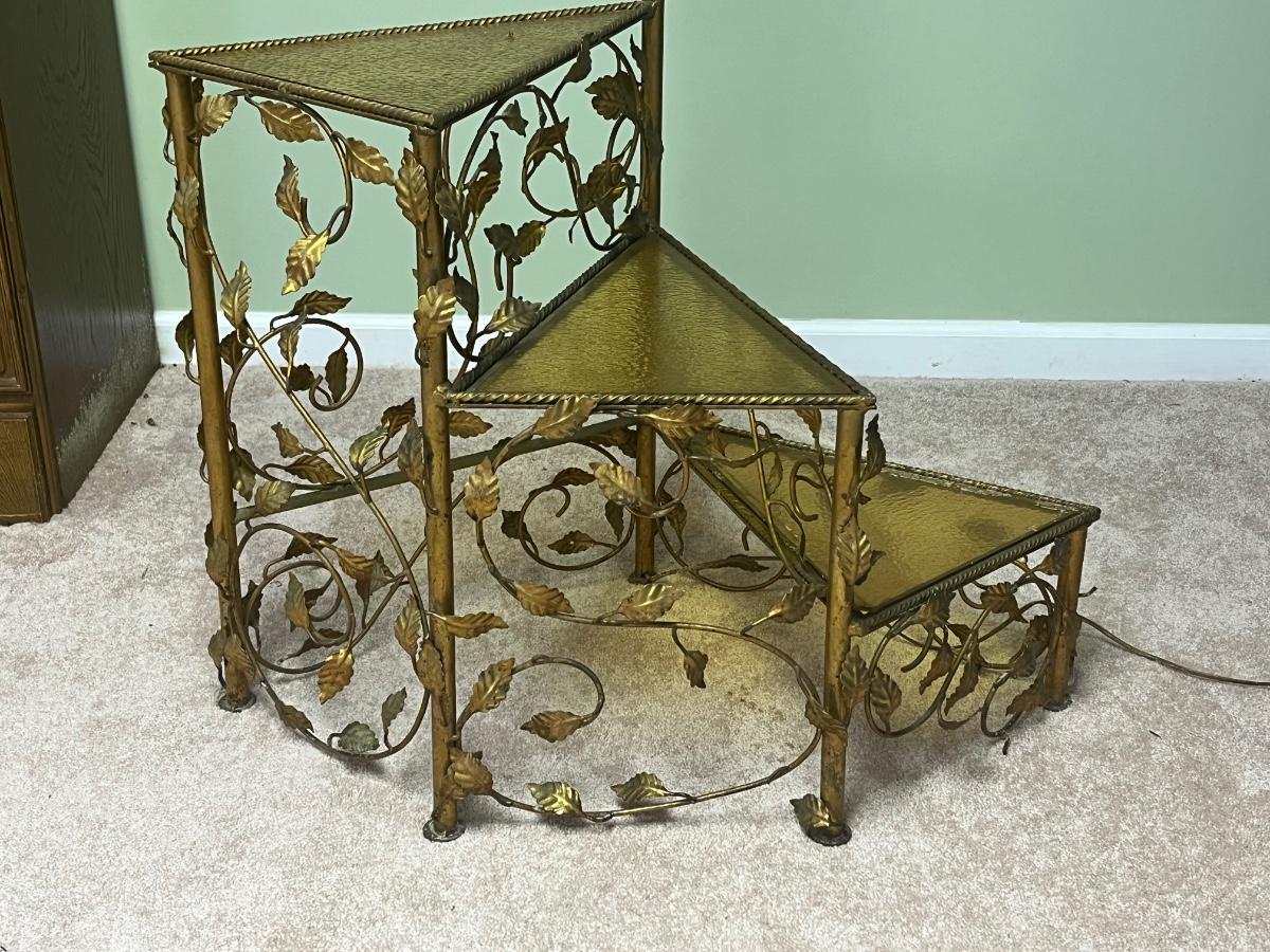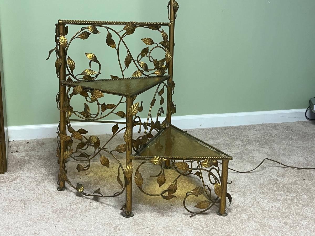 Vintage metal working floor lamp with spiral glass top table ( 19"x30"x64".) It is painted gold but could easily be painted.