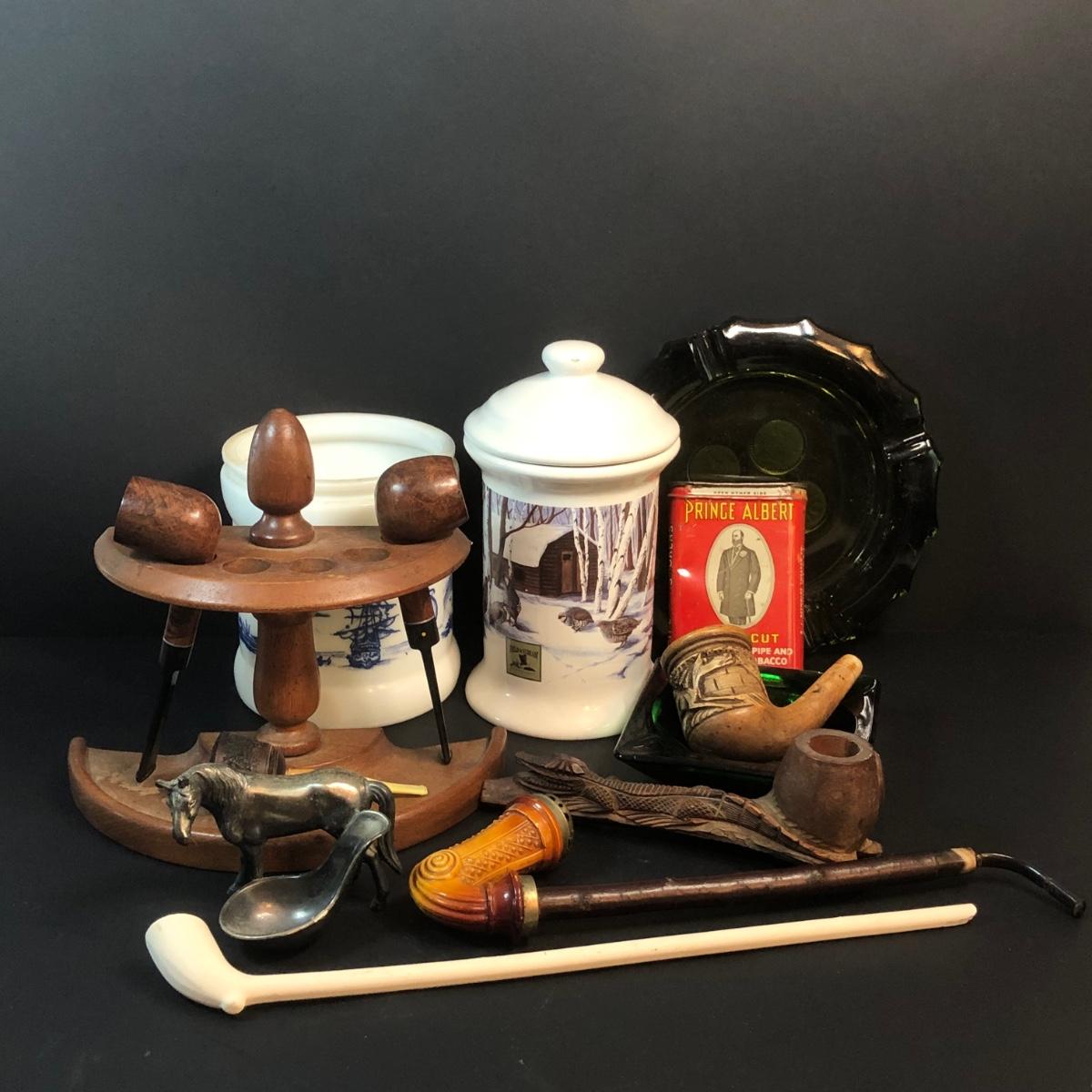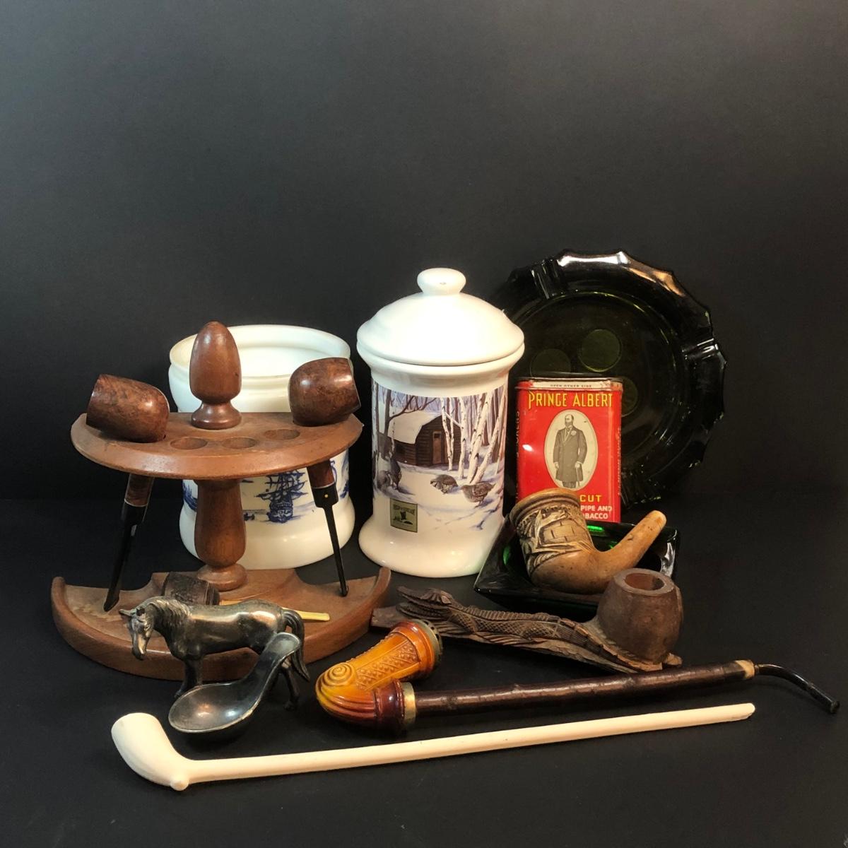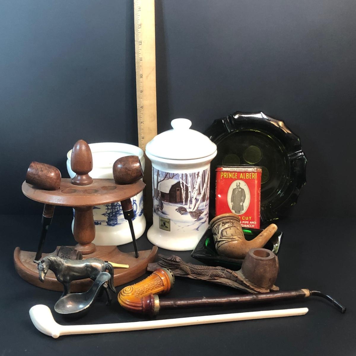 LOT 300M: Tobacco Collection - Pipes w/ Stand, Jars, Prince Albert Tin, Ash Trays