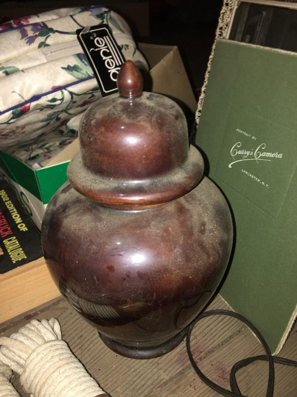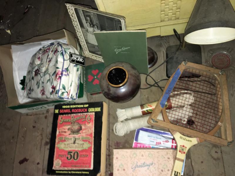 Schmitts garage ashtray, wilson tennis racket, urn, book, etc