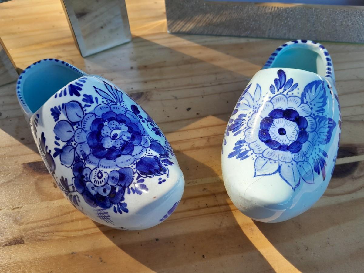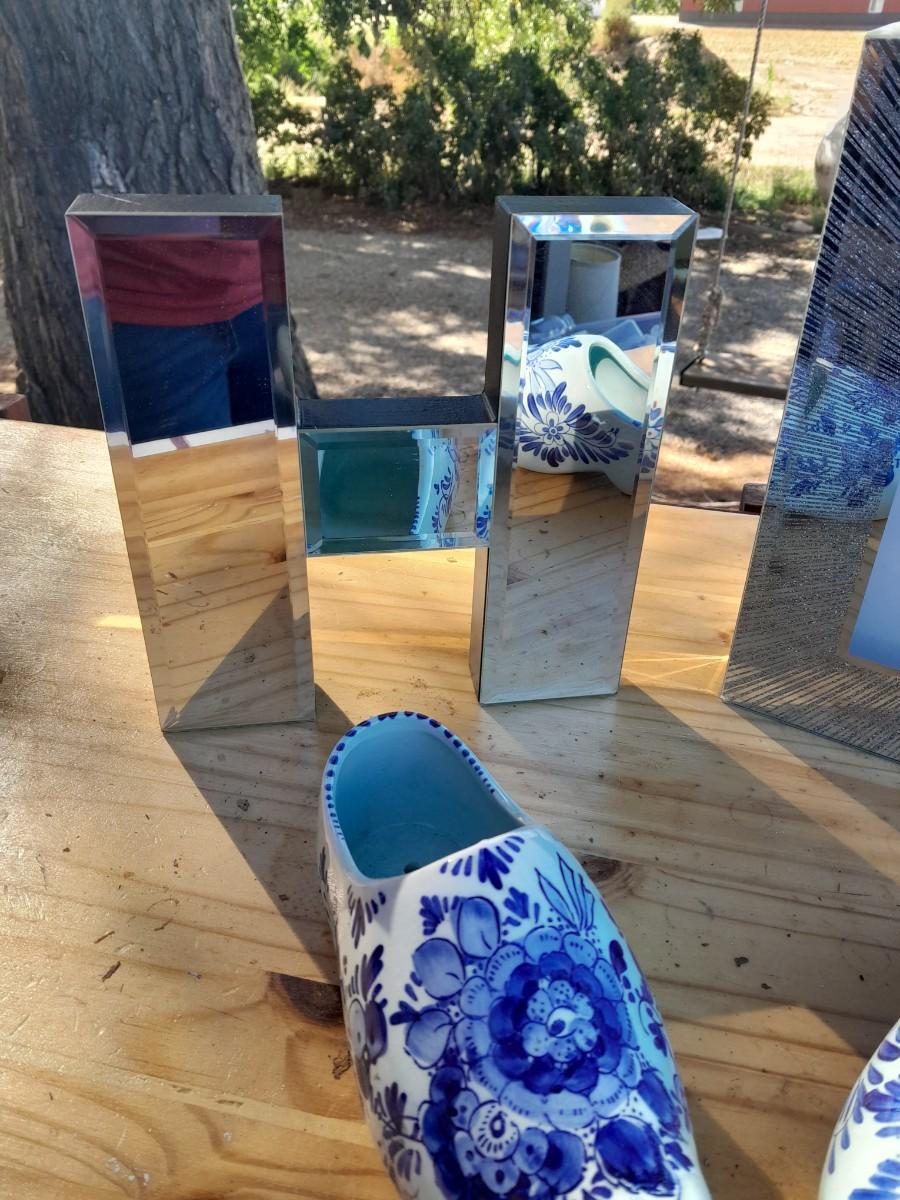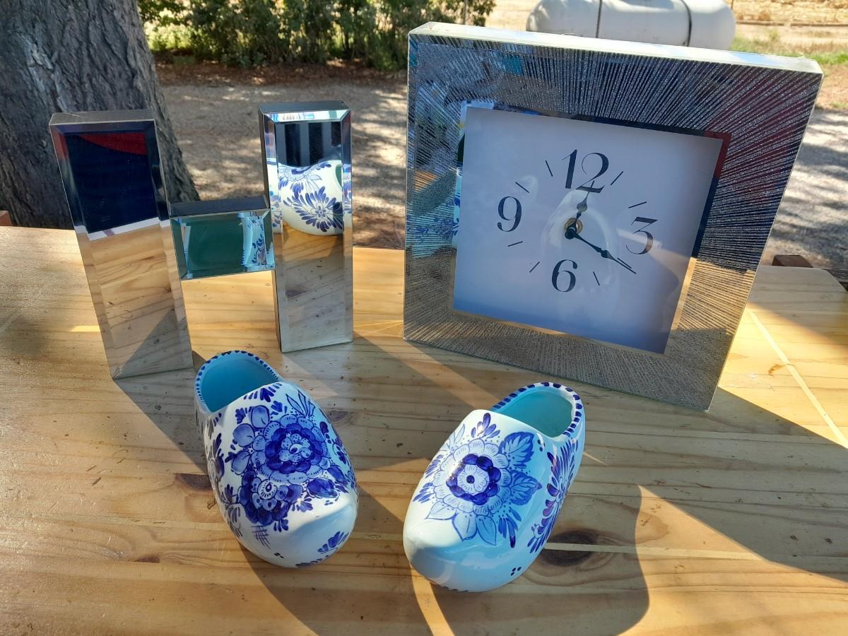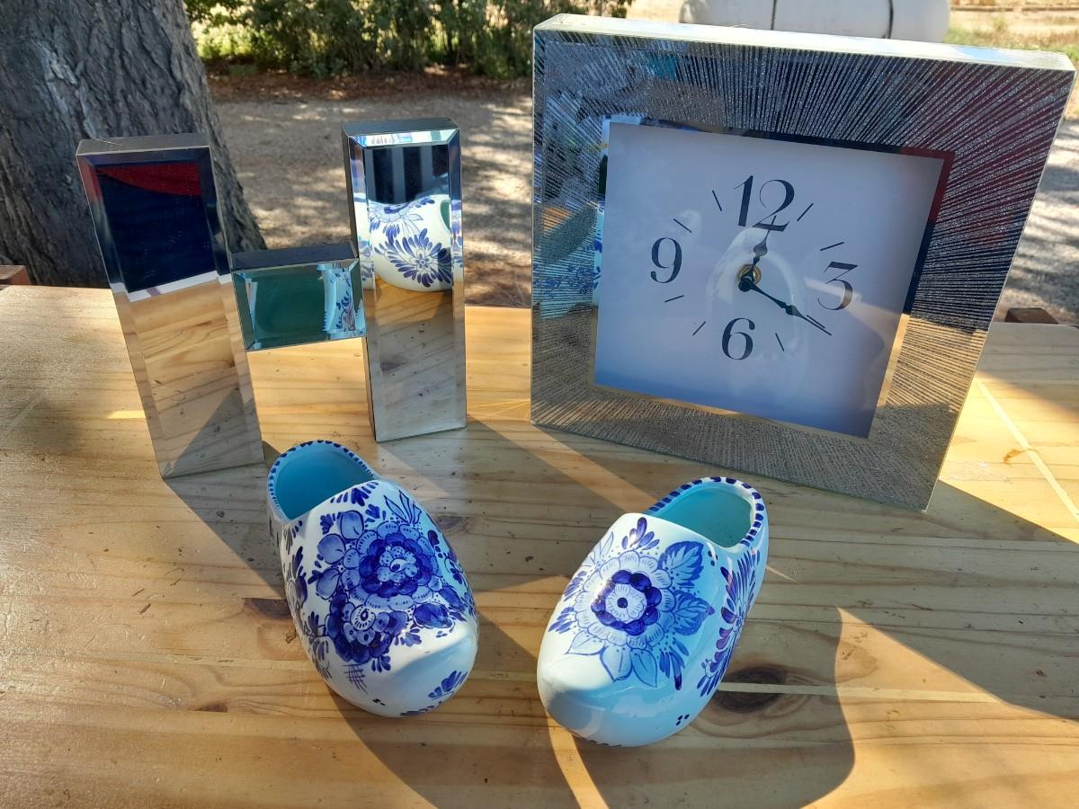 MIRRORED CLOCK, AND DELFT BLUE SHOES WITH THREE MIRRORED FREE STANDING BLOCKS