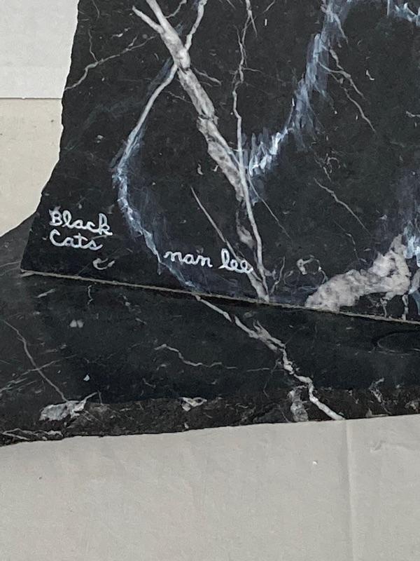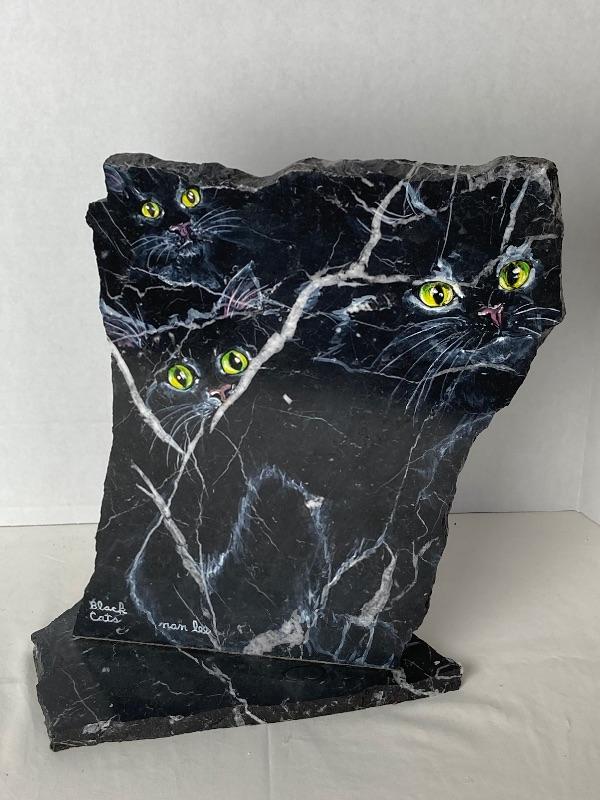 Nan Lee signed painting on stone “BlackCats” has attached base. Measures 16” tall 12” wide, base measures 13”x 10-1/4”. Very heavy piece