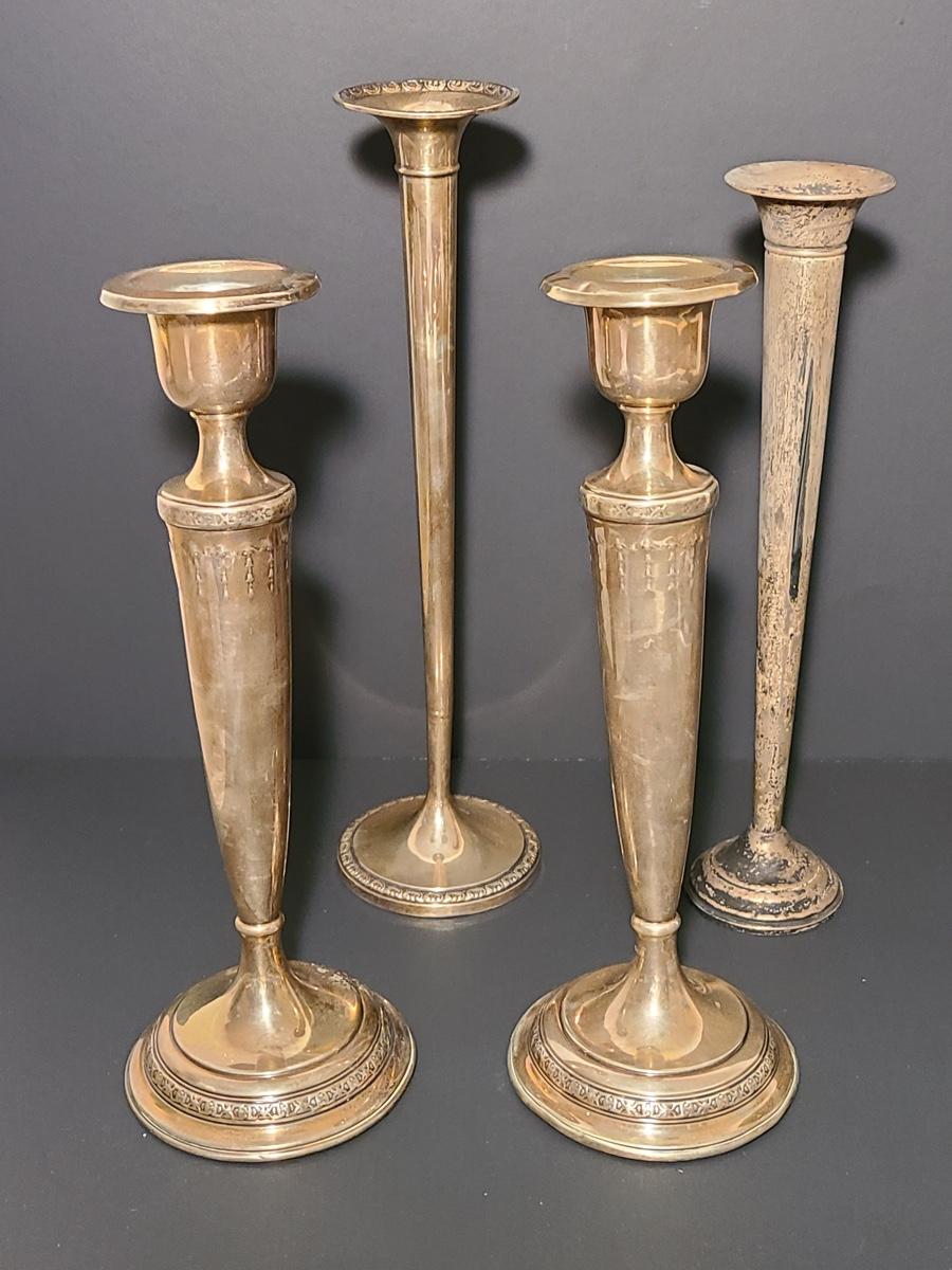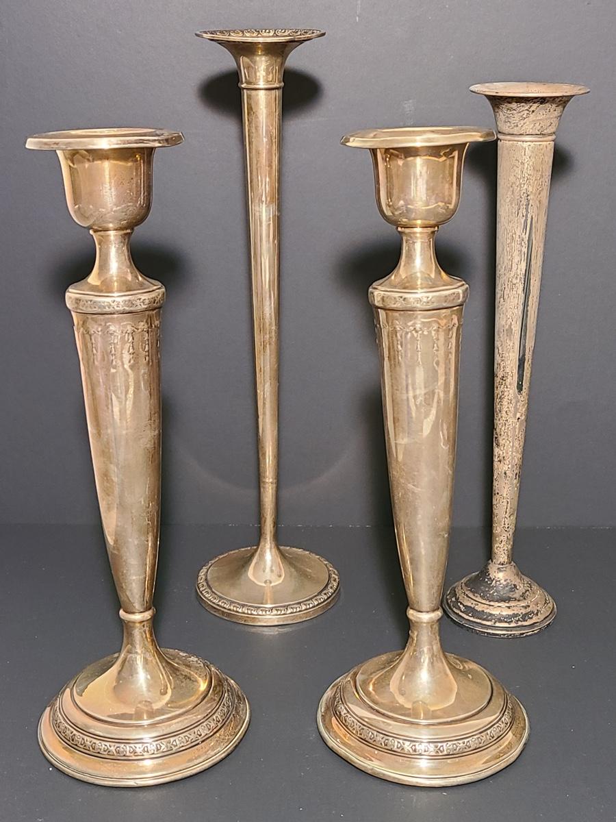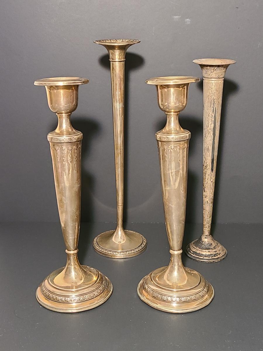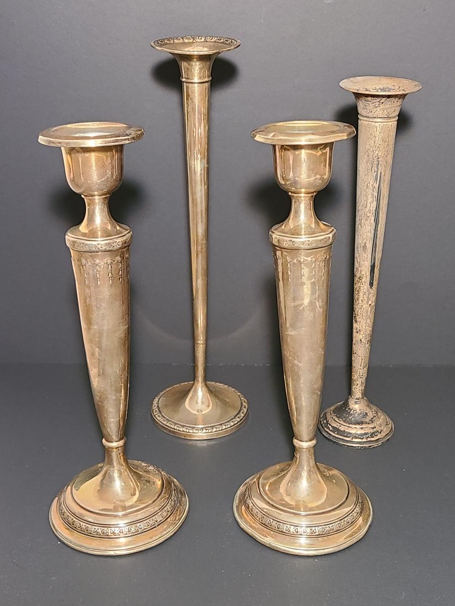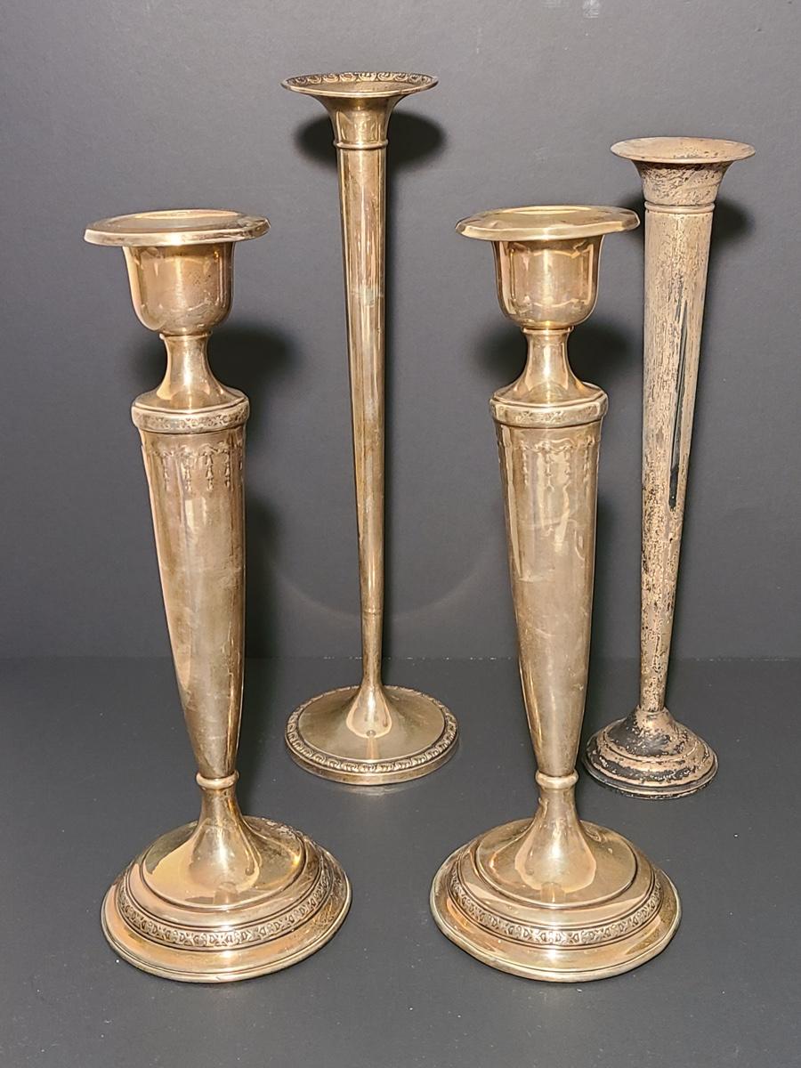 Lot 301: Sterling Candlestick Set and Two Sterling Trumpet Bud Vases ( 758 grams weighted bottoms)