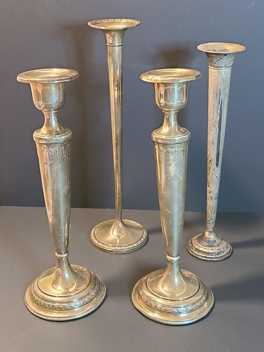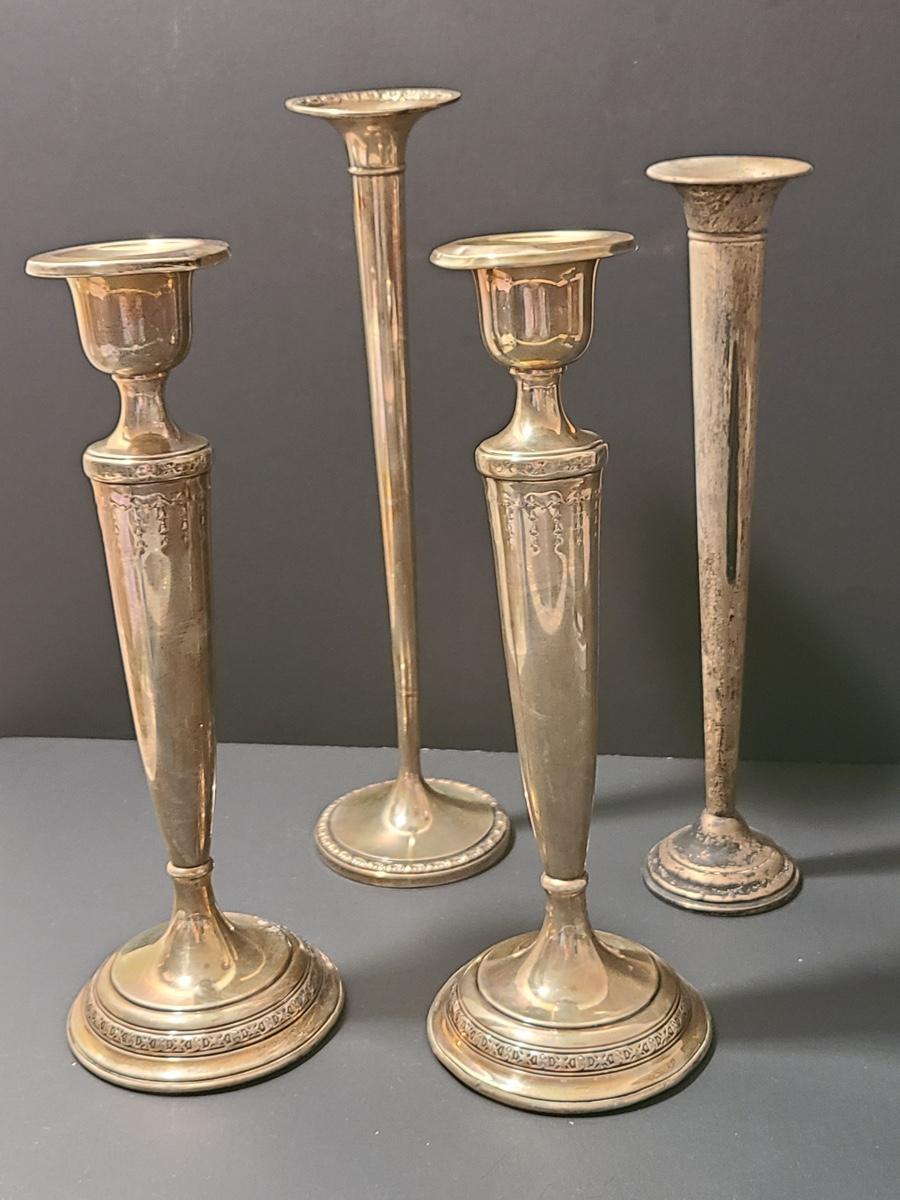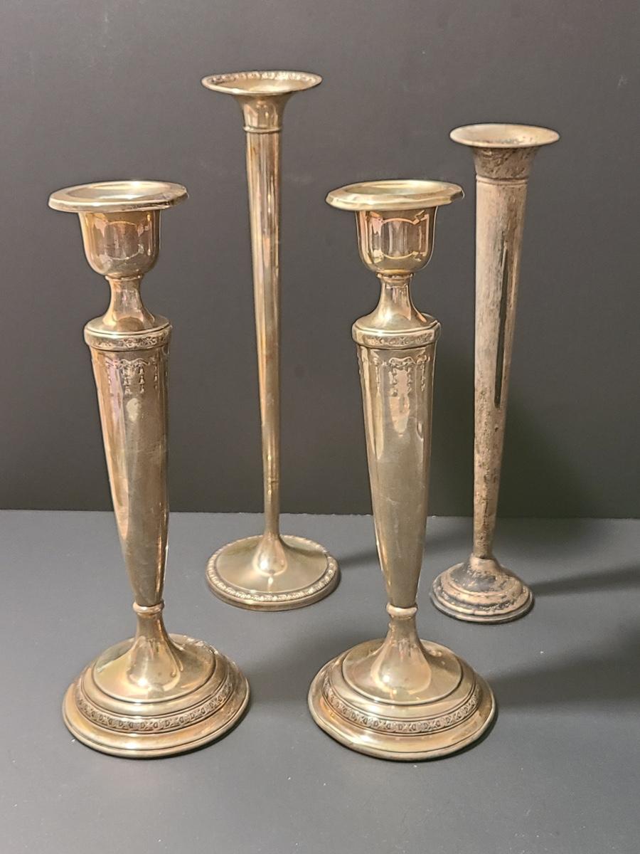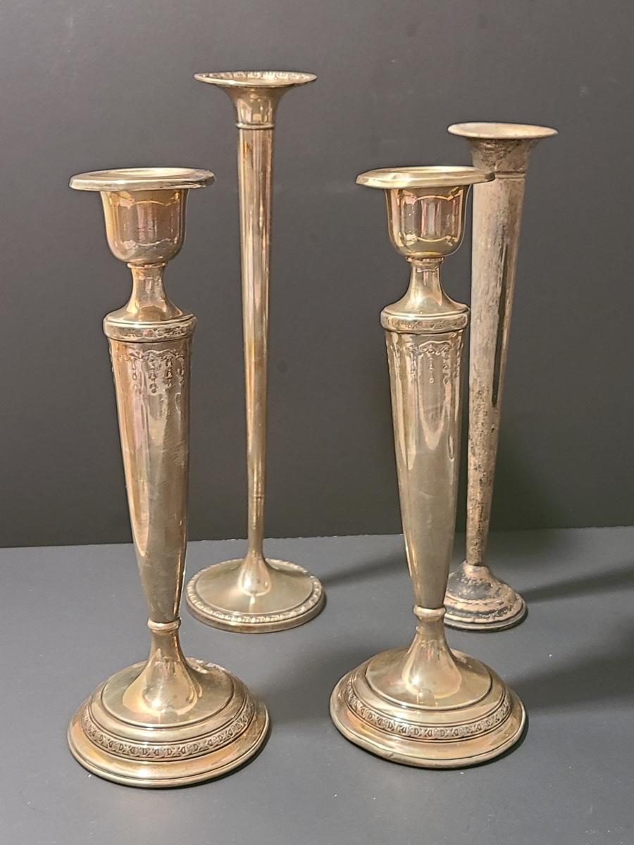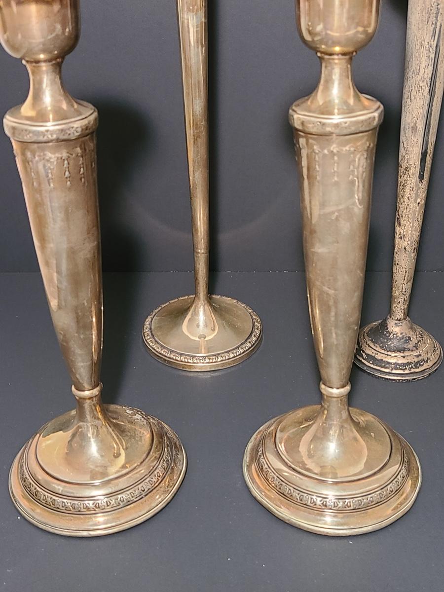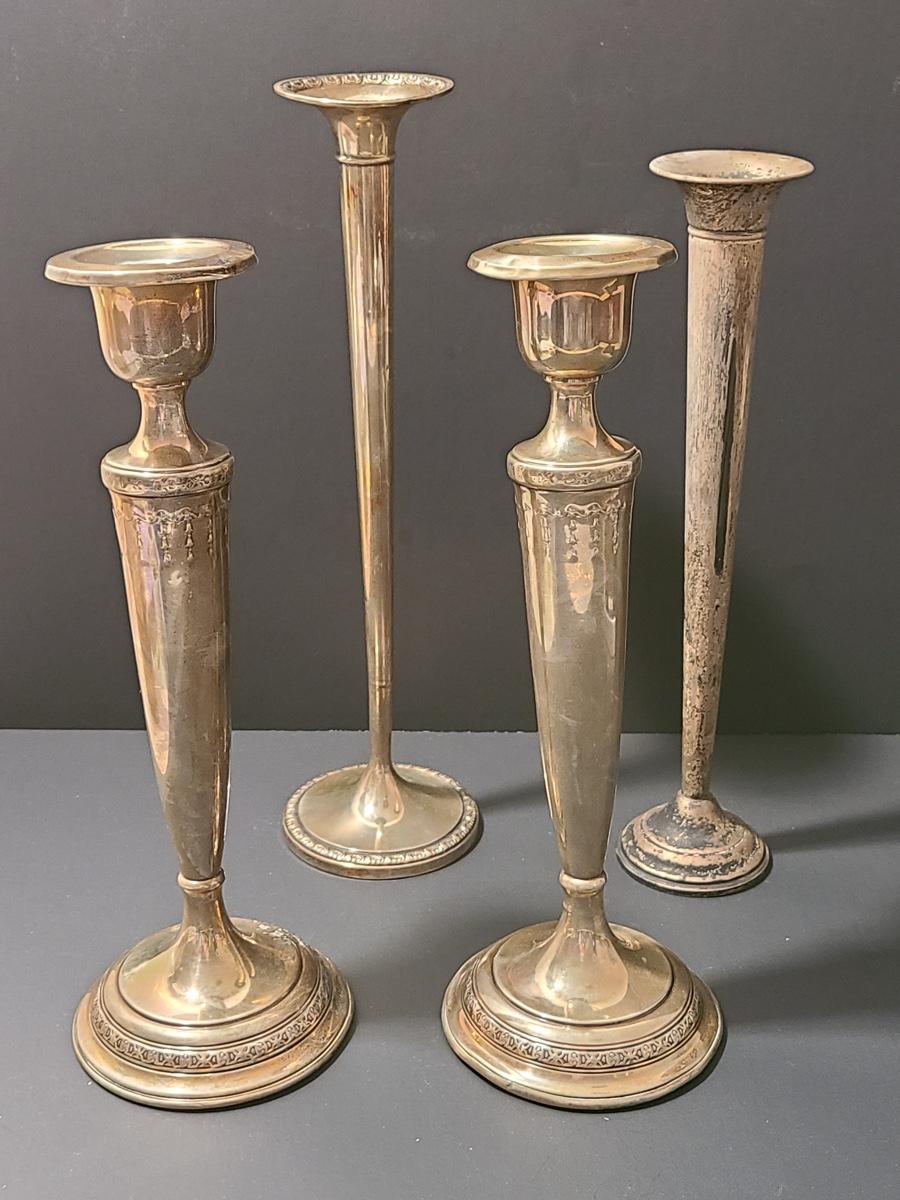Lot 301: Sterling Candlestick Set and Two Sterling Trumpet Bud Vases ( 758 grams weighted bottoms)