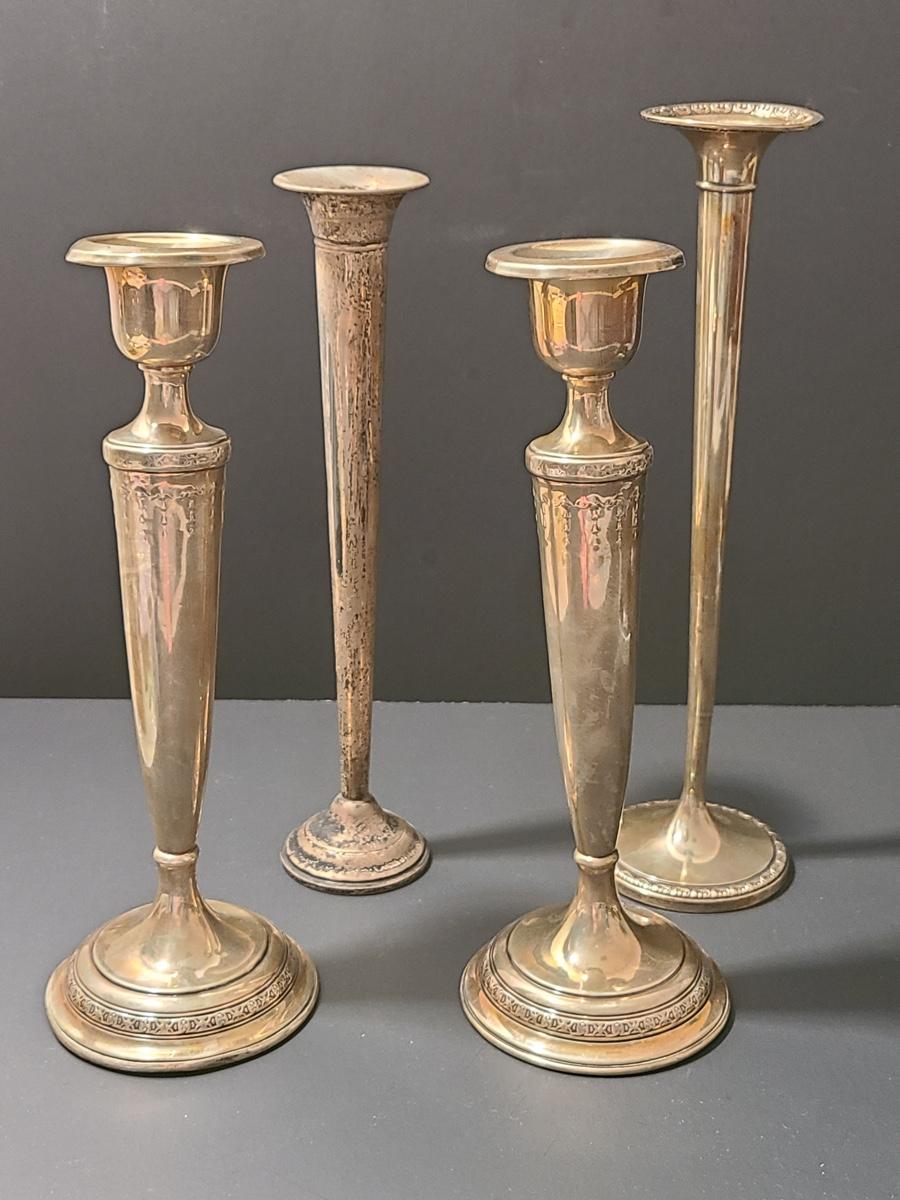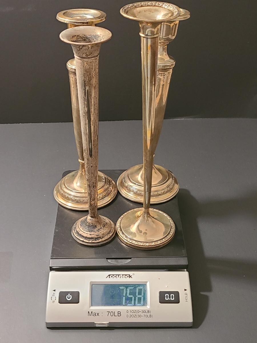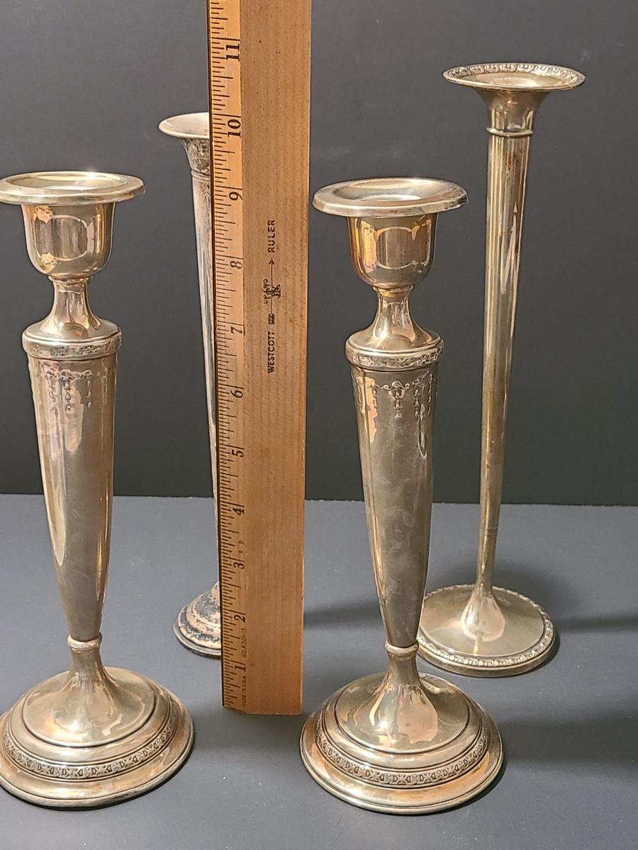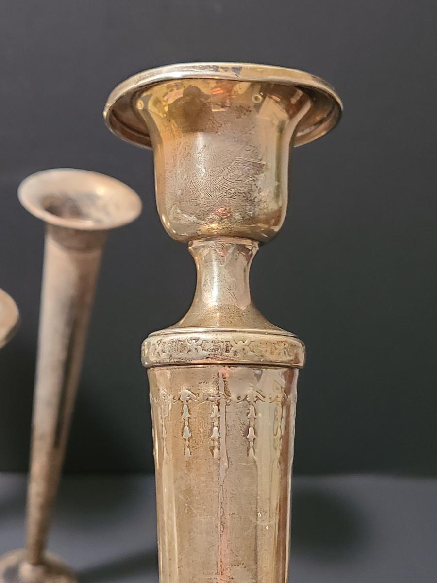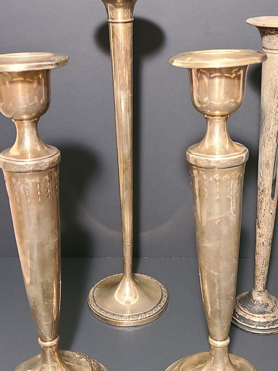 Lot 301: Sterling Candlestick Set and Two Sterling Trumpet Bud Vases ( 758 grams weighted bottoms)