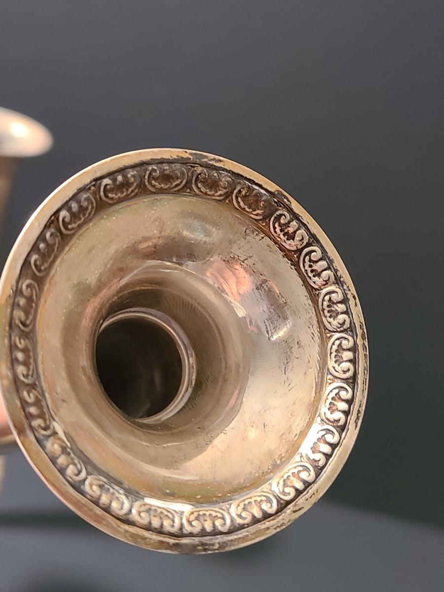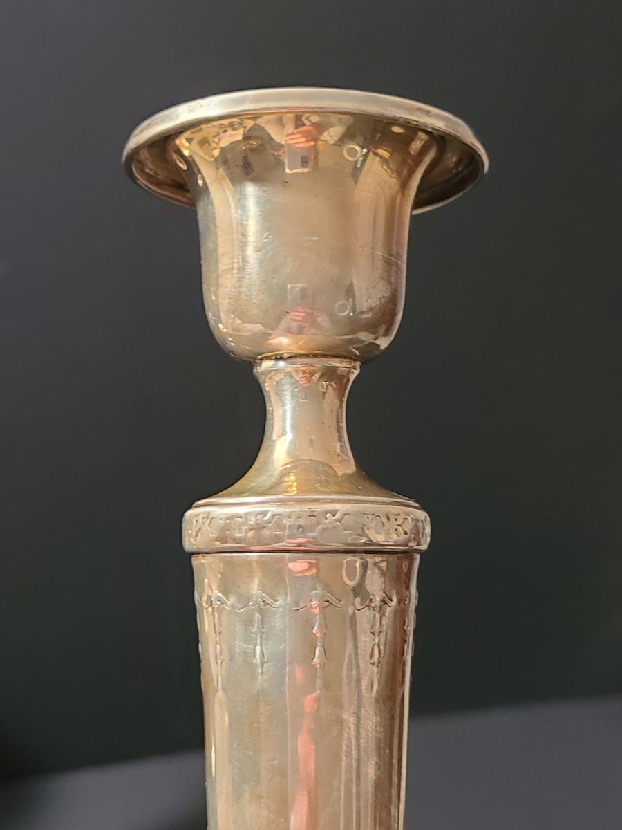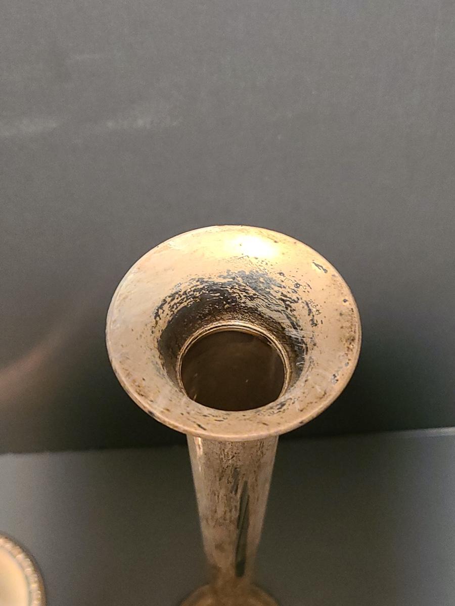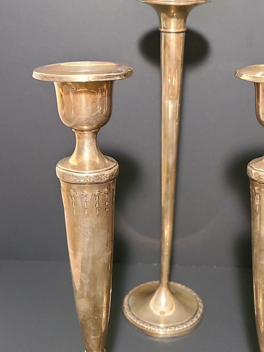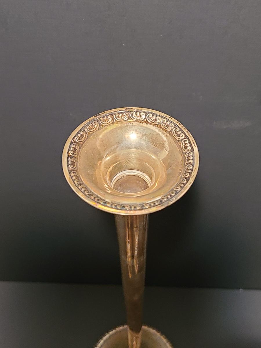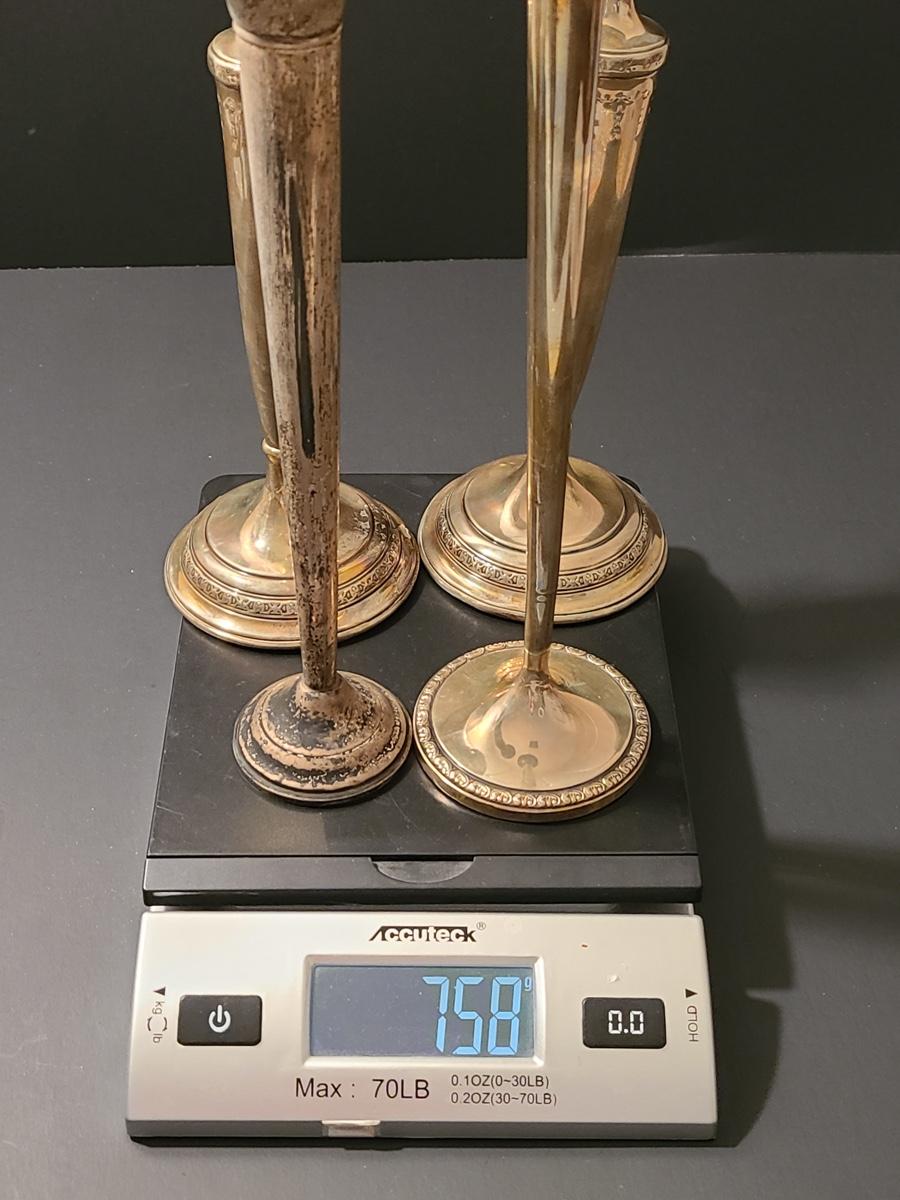 Lot 301: Sterling Candlestick Set and Two Sterling Trumpet Bud Vases ( 758 grams weighted bottoms)