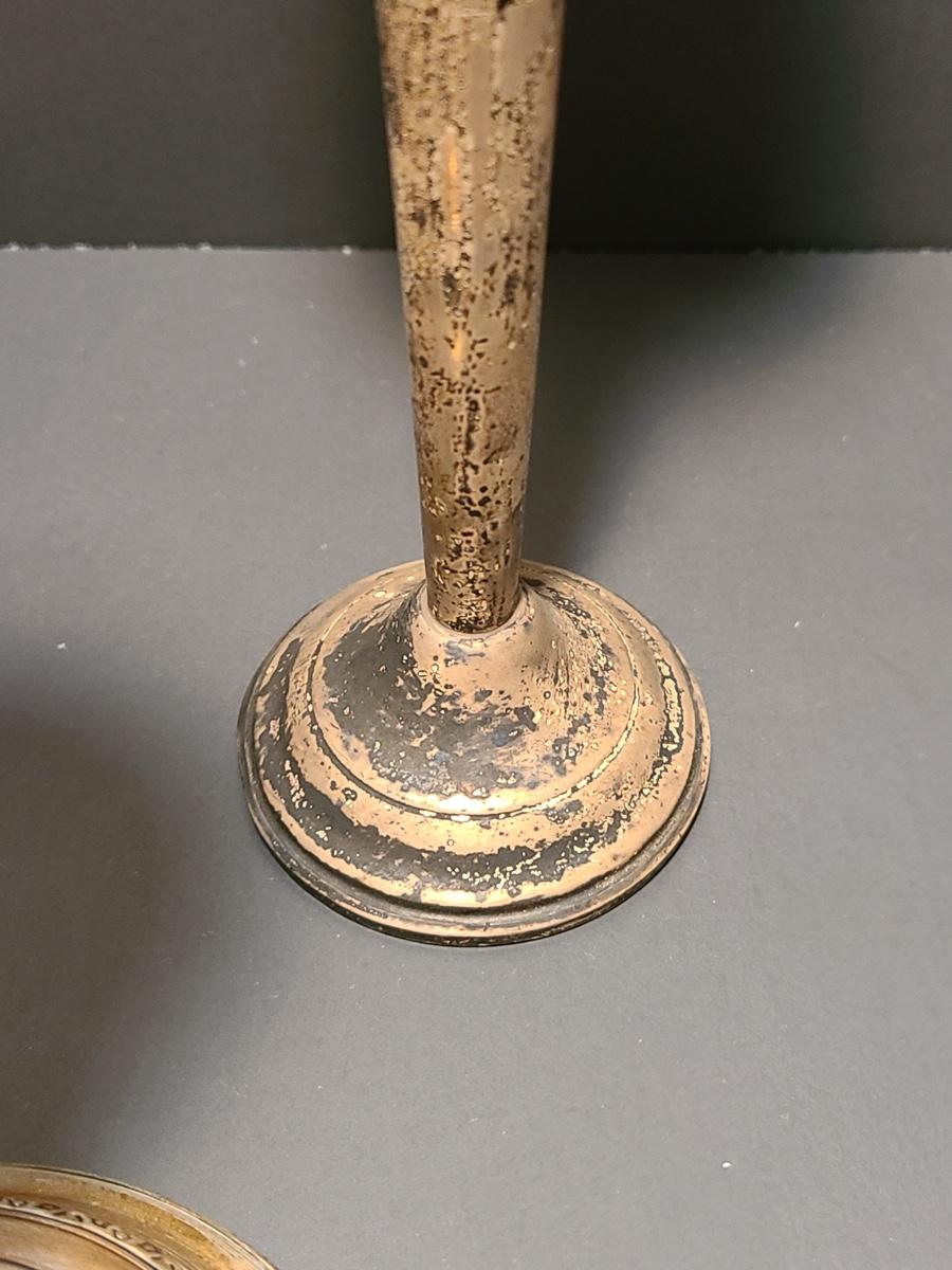 Mixed lot of sterling. The candlesticks are gorgeous and need to be cleaned. These are a little crooked and could use a straightening, this is due to age and storage. The two trumpet bud vases are different, and would look amazing cleaned! All are weighted bottoms. Please see all pictures as they are the best representation of the items. The pictures show condition, measurements if taken, and what is included in the lot. Due to the large amount that we photograph and the time frame, we are not always able to take measurements. All items unless noted, are pre-owned and have been used. If you purchased furniture, you must bring help. We do not allow one person to carry large furniture out on their own. Bring help, tools and a truck for the safety of our client’s homes, and your personal safety. Company policy. Thank you.
