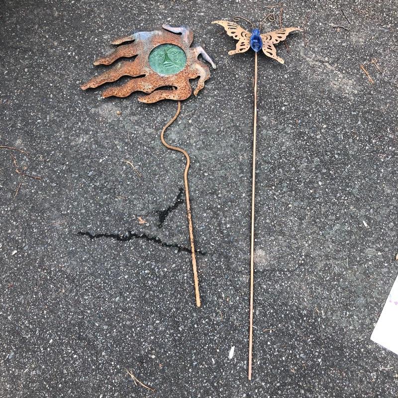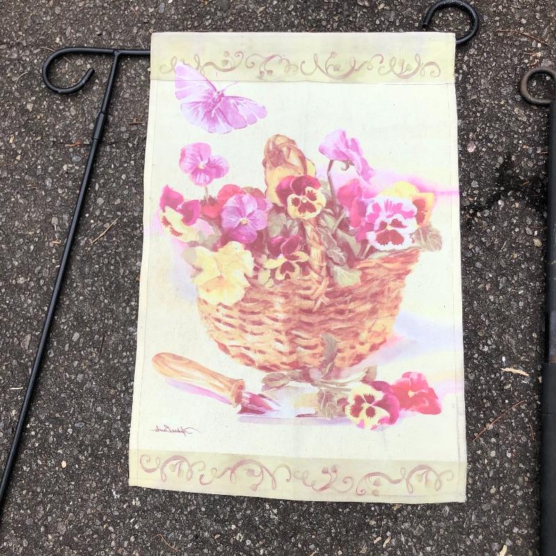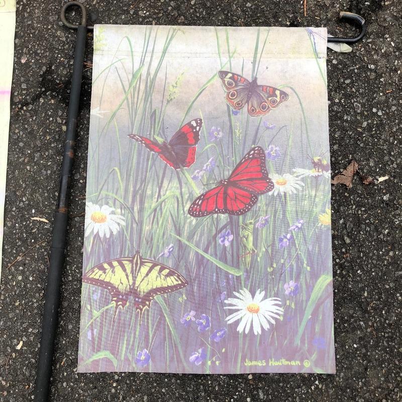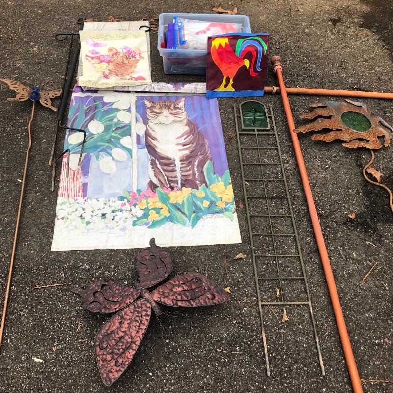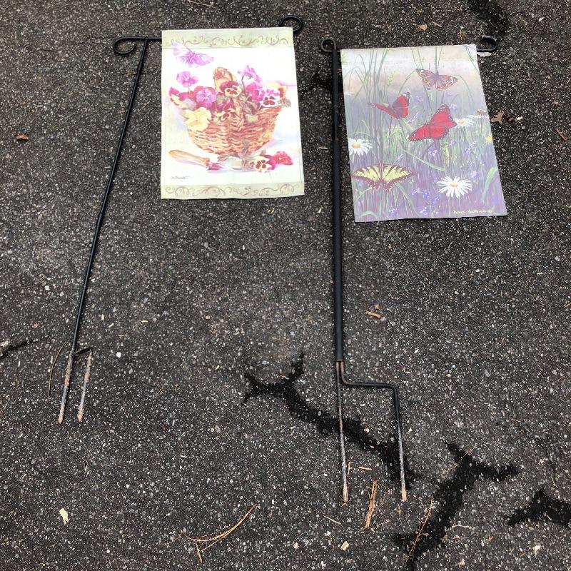 Cheer up yard with this great lot. There are a bunch of flags that include large and smaller flags and plenty of poles to hang them on that includes 2 long wood poles for the bigger flags and 2 metal poles for the smaller ones. Longer pole measures 51” long. Also included is a metal butterfly and 3 stakes; one has a sun, another a butterfly and the third a dragonfly.